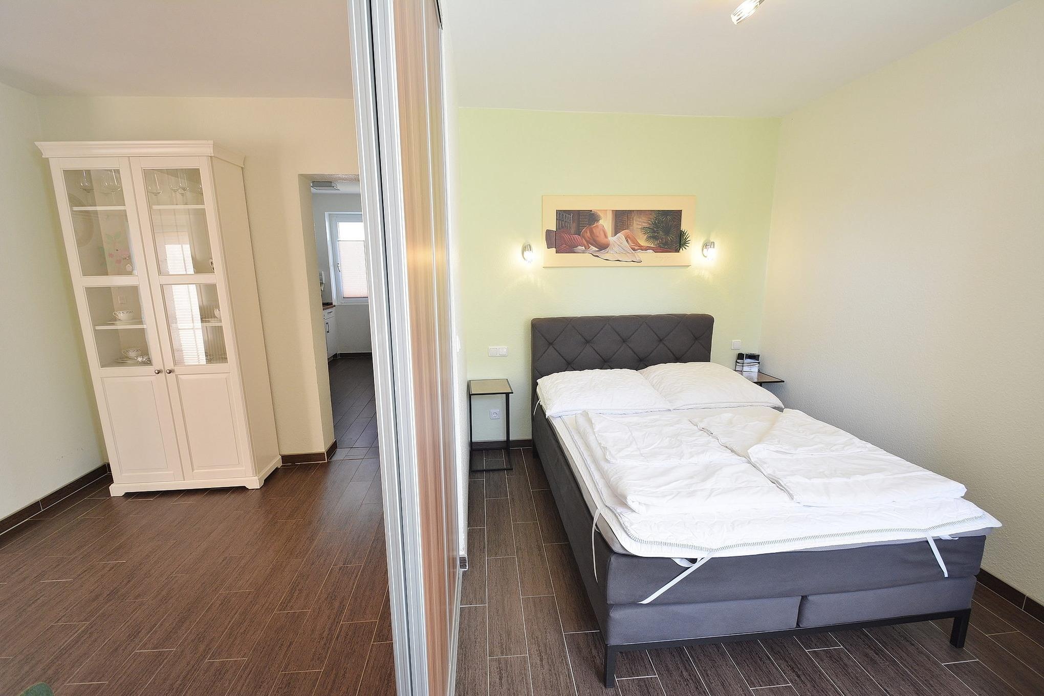 Modernes, großzügiges Wohn- und Esszimmer mit direktem Zugang zur Terrasse. Das geflieste Wohn- und Esszimmer ist mit einem Essplatz für 4 Personen, 2 Leder-Couchen, einem Couchtisch und einer Kommode ausgestattet. Zur Unterhaltung stehen ein Flachbildschirm und eine Mini-Stereoanlage zur Verfügung. Der moderne, geflieste Schlafbereich mit einem Boxspringbett (160x200cm) und einem Kleiderschrank ausgestattet, ist durch eine Vorhangsystem vom Wohnbereich getrennt. Das Fenster lässt sich durch ein Innenrollo etwas verdunkeln.
