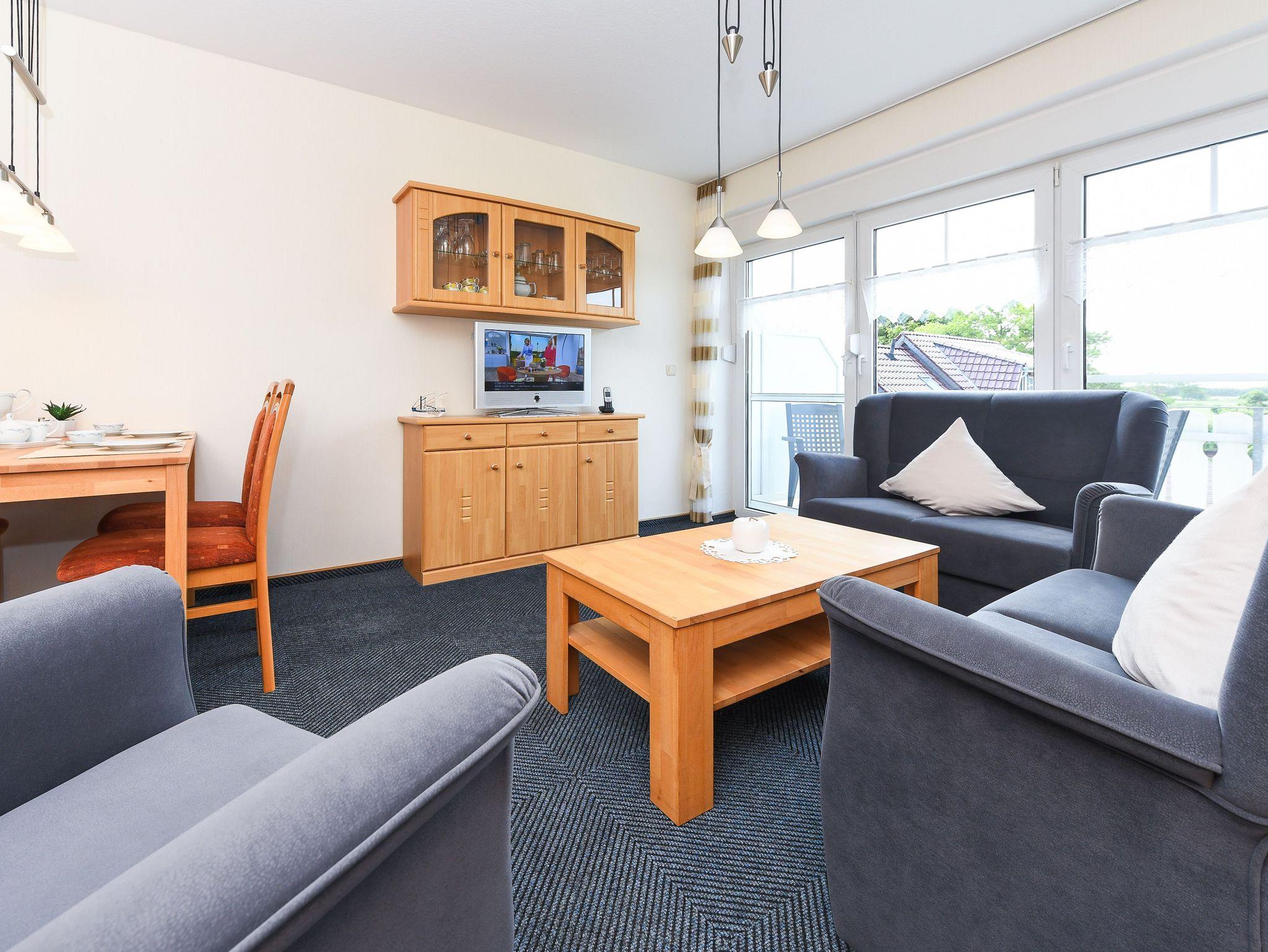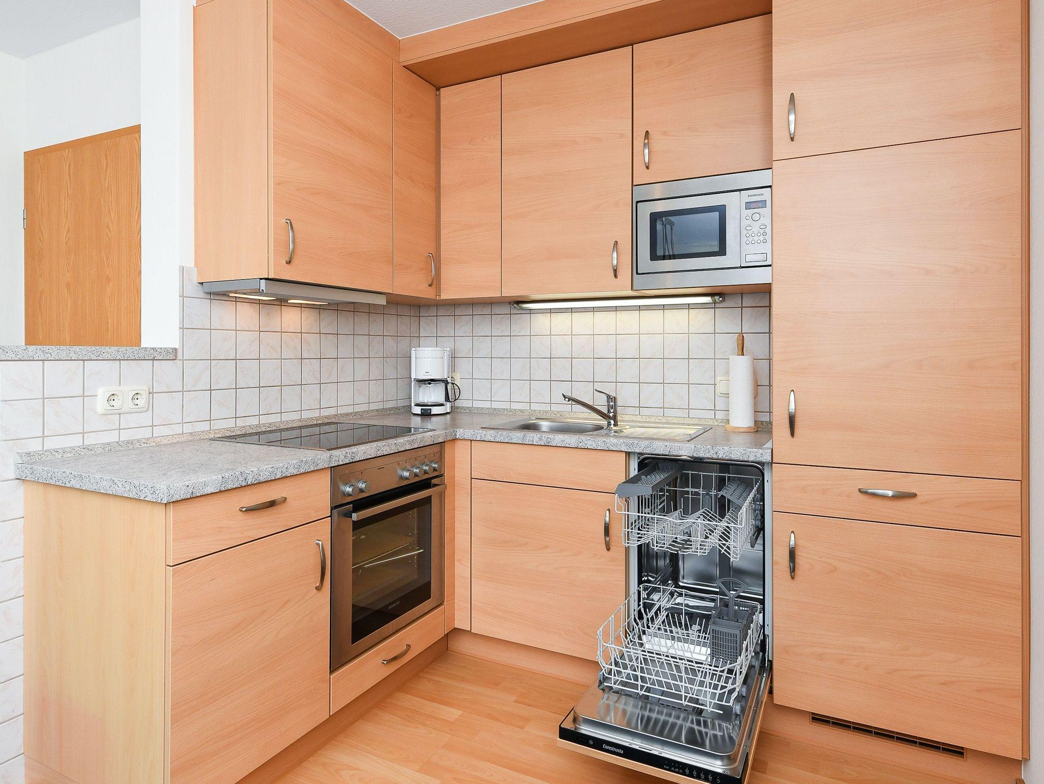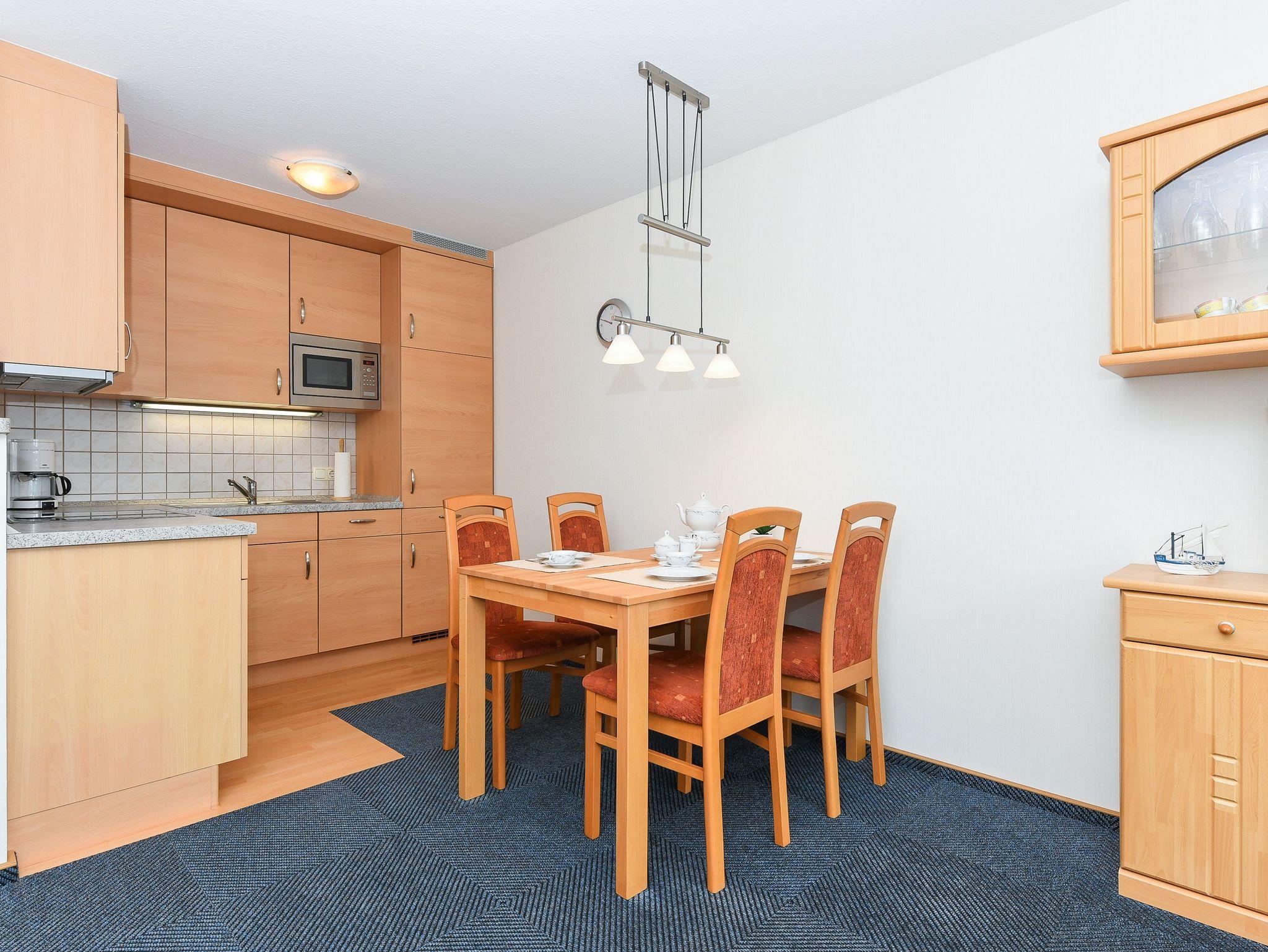Größe ca. 60 Quadratmeter, Wohnraum mit integrierter Küche, Schlafzimmer, zweites separates Schlafzimmer/Kinderzimmer, Badezimmer mit Dusche, Waschtisch und WC, Obergeschoss, Balkon, Koffer-/Abstellraum, optimal für 2 bis 3 Personen.