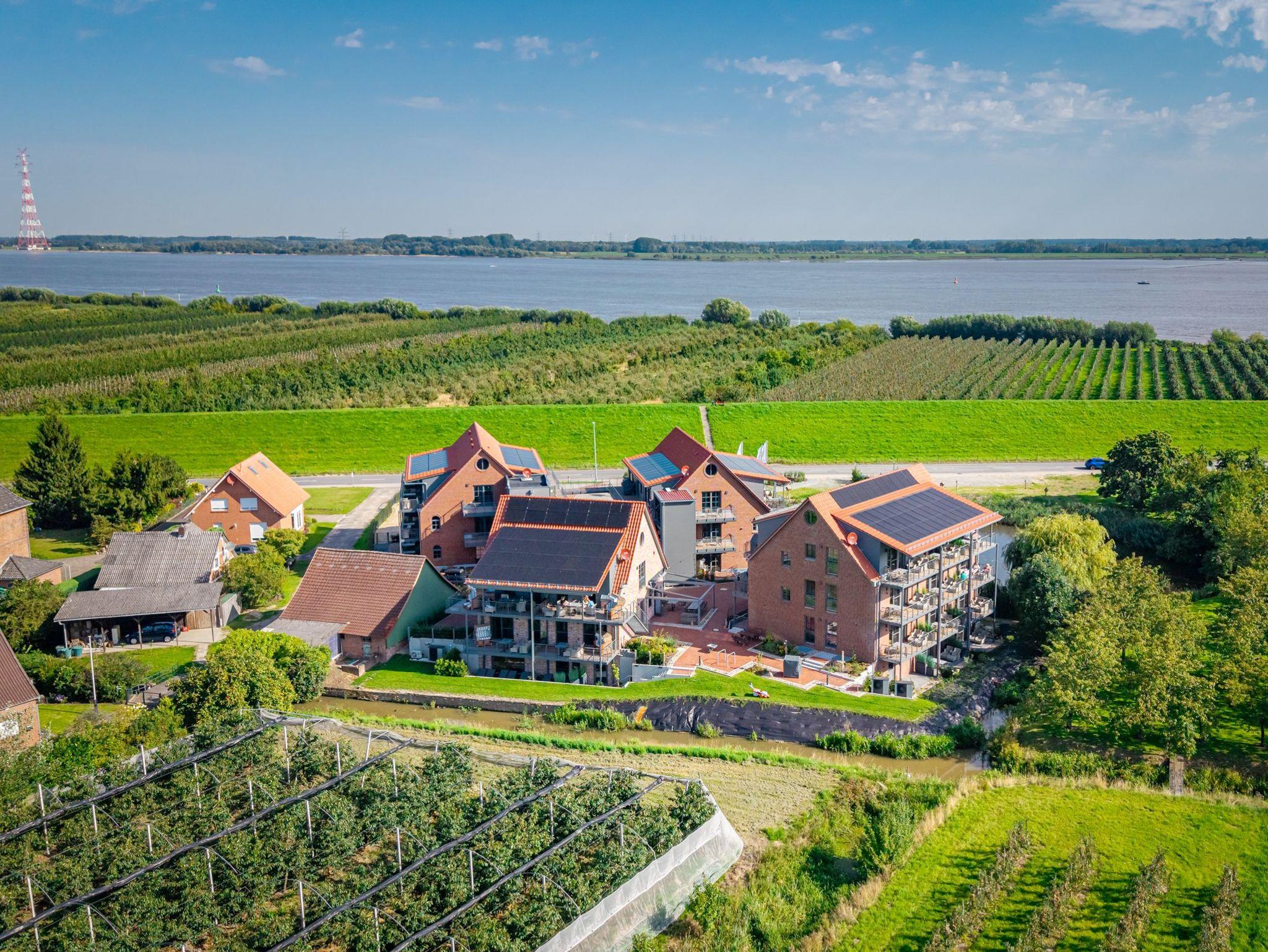 Willkommen in der Ferienresidenz Elbufer Altes Land. Ihr perfektes Ziel für Erholung und Entspannung direkt an der Elbe! Genießen Sie moderne Ferienwohnungen inmitten der traumhaften Obstplantagen des Alten Landes, unweit von Hamburg. Unsere Residenz bietet Ihnen komfortable, barrierefreie Wohnungen mit Elbblick, einen schönen Saunabereich und direkter Nähe zu zahlreichen Ausflugszielen.