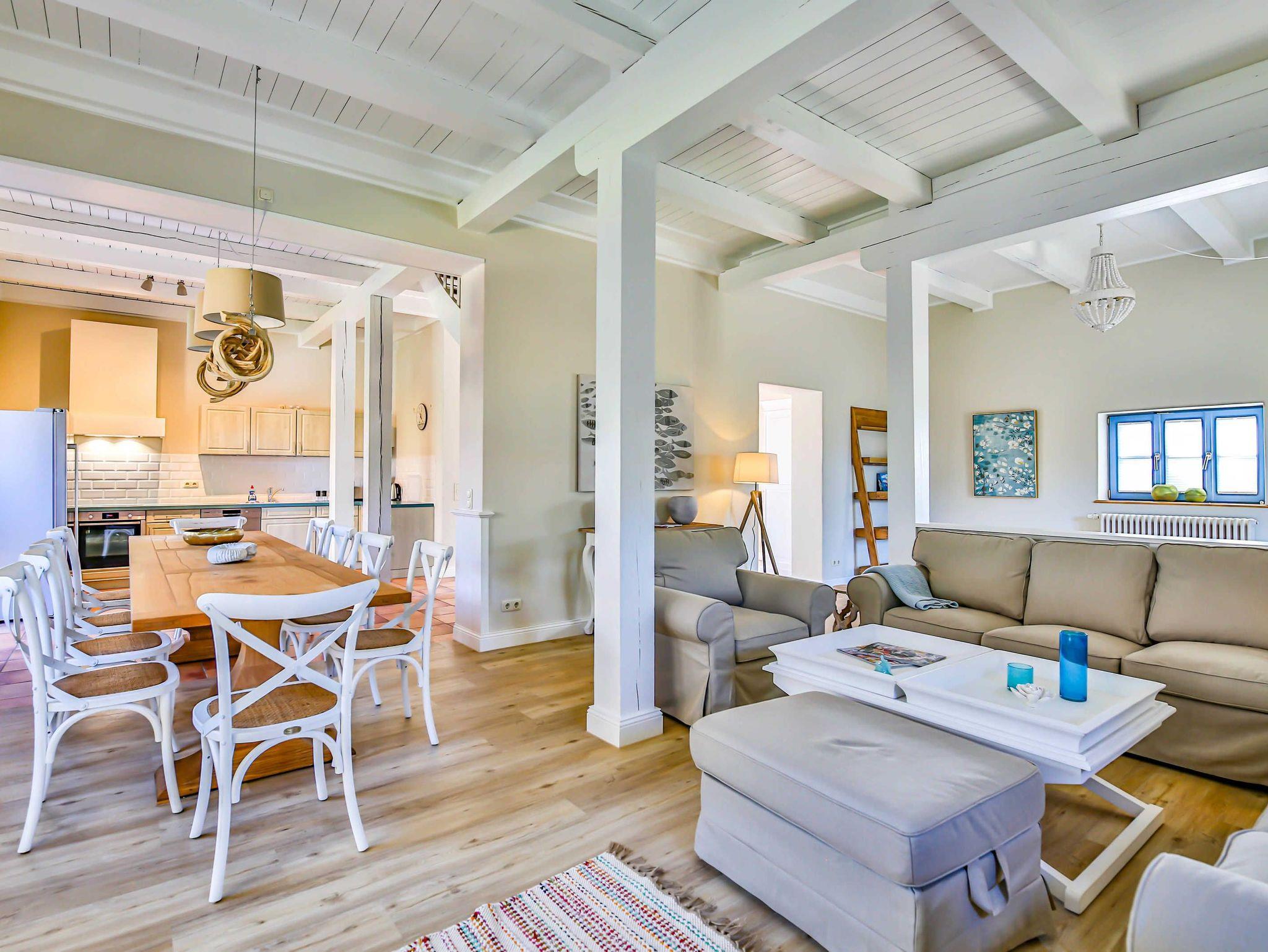 Das Ferienhaus Blaukehlchen im Sonnenhof ist ein 5-Sterne Ferienhaus mit viel Liebe zum Detail. Das Haus bietet 5 Schlafzimmer, wovon eines über einen barrierefreien Zugang mit separater Teeküche und Bad en Suite verfügt. Eine große voll ausgestattete Wohnküche, 3 Bäder und eine große Sonnenterrasse im anliegenden Garten. Das Haus befindet sich umgeben von Natur und direkt am Achterwasser. Zu empfehlen für Urlaub mit der Familie oder Freunden mit bis zu 10 Personen.