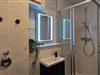 Das Badezimmer ist mit einer Dusche, Waschmaschine und Fön ausgestattet.