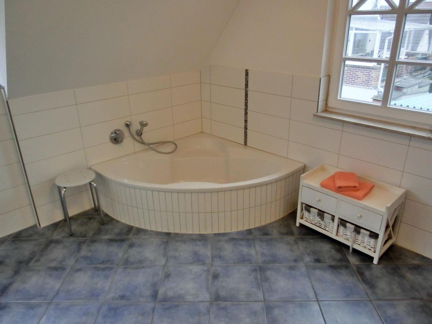 - 1 großes Badezimmer mit Doppelwaschtisch, Eckbadewanne und Dusche