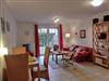 Das Wohnzimmer ist hell und einladend gestaltet und lädt zum Entspannen ein, sei es mit einem guten Buch oder beim gemütlichen Fernsehen über den vorhandenen TV. Das Sofa kann im Handumdrehen zu einem weiteren Schlafplatz umgebaut werden. Vom Wohnzimmer aus gelangen Sie durch die großen Fenster auf die Terrasse, die an warmen Tagen zum Verweilen an der frischen Luft einlädt.