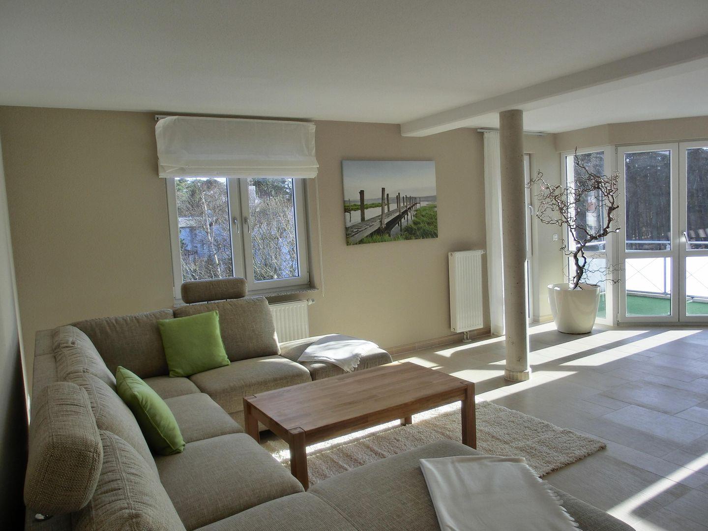 - Wohnbereich mit gemütlichem Sofa, Farb-TV, Blue-Ray Player, Radio