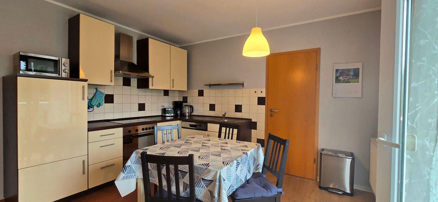 Eine hochwertige Einbauküche mit Essplatz schließt sich dem Wohnbereich an. Diese verfügt u.a. über Spülmaschine, Kühlschrank mit TK-Fach, Kaffeemaschine, Toaster, Eierkocher, Wasserkocher, Geschirr, Besteck etc ist in ausreichender Menge vorhanden.