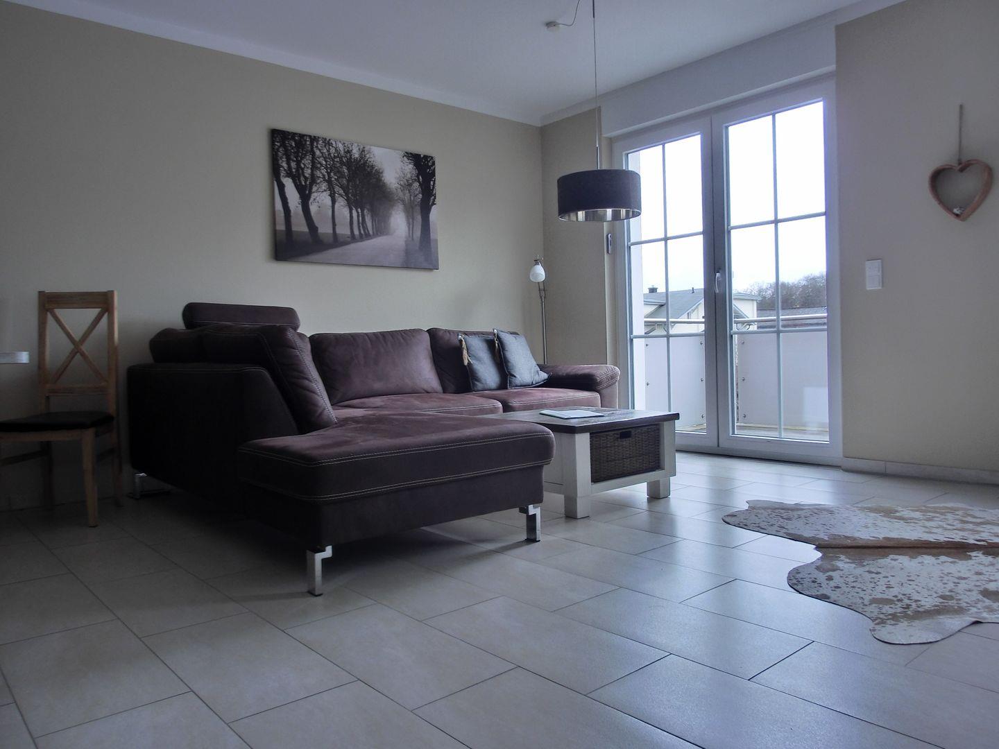 Genießen Sie den großen modernen eingerichteten Wohnbereich mit Balkon, Eckledercouch, 50 Zoll Flat TV sowie Stereoanlage mit USB und iPod Anschluss.