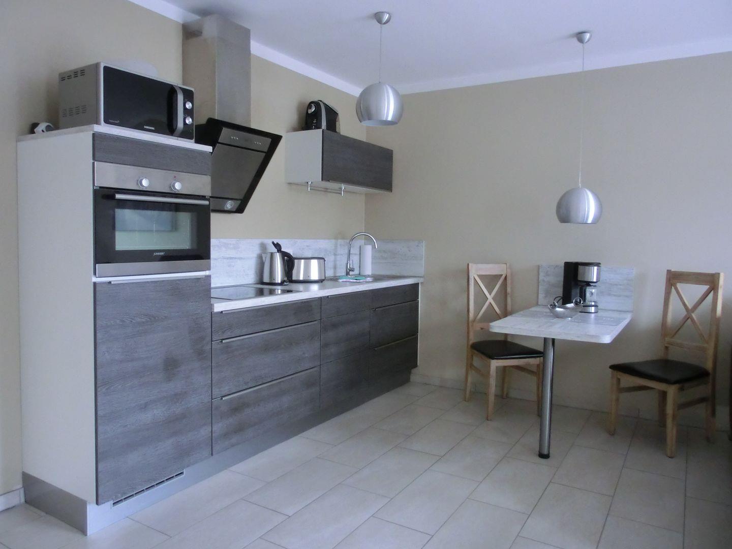 Die offene, gut ausgestattete Küche ist mit Geschirrspülmaschine, Herd, Cerankochfeld, Backofen, Mikrowelle, Kühlschrank mit kleinen Gefrierteil, Kaffeemaschine, Wasserkocher, Toaster, Besteck und Töpfe von WMF ausgestattet.
