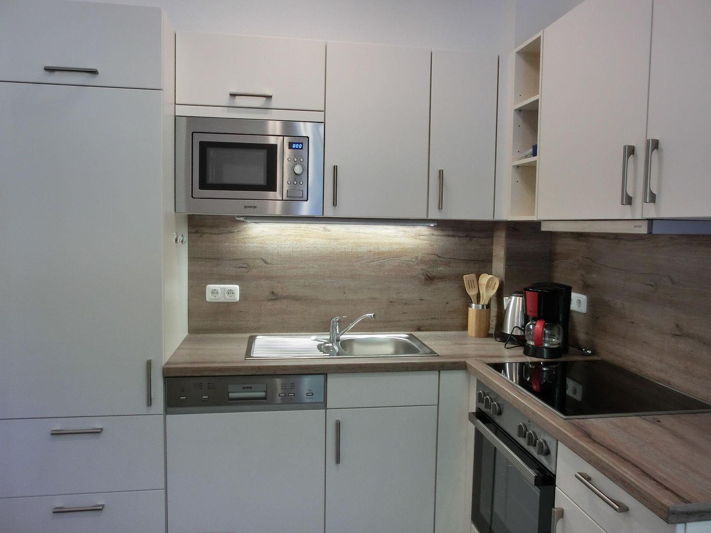 - halboffene Einbauküche inkl. Geschirrspüler, Herd, Backofen, Mikrowelle, Kaffeemaschine, Toaster, Kühlschrank mit Gefrierteil, Wasserkocher, Besteck und Gläser sind ausreichend vorhanden