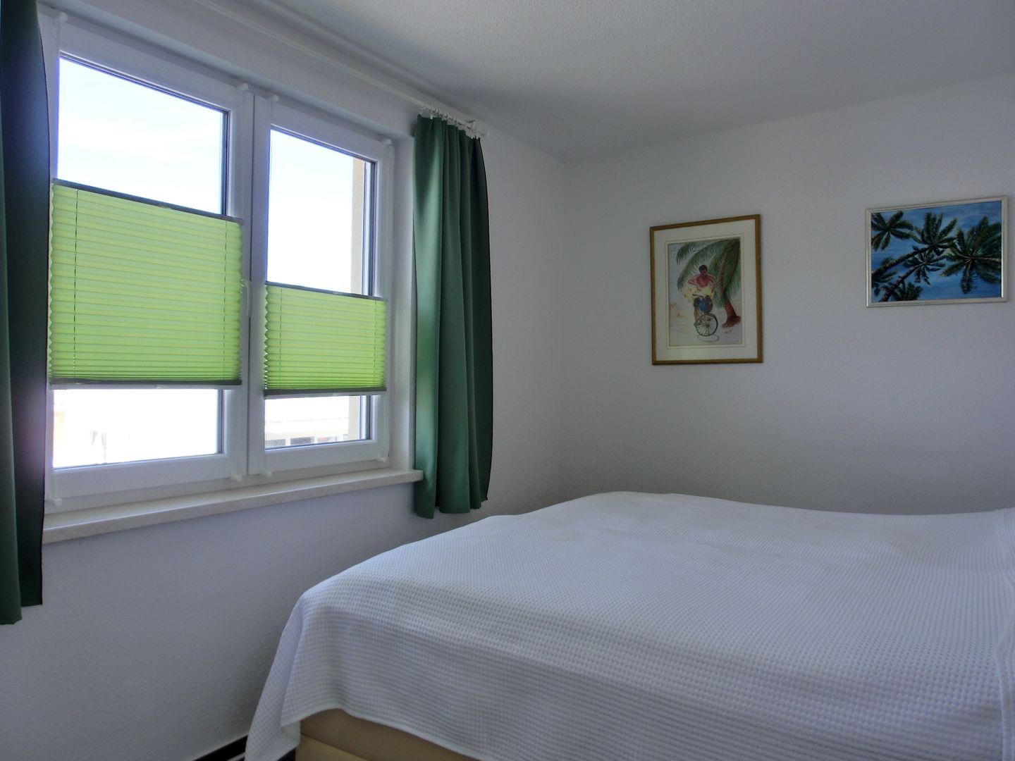 - 1 Schlafzimmer mit Doppelbett für 2 Personen (180 cm x 200 cm), Kleiderschrank, Nachttische mit Bettlampen