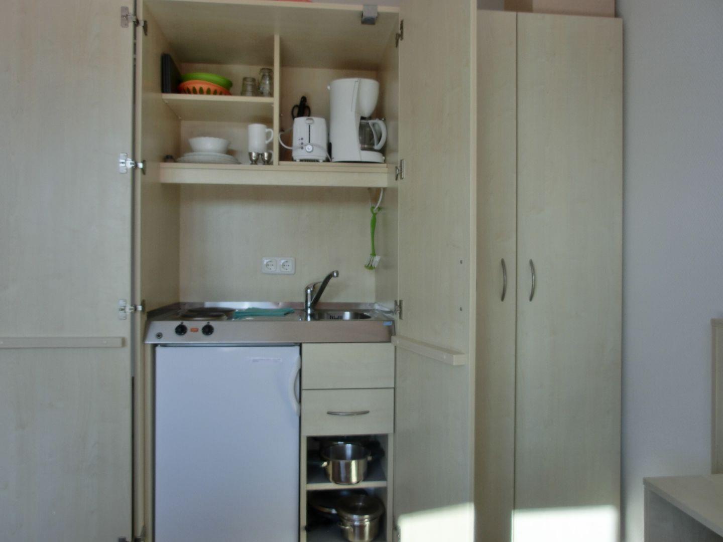 - eine Pantry-Küche inkl. 2-Plattenkochfeld, Kühlschrank mit Gefrierteil, Kaffeemaschine, Toaster und Wasserkocher, Geschirr und Besteck, Töpfe, Tassen und Teller sind ausreichend vorhanden