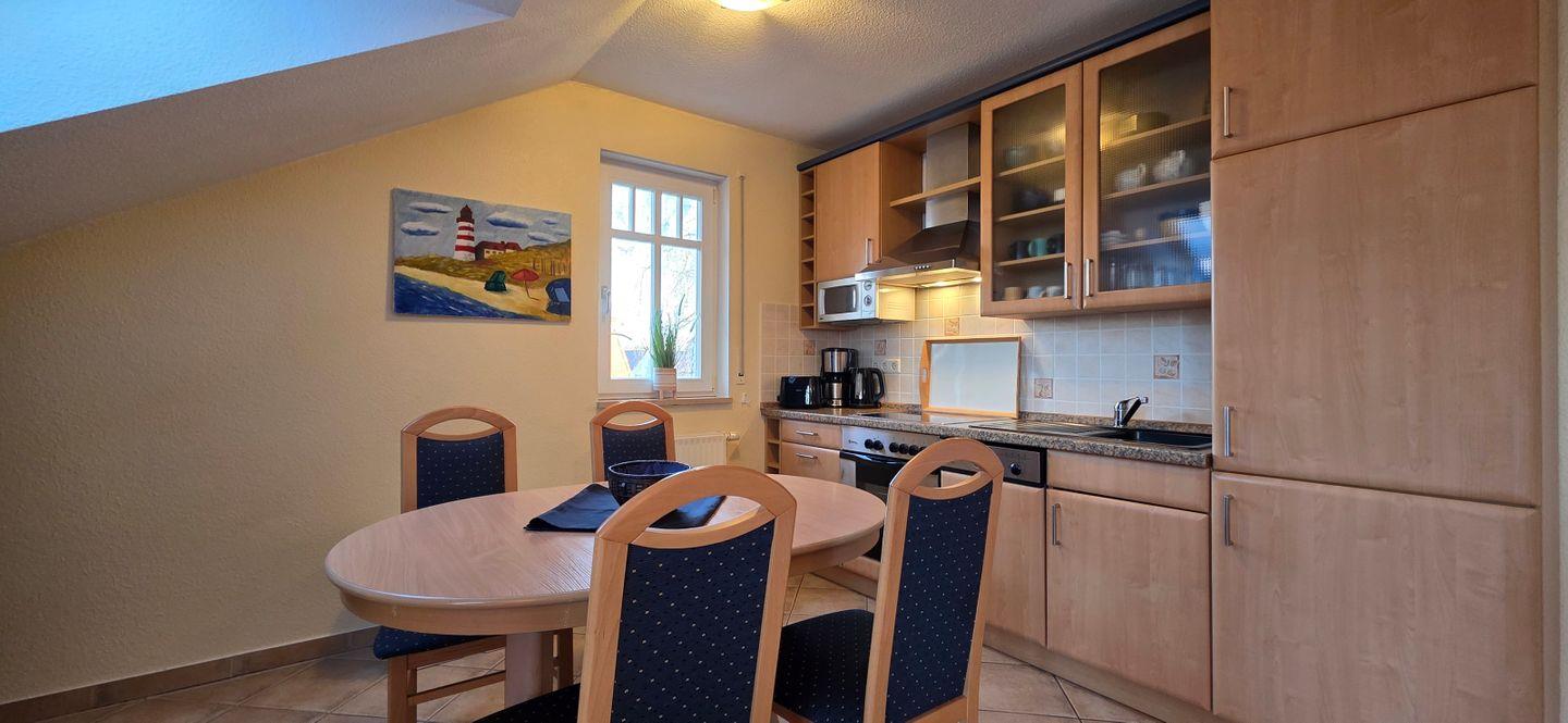 - Küche mit Geschirrspülmaschine, Herd, Backofen, Kühlschrank mit Gefrierfach, Filterkaffeemaschine, Tchibo-Cafissimo Kaffeepadmaschine, Wasserkocher und Toaster