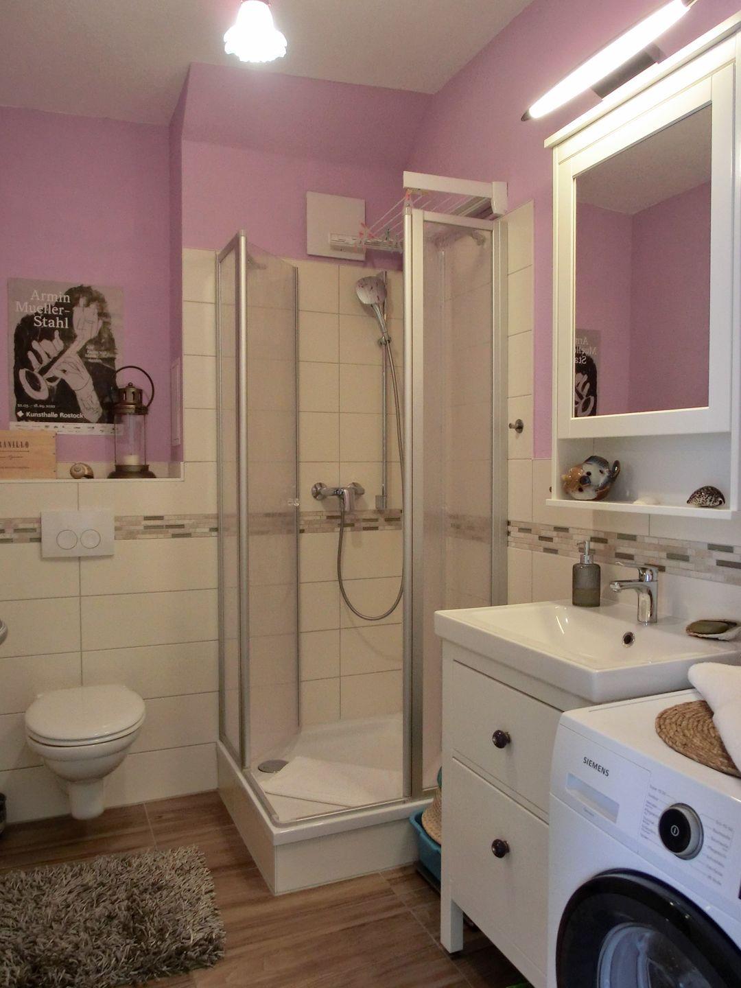 - Duschbadezimmer mit Waschmaschine und Fön