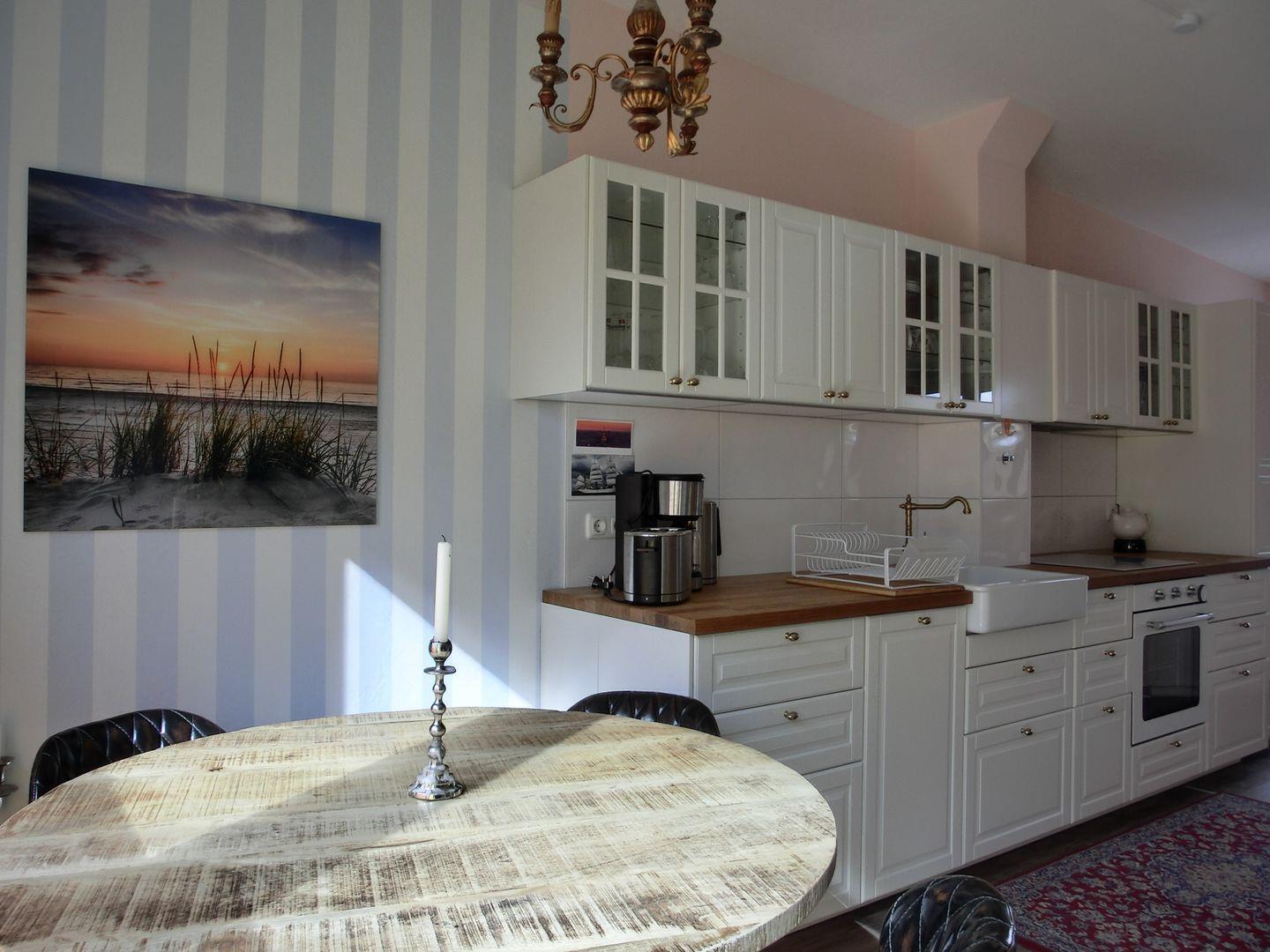 - offene Küche inkl. Herd, Backofen, Geschirrspülmaschine, Kühlschrank mit Gefrierfach, Kaffeemaschine, Toaster, Wasserkocher,