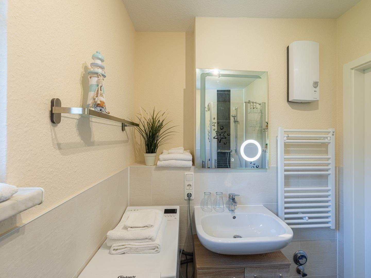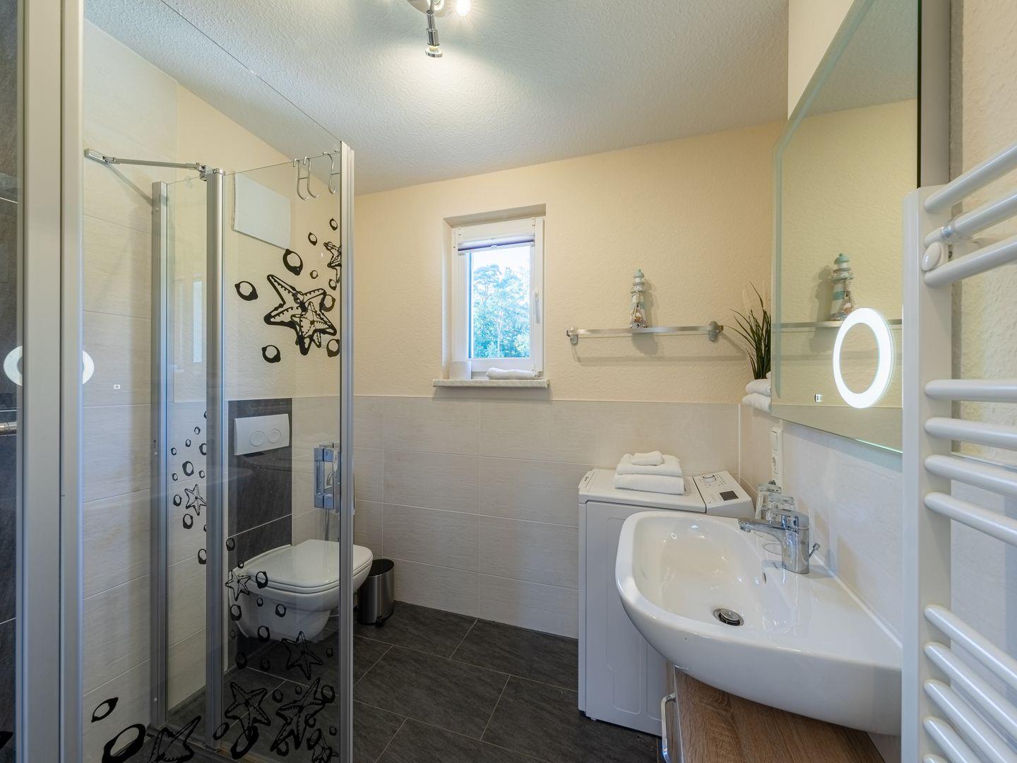 - Tageslichtbad mit ebenerdiger Dusche, genügend Ablagefläche und Fön