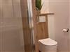 Das moderne Bad ist mit Holzmöbeln ausgestattet und einer ebenerdigen Dusche 90 x 90 cm. Ein Handtuchtrocker zaubert wohlig warme Handtücher.