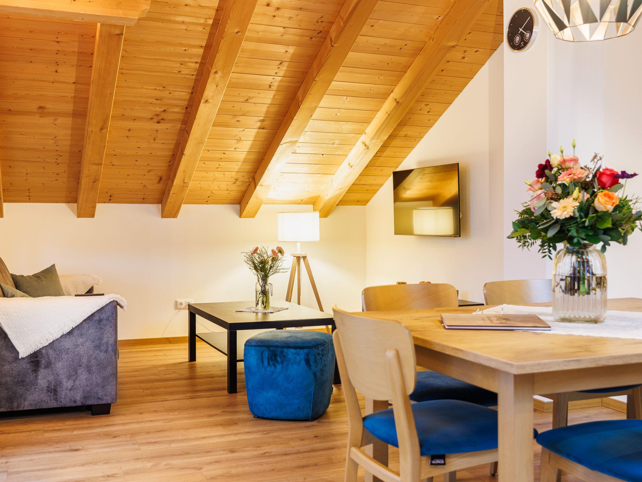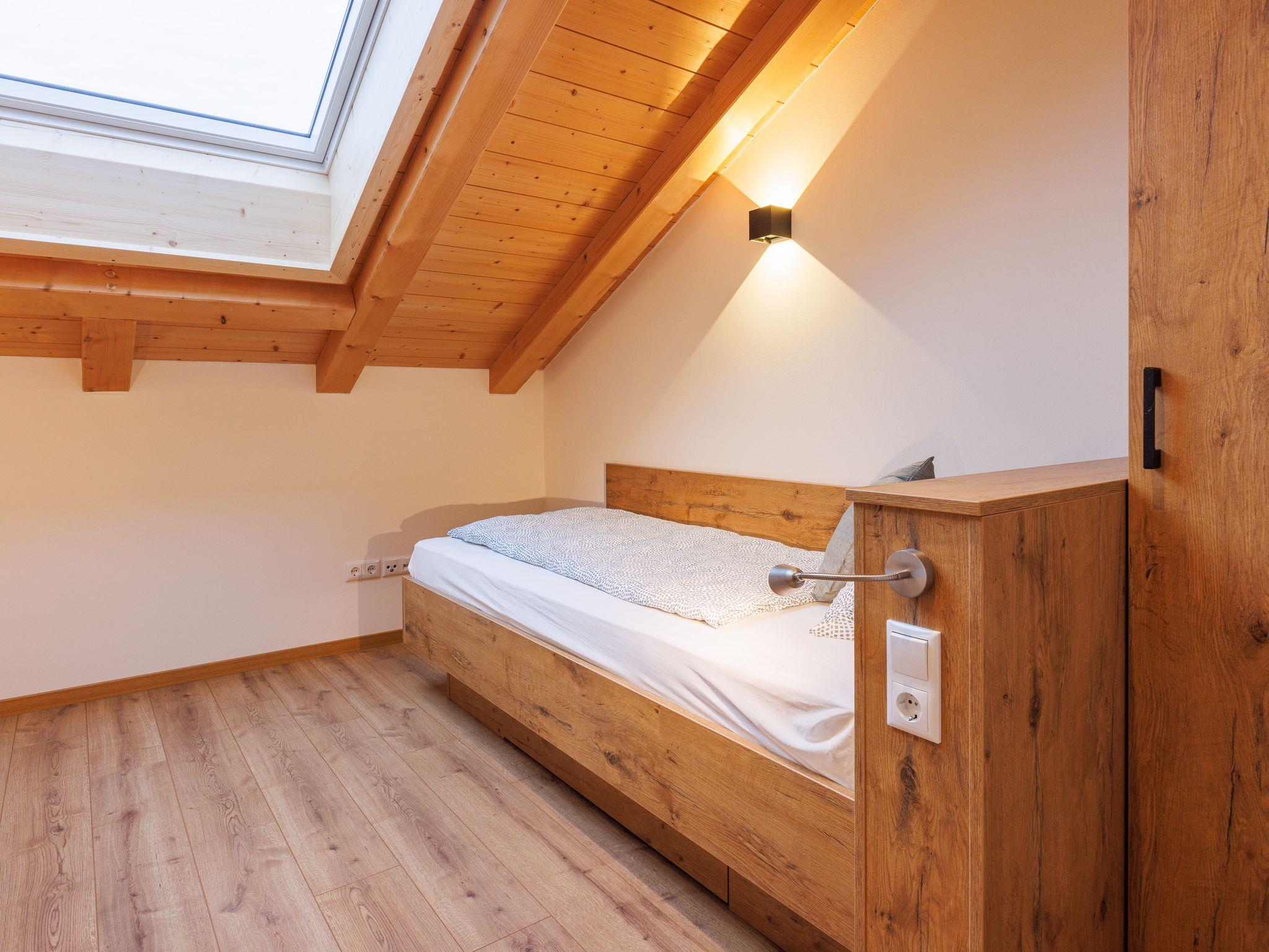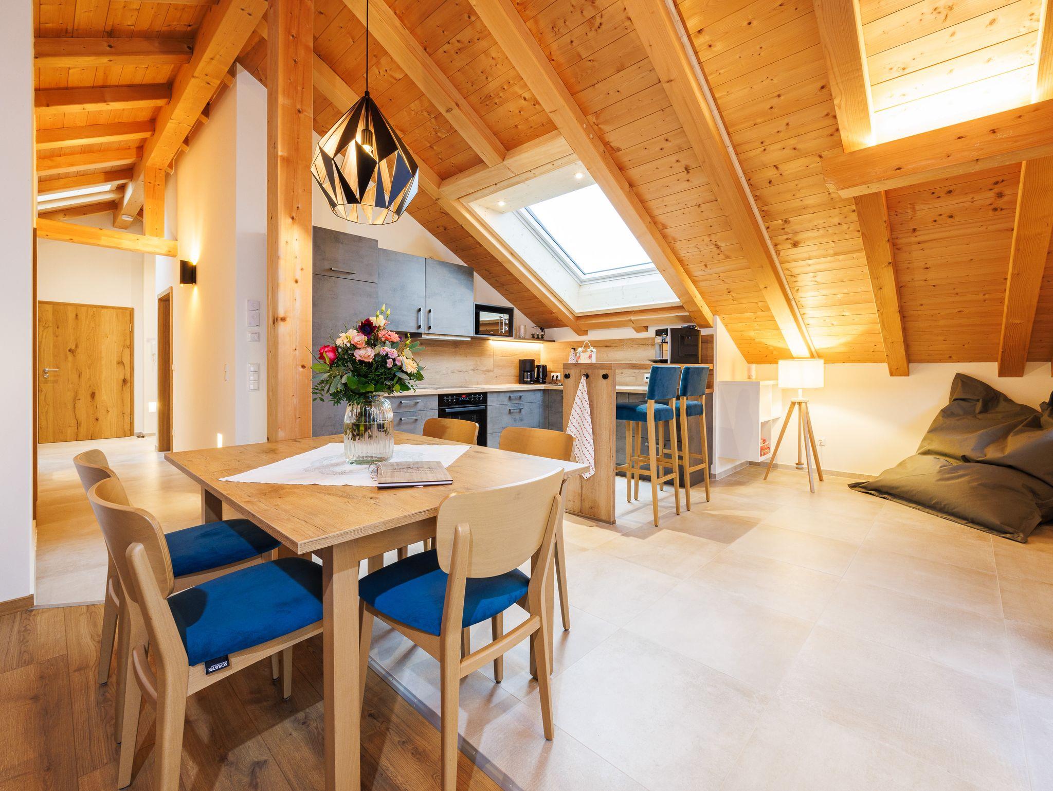 Die helle und geräumige Dachgeschoss Wohnung umfasst 2 Schlafzimmer, ein großes Wohn-und Esszimmer mit Südbalkon, ein Badezimmer und separates WC