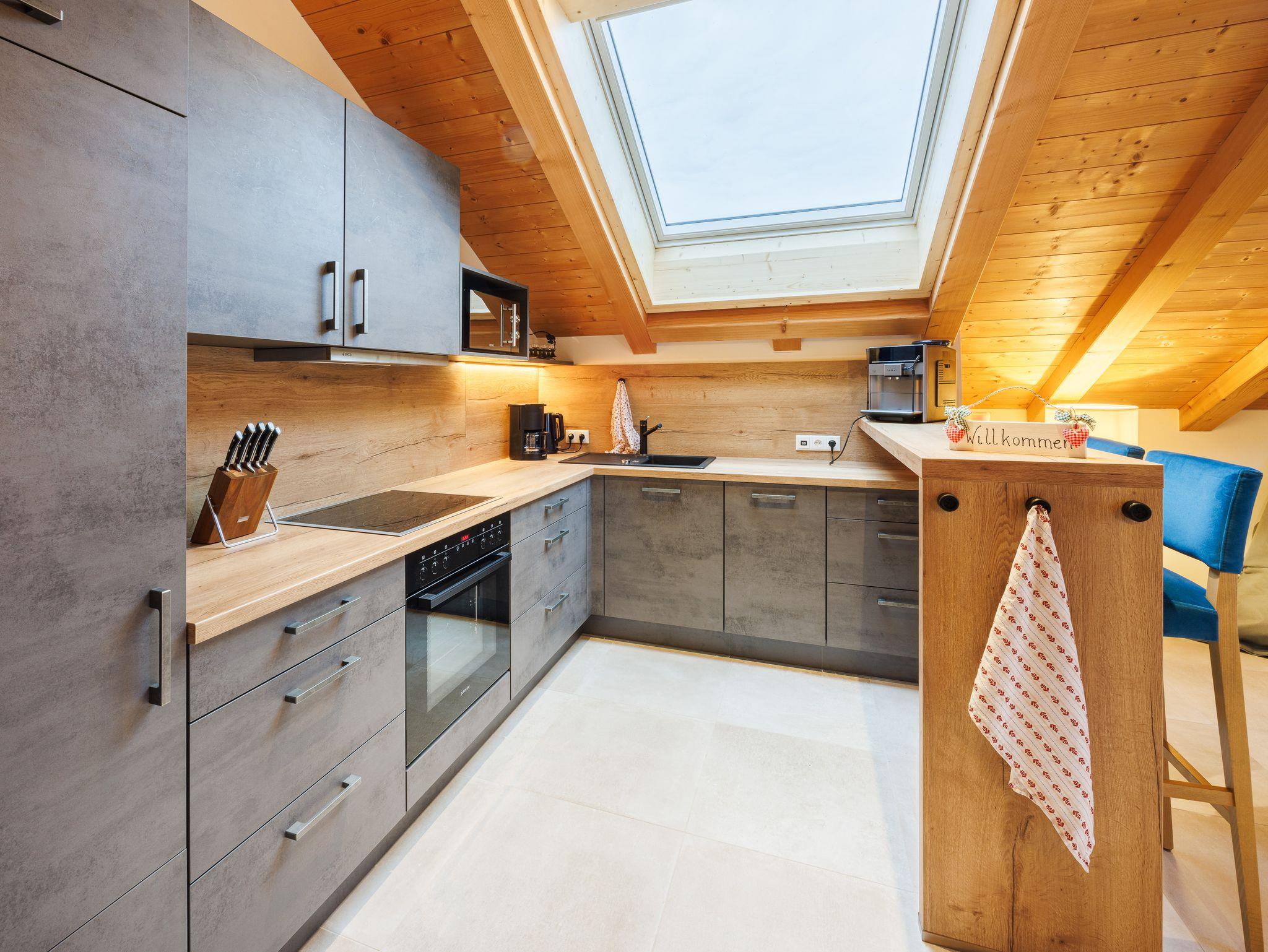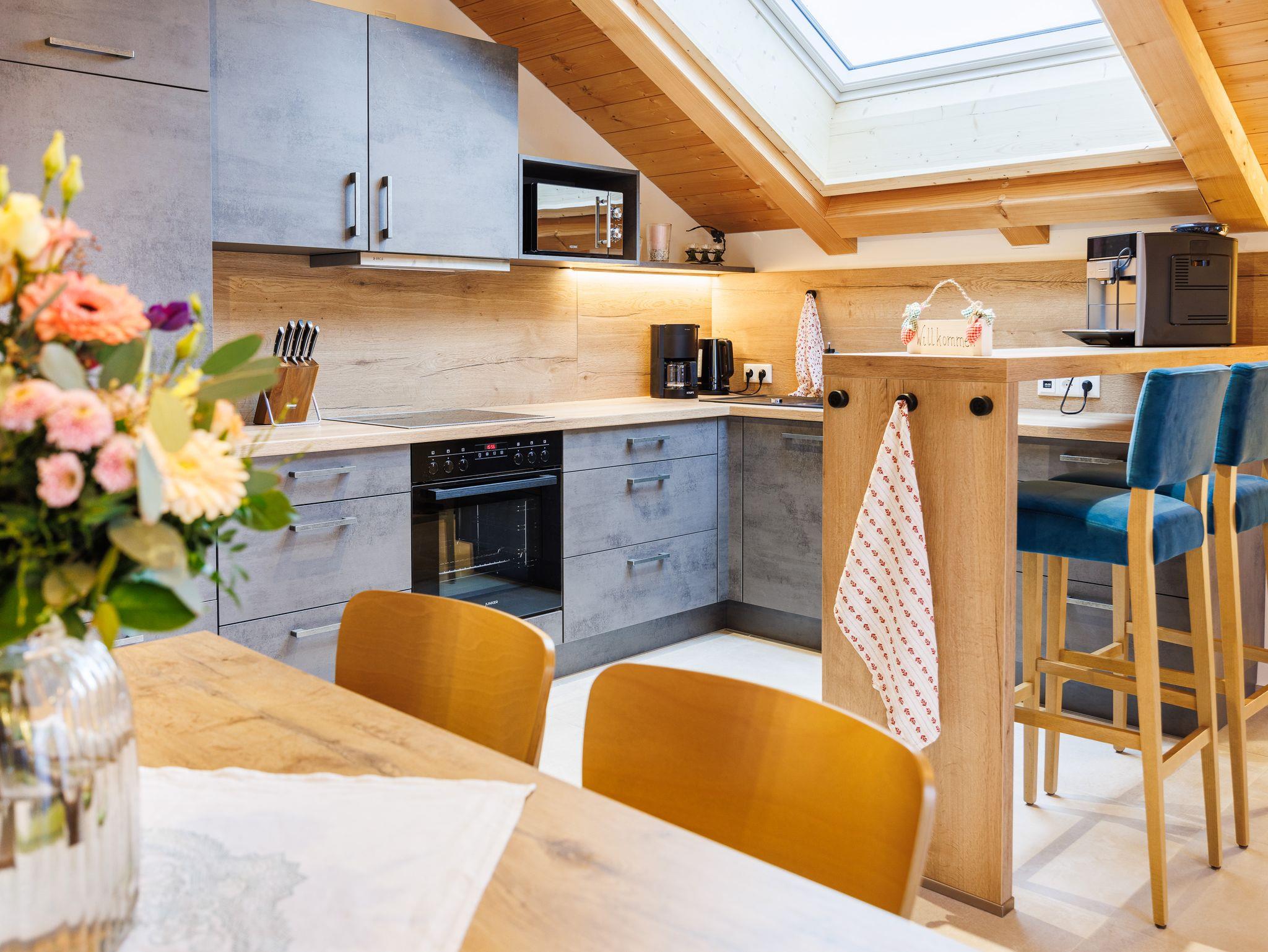 Essbereich und Küche sind voll ausgestattet mit Kühlschrank, Herd, Ofen und Esstisch.
