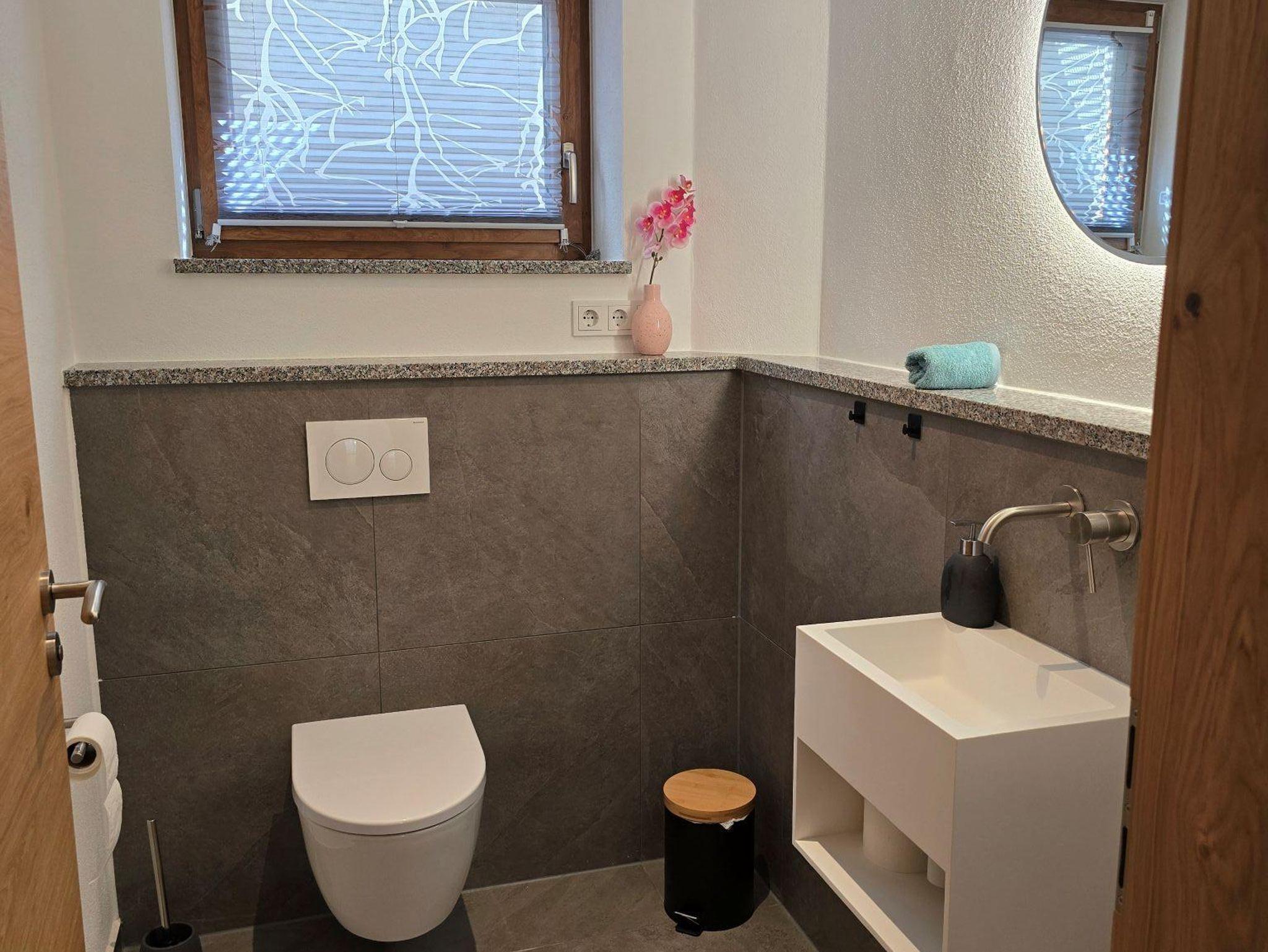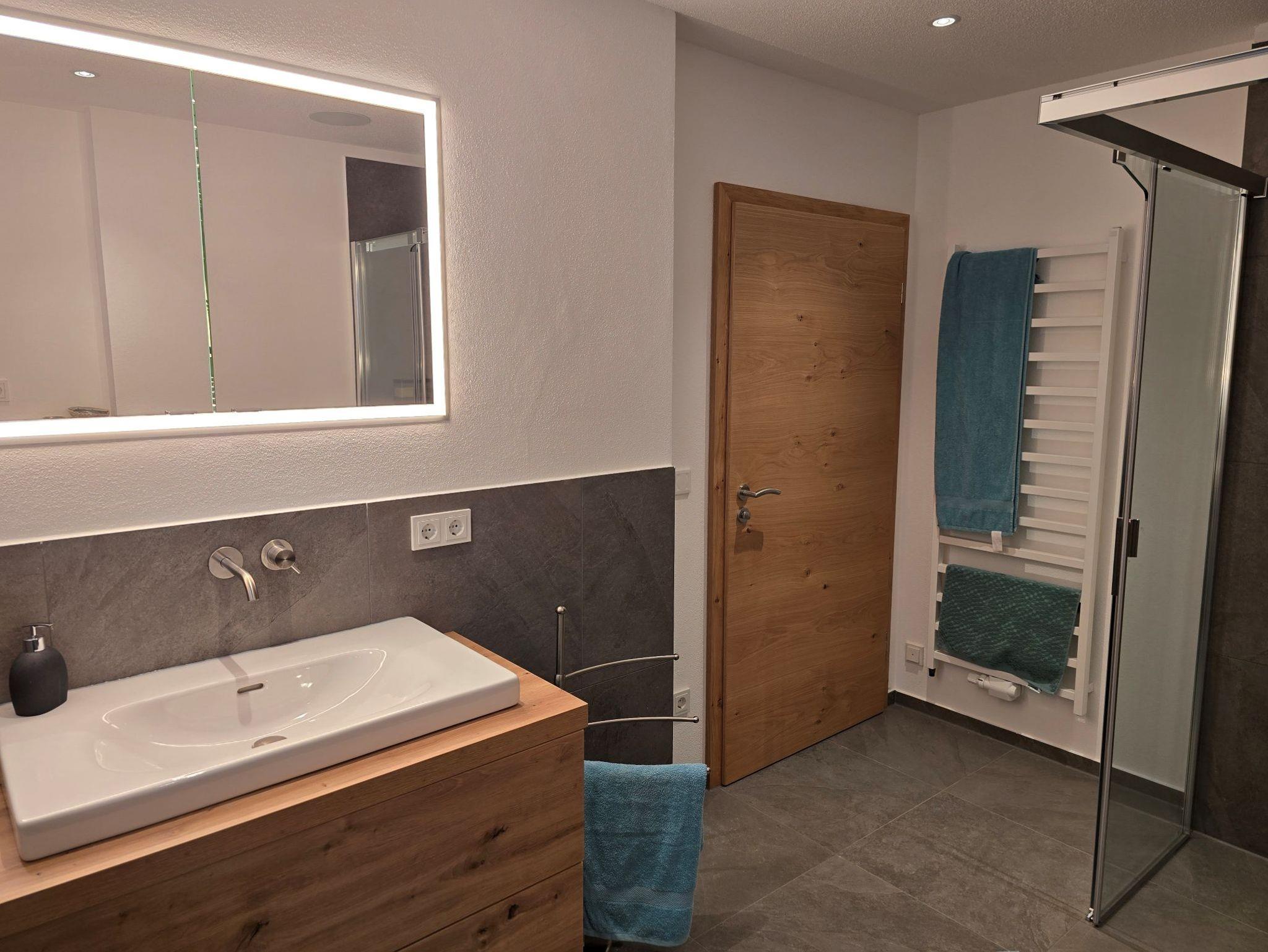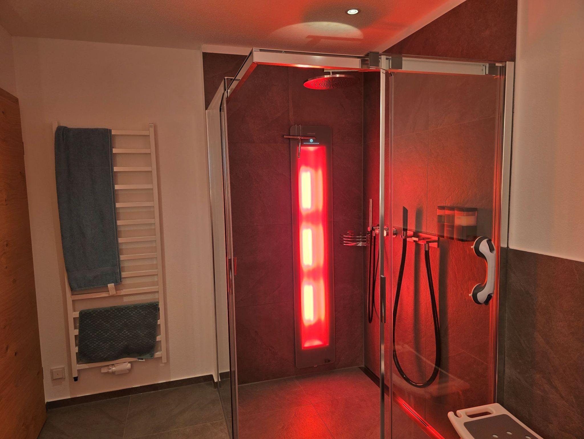 Das Bad verfügt über eine Regendusche sowie eine Infrarot-Sonnendusche zum Aufwärmen. Ein separates WC sorgt für zusätzlichen Komfort. Technisch ist die Wohnung bestens ausgestattet: Smart-Home-System (Loxone), zentrale Lüftungsanlage mit Wärmerückgewinnung und Pollenfilter, Farbbeleuchtung, Lautsprechersystem, kostenlosen highspeed WLAN, extragroßen Smart-TV – alles vorhanden, um den Aufenthalt angenehm zu gestalten.