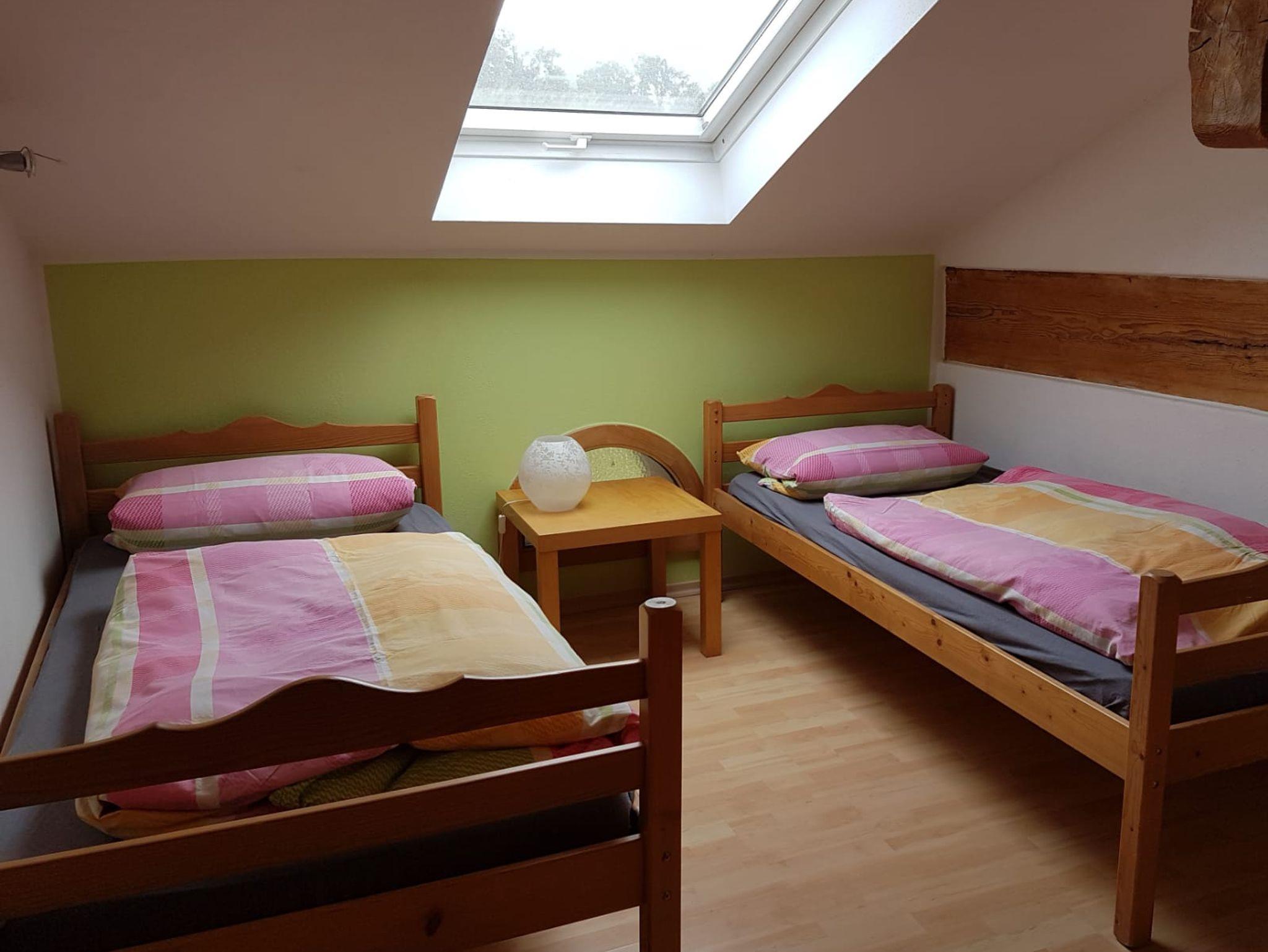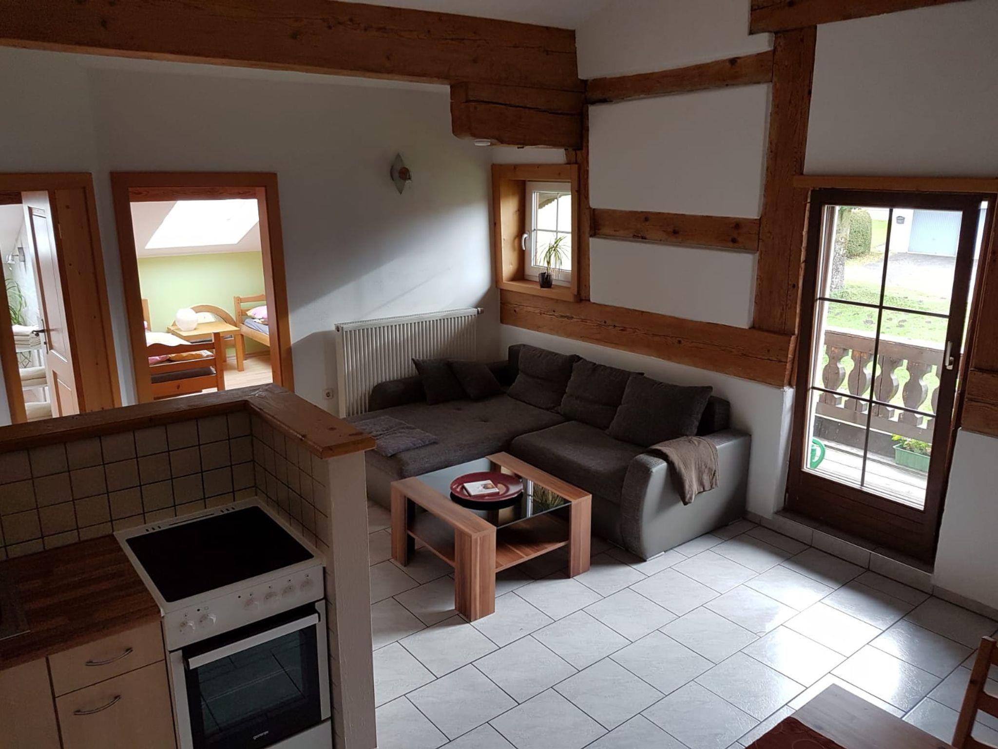 Die Nichtraucher Ferienwohnung befindet sich im Dachgeschoss und ist ca. 70 qm groß. Die Küche ist mit Kühlschrank/Gefrierkombi ausgestattet und hat eine gemütliche Essecke mit Eckbank. Die Wohnung hat zwei separate Schlafzimmer. Über den Balkon hat man einen herrlichen Blick auf den Kinderspielplatz und auf die Pferdekoppeln.