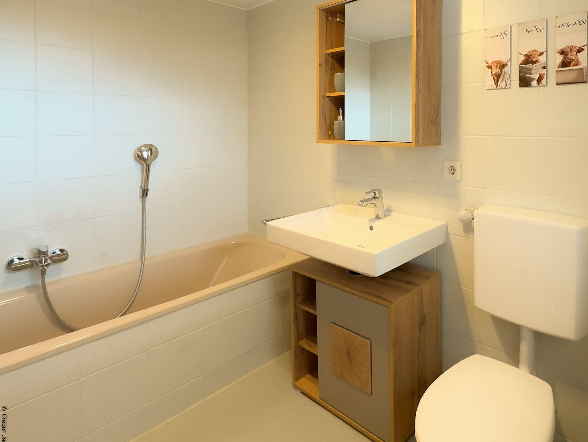 Schlafzimmer 1 hat ein angrenzendes eigenes Bad mit Badewanne und Duschwand, sowie 2 Waschbecken