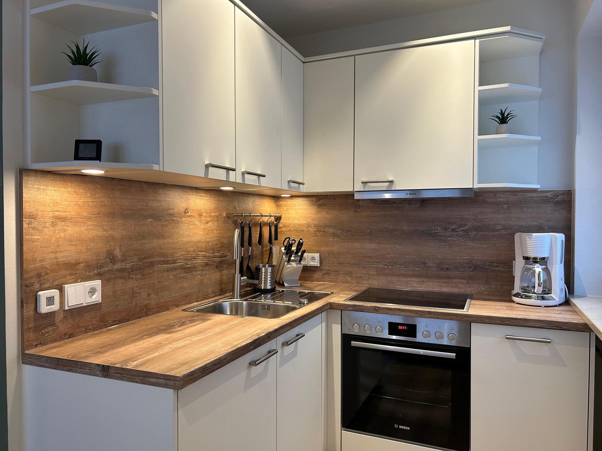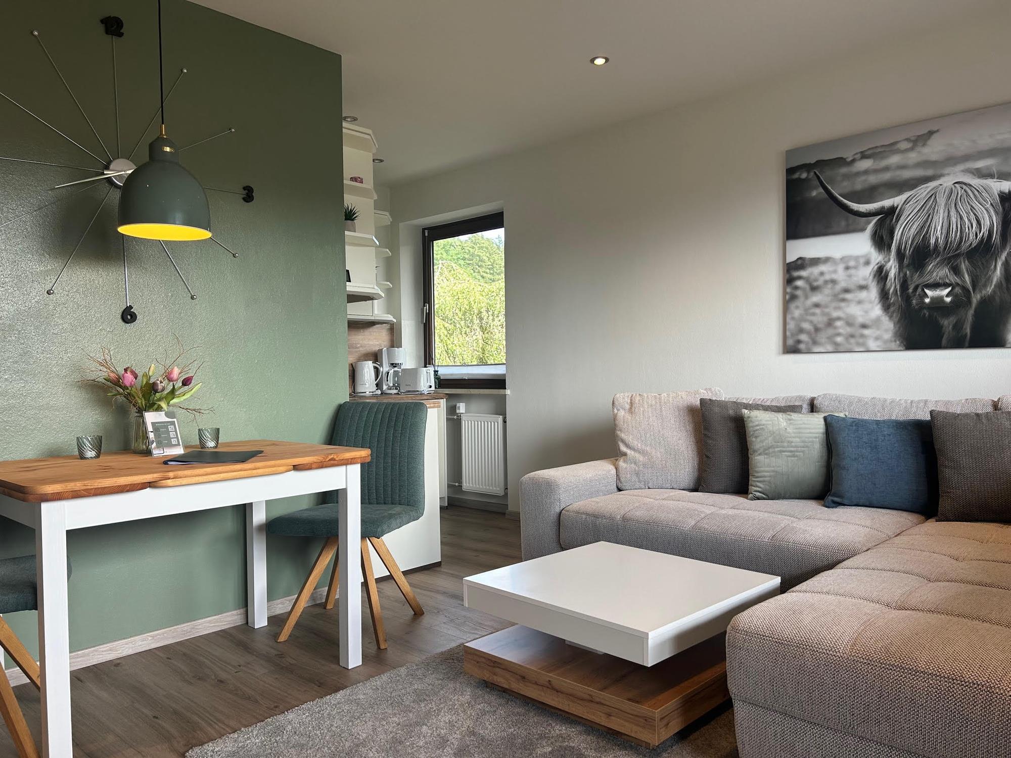 Diese neu renovierte, moderne Ferienwohnung bietet Ihnen auf 45 qm sofortige Annehmlichkeiten, darunter einen geschmackvollen Wohnbereich mit einer bequemen Couch und einem Esstisch, an dem Sie gemeinsame Mahlzeiten genießen können. Der Smart-TV sorgt für Unterhaltung und gemütliche Abende.