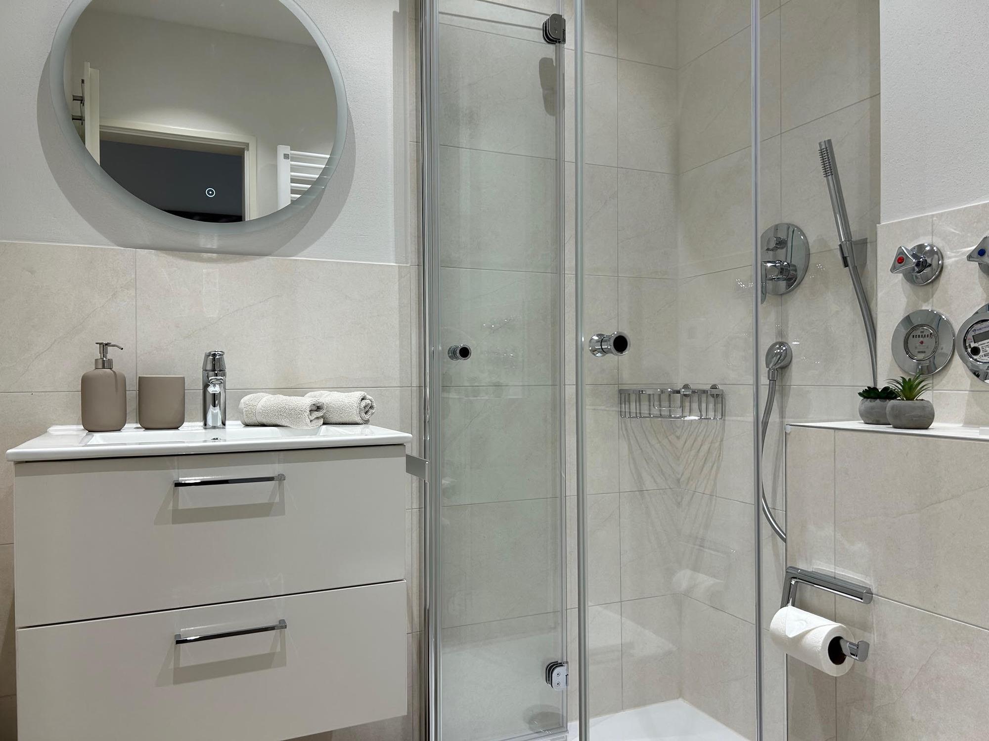 Das ChiemNest bietet ein Schlafzimmer mit Kleiderschrank für Ihren Komfort und ein kleines Bad mit Dusche, das Funktionalität und Stil vereint. Die Kombination aus modernem Design und heimeliger Atmosphäre sorgt dafür, dass Sie sich sofort wohlfühlen.
