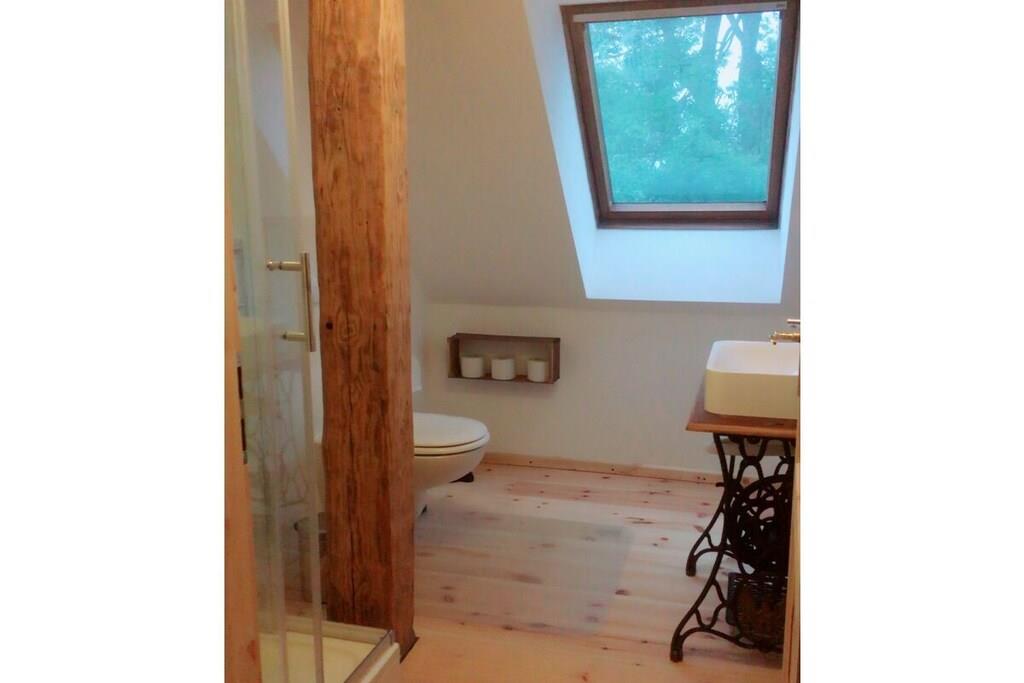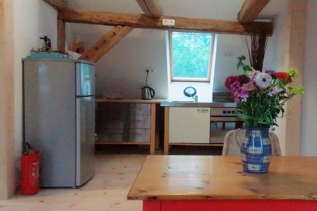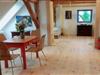 Ferielejligheden nås direkte fra den fælles entré, der fører op til den naturlige, ufærdige loftsdør. Gennem lejlighedens entrédør kommer man ind i det åbne køkken- og spiseområde. Bagtil er der en sofa, en enkeltseng og en dobbeltseng. En stige fører op til den åbne hems med ekstra sovemuligheder. En barneseng og højstol kan stilles til rådighed. Denne ferielejlighed supplerer vores anden lejlighed overfor, som er ideel til bedsteforældre eller familier, der rejser sammen. Bemærk venligst: Selvom der er flere sovemuligheder, kan vores spildevandsanlæg kun rumme maksimalt fire personer, inklusive børn. Hvis jeres selskab er større end fire, bedes I kontakte os på forhånd. Sommerstorf ligger kun ti minutters kørsel fra Waren an der Müritz og kun få minutter fra mange smukke søer i det dejlige Mecklenburg-landskab.