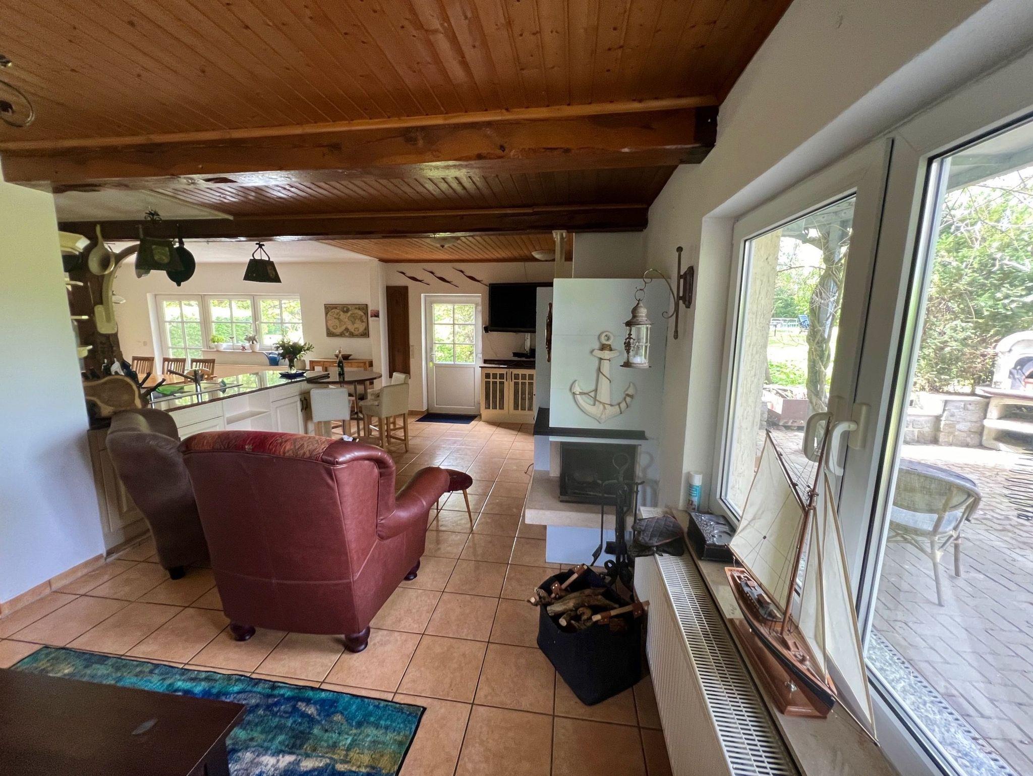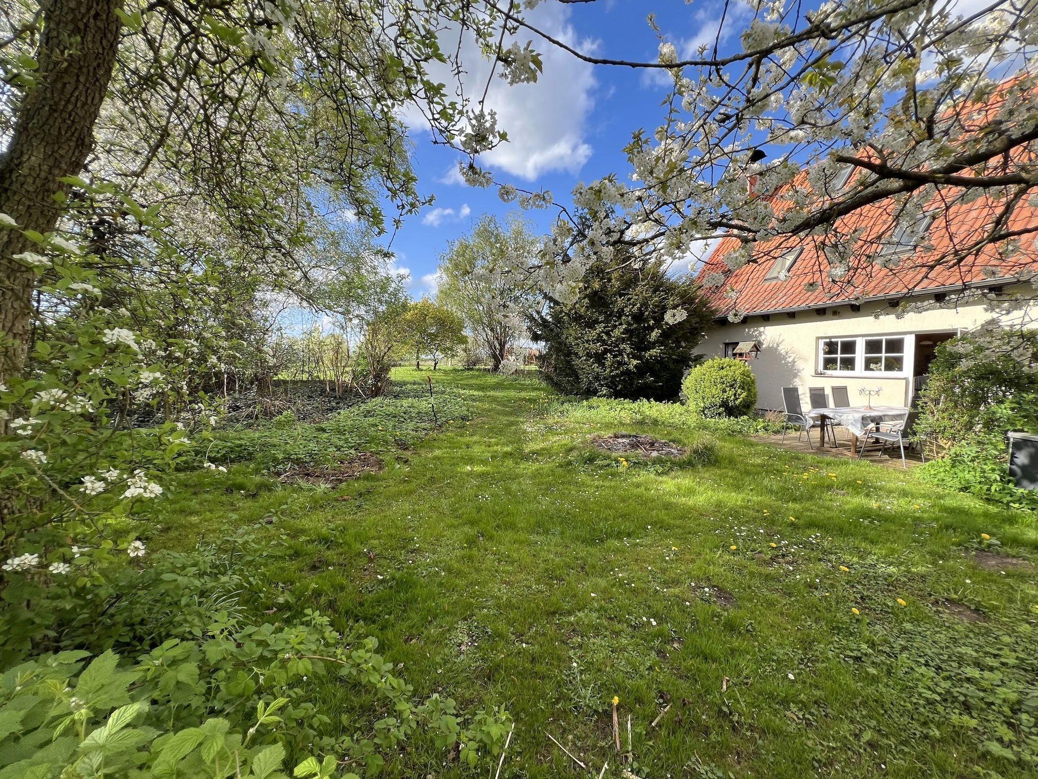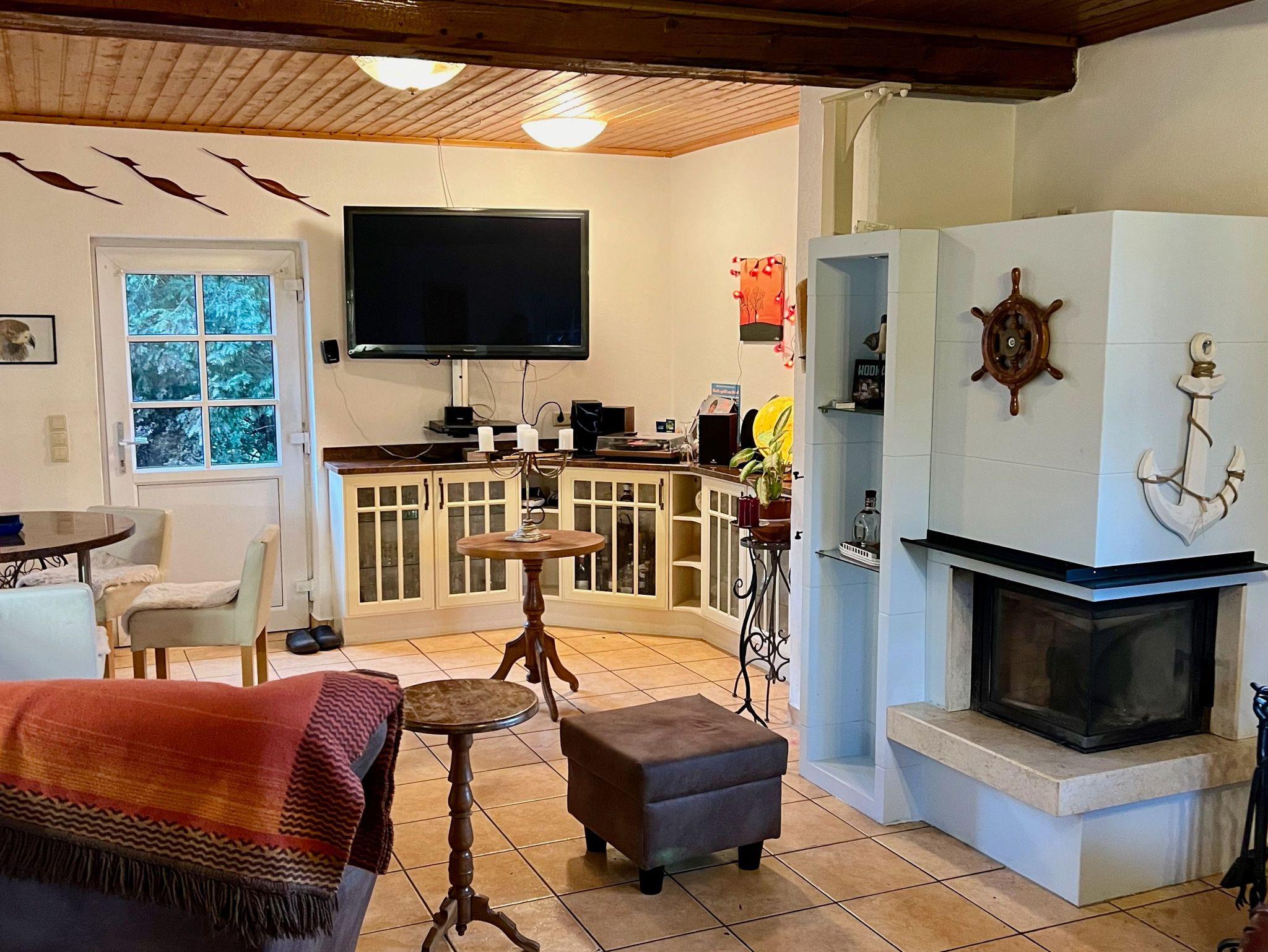 Im Erdgeschoss liegt die großzügige Wohnküche mit Esstisch, Kamin, gemütlicher Sitzecke und großem TV-Bildschirm. Von hieraus gelangen Sie auf die Außenterrasse mit Gartenmöbeln und Grill und in unseren weitläufigen, naturbelassenen Garten mit Rasenflächen, Obstbäumen und einem kleinen Spielplatz.