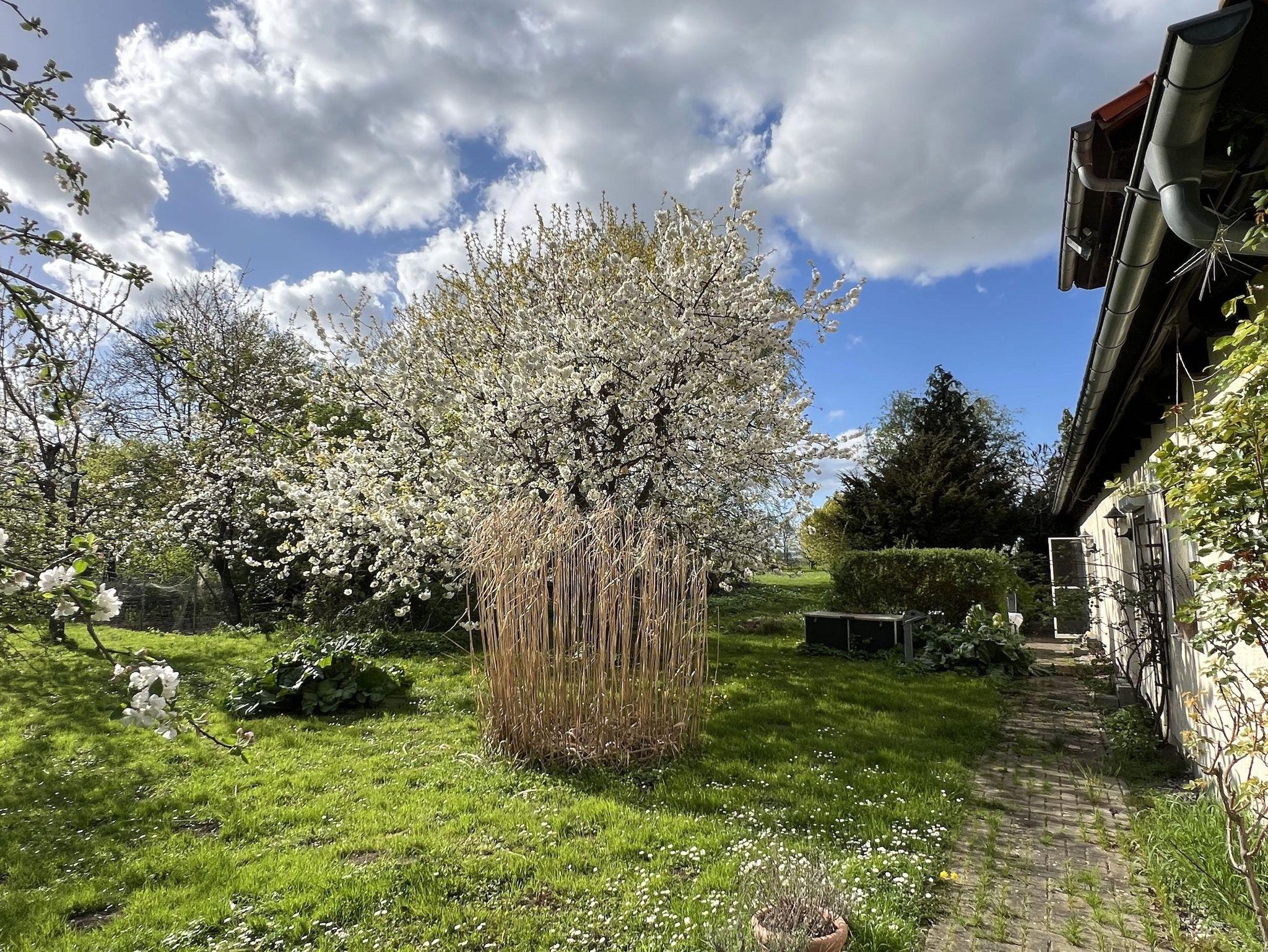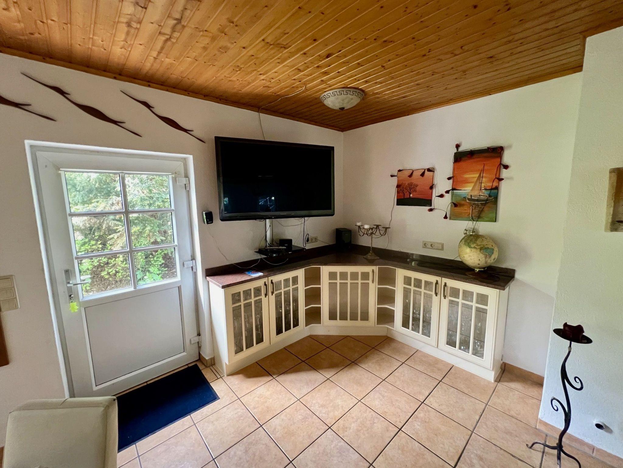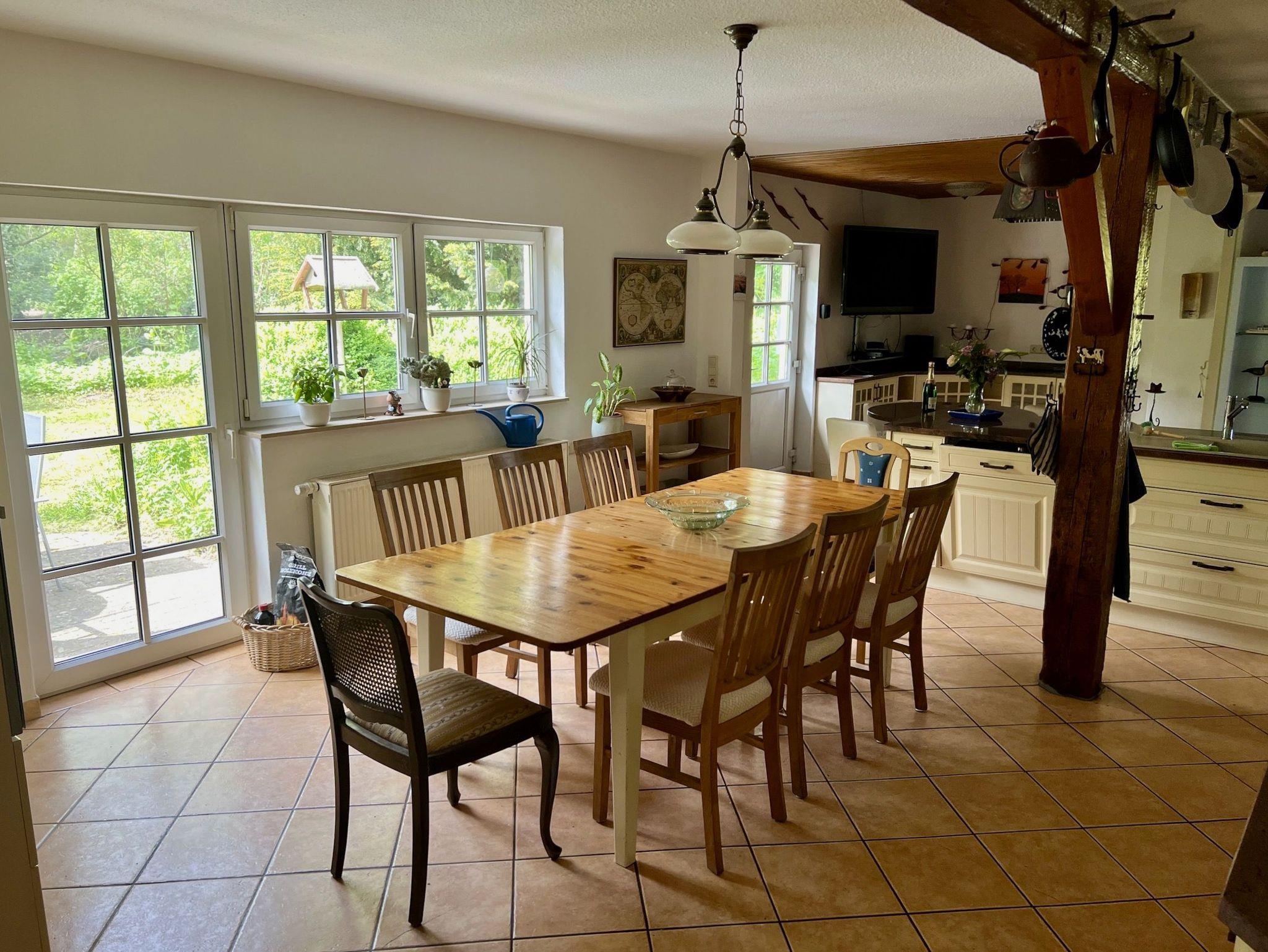 Im Erdgeschoss liegt die großzügige Wohnküche mit Esstisch, Kamin, gemütlicher Sitzecke und großem TV-Bildschirm. Von hieraus gelangen Sie auf die Außenterrasse mit Gartenmöbeln und Grill und in unseren weitläufigen, naturbelassenen Garten mit Rasenflächen, Obstbäumen und einem kleinen Spielplatz.