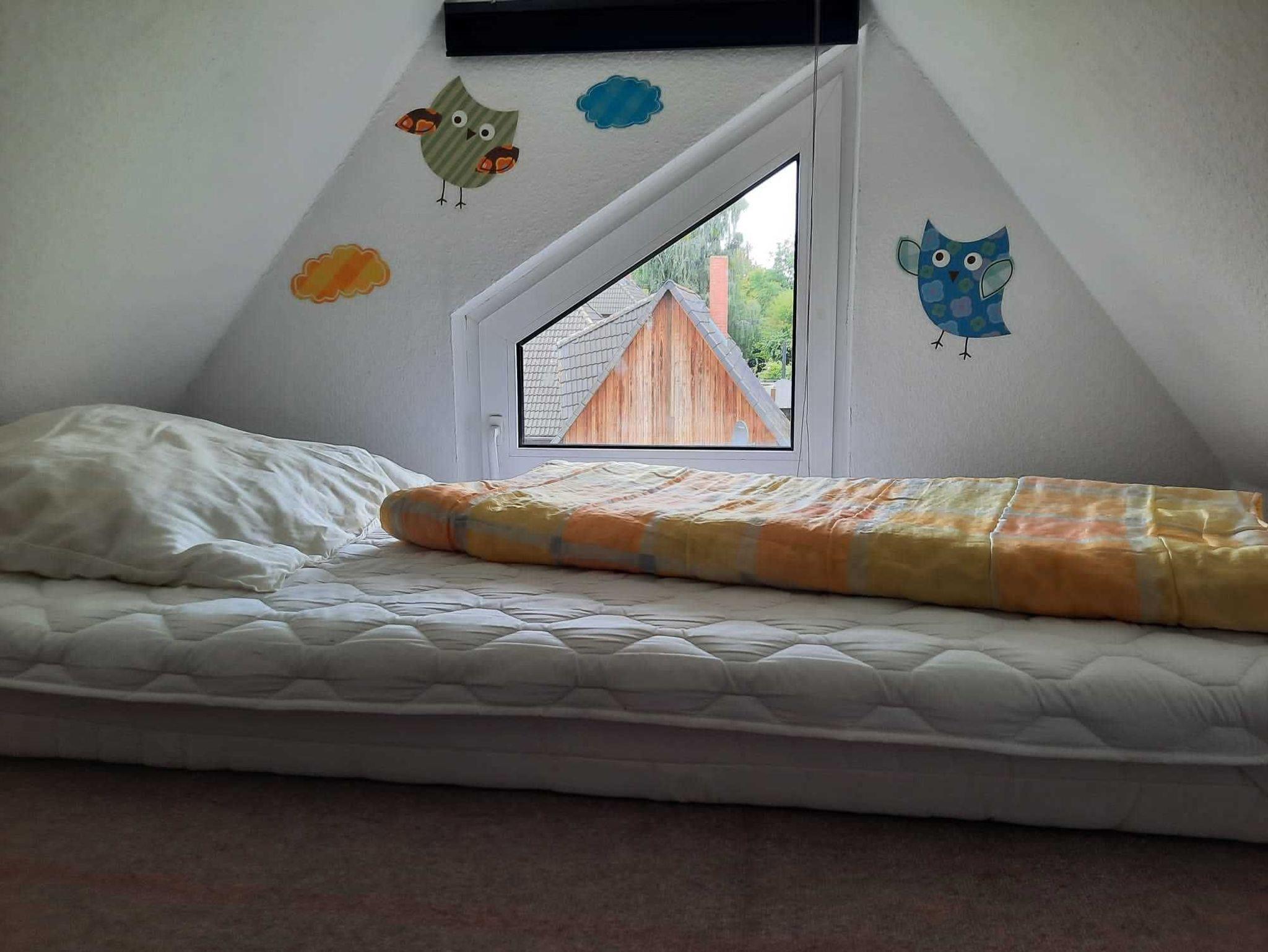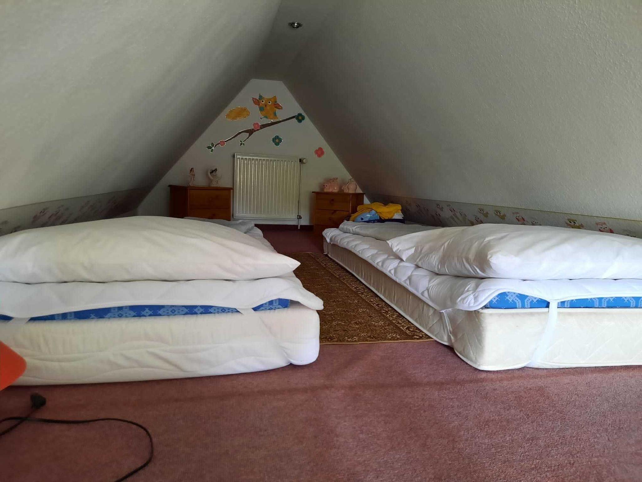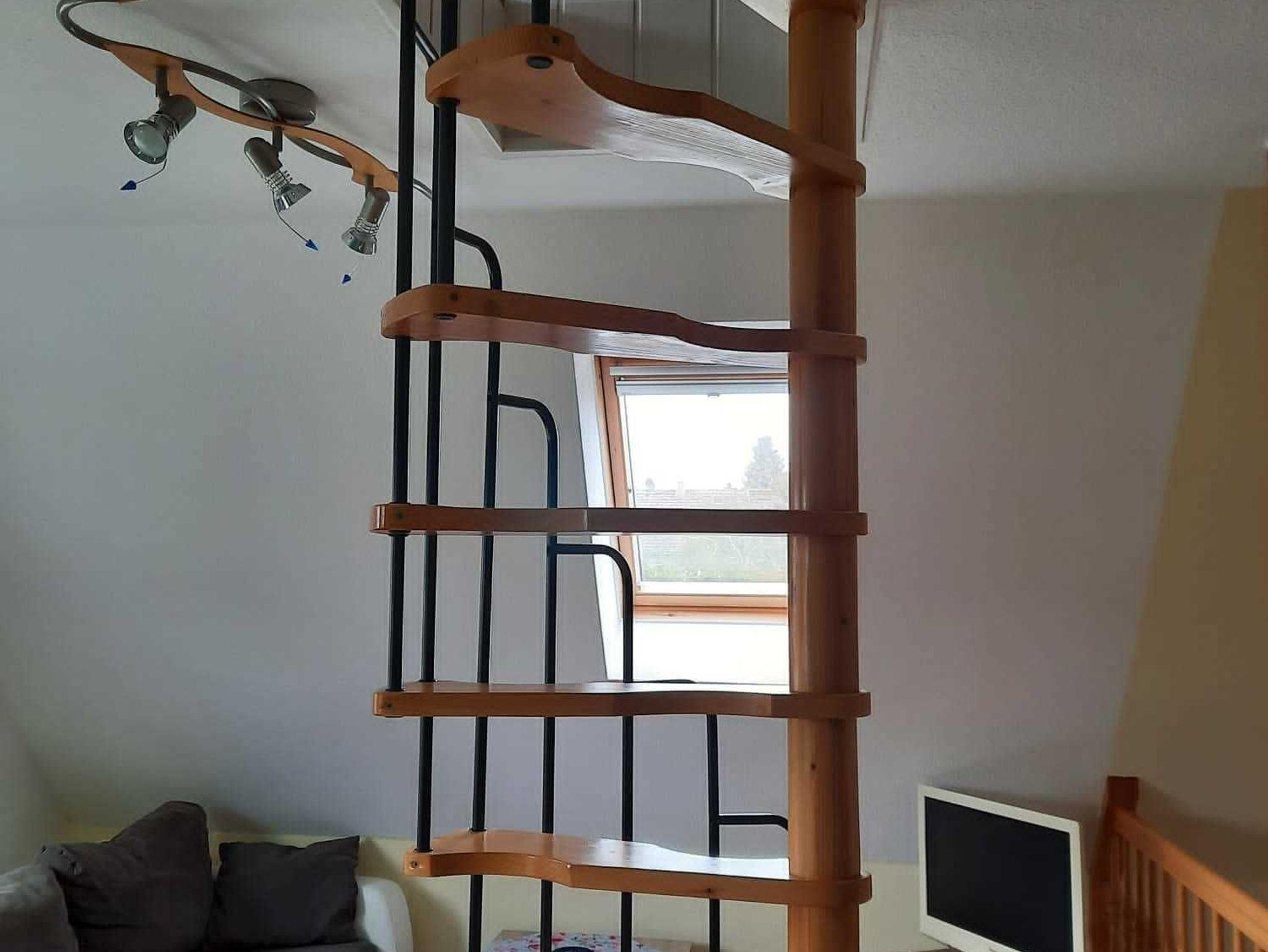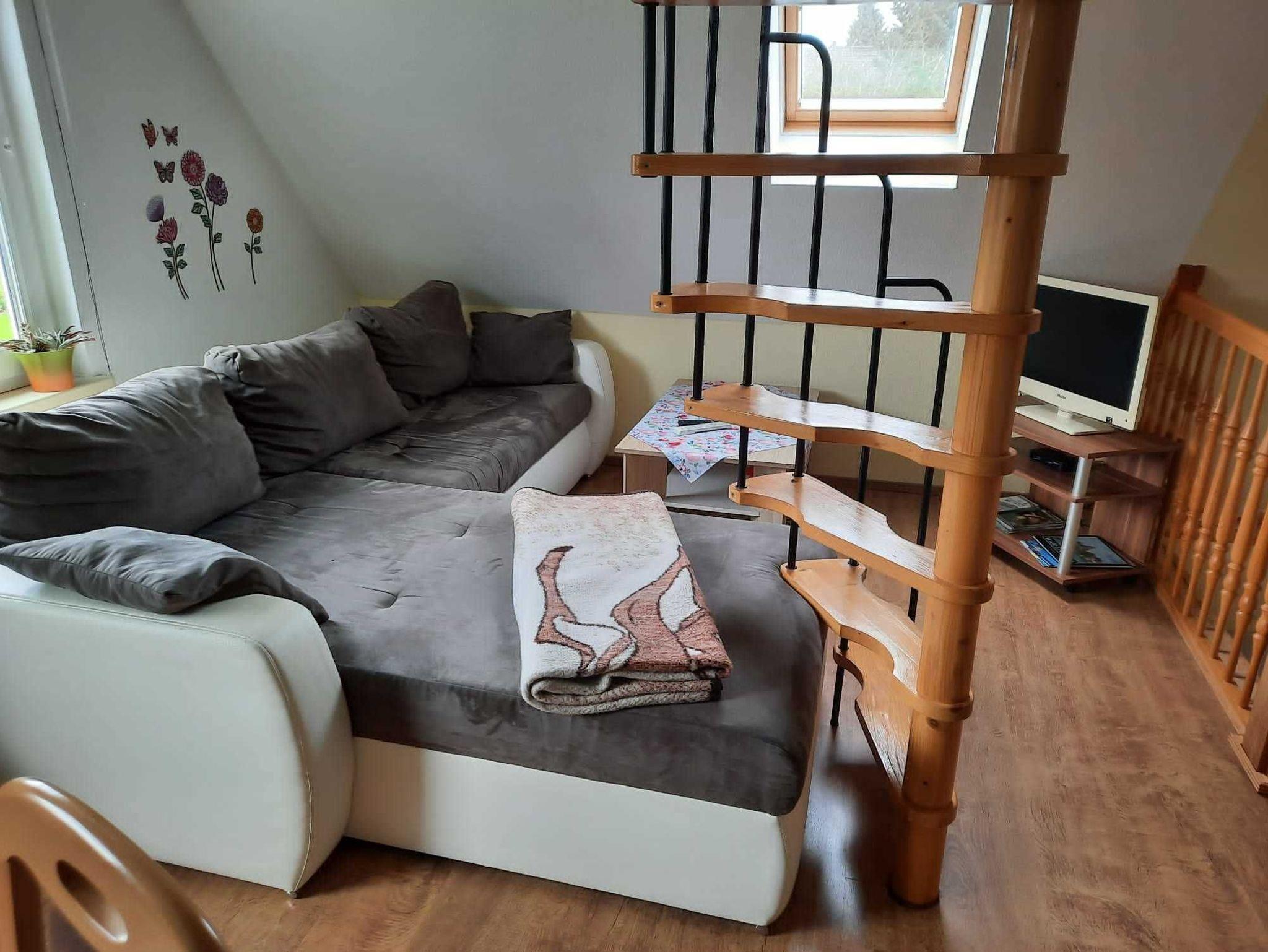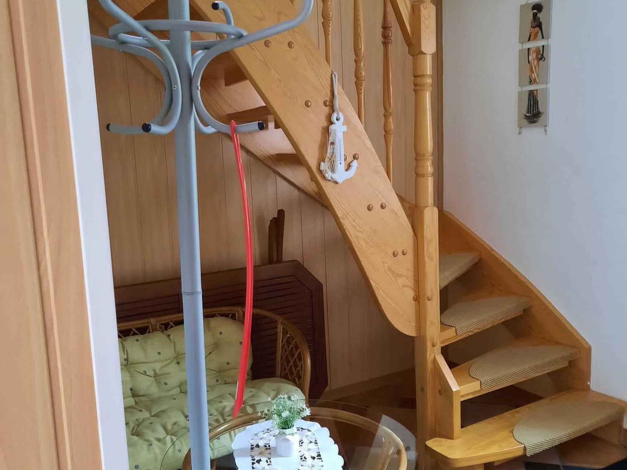 Erdgeschoß: kleiner Flur + Garderobe, Diele mit Korbmöbeln, Holztreppe 1/2 gewendelt mit Handlauf ins 1. Geschoß, Küche mit Essecke (großer Tisch + Stühle) offen zum Wohnzimmer, Eingang zum Schlafzimmer mit Ehebetten, von dort ins Bad, vom Wohnzimmer-Wendeltreppe in die Dachspitze, ausgelegt mit Schlafmatratzen mit Fenster, Heizung und Lüfter. Handtücher und Bettwäsche sind selbst mitzubringen. Strom wird je nach Verbrauch berechnet (0,33 Euro kWh).