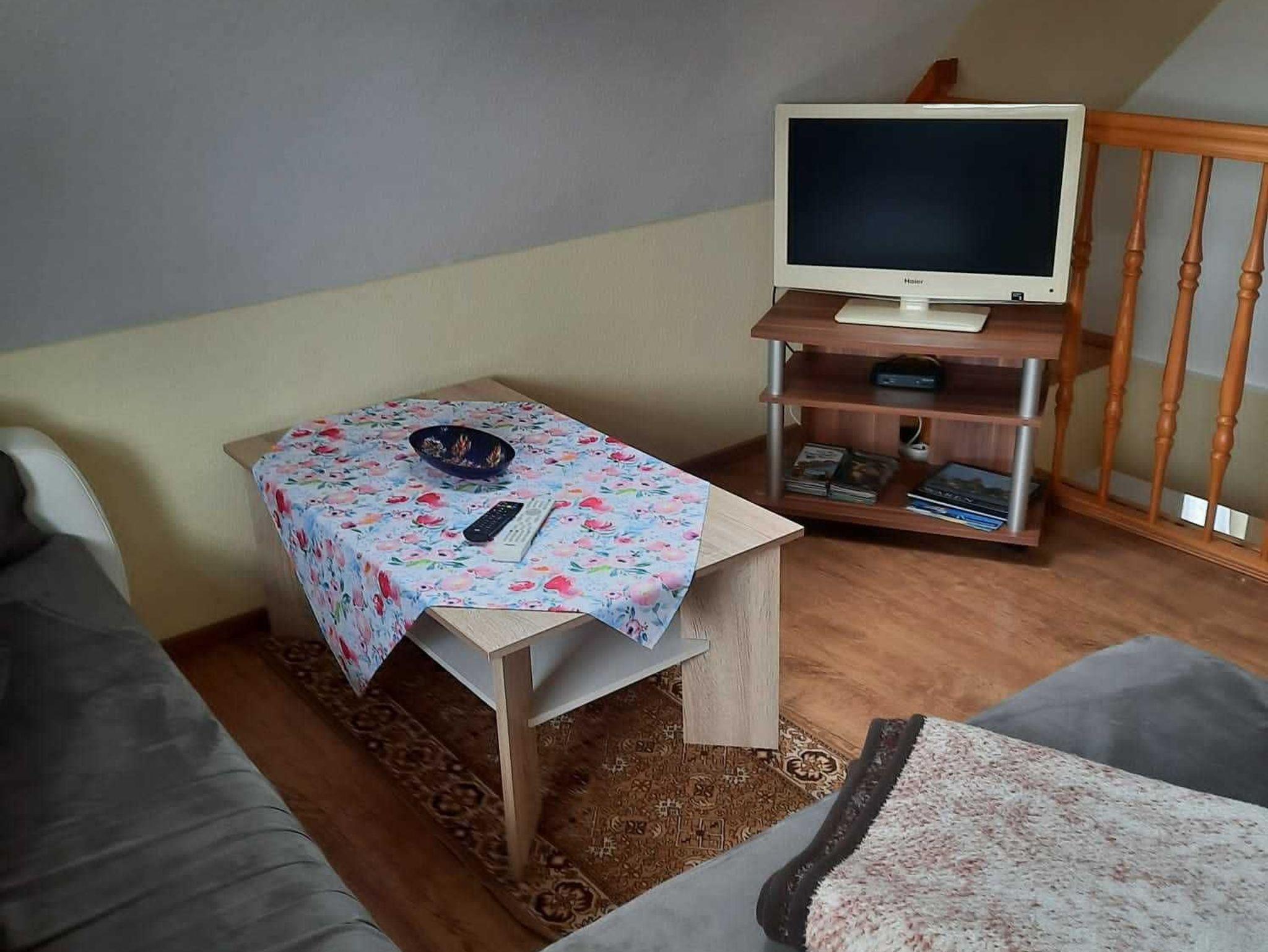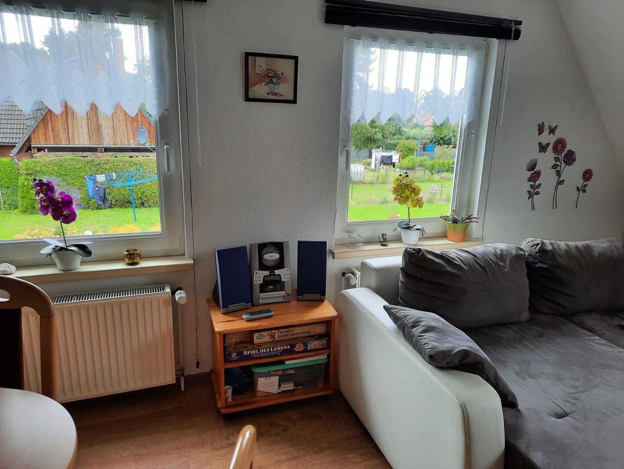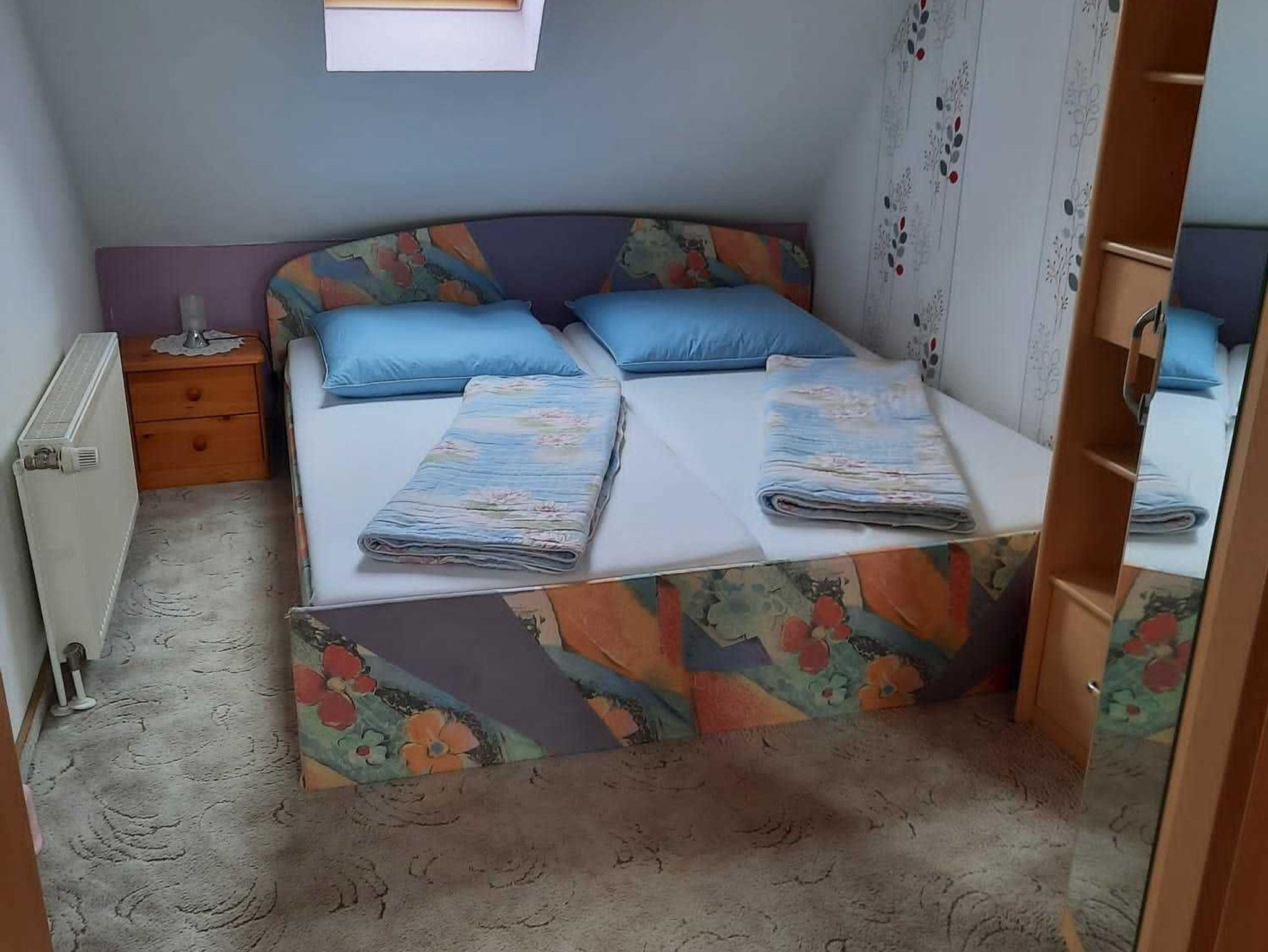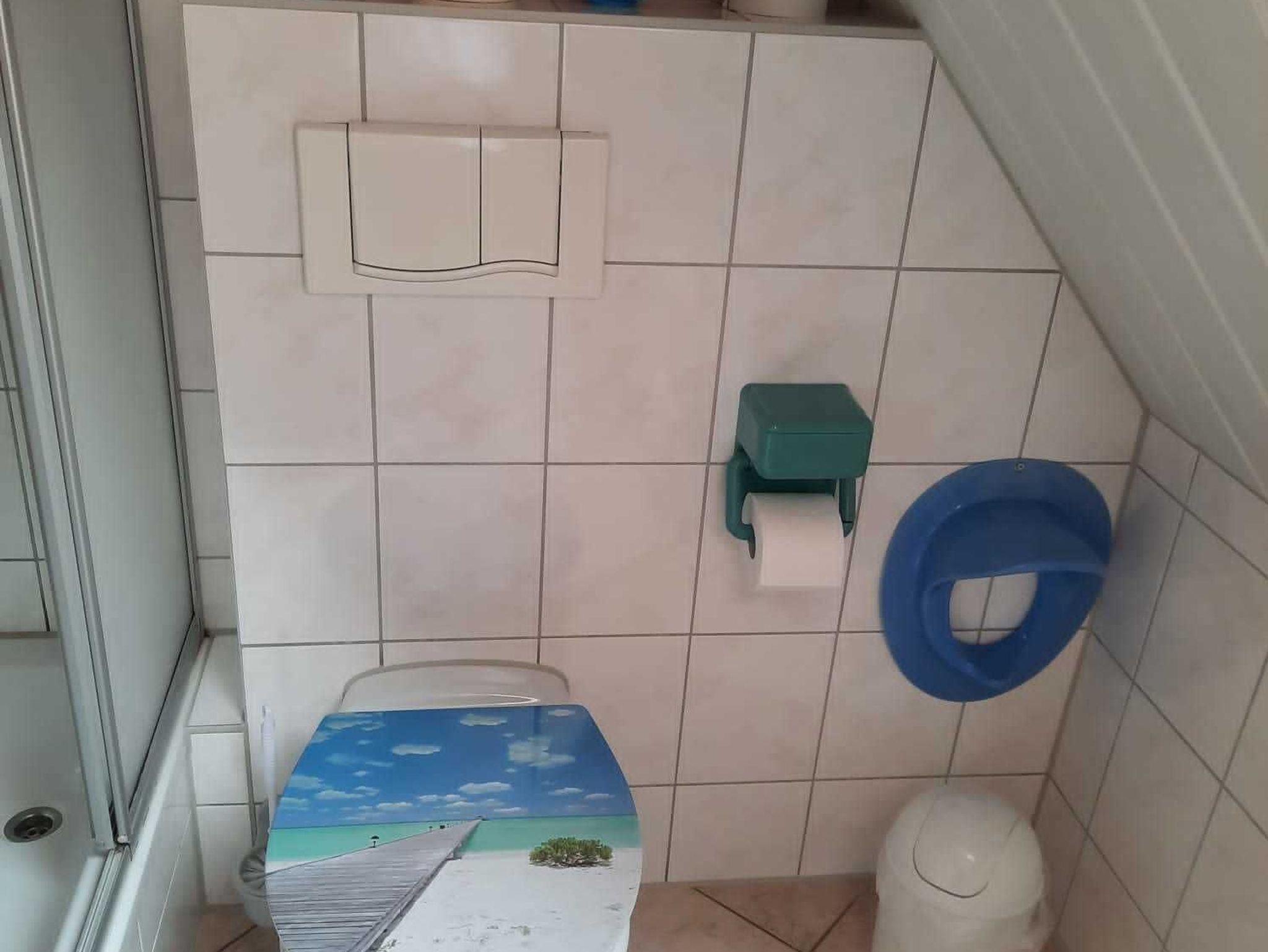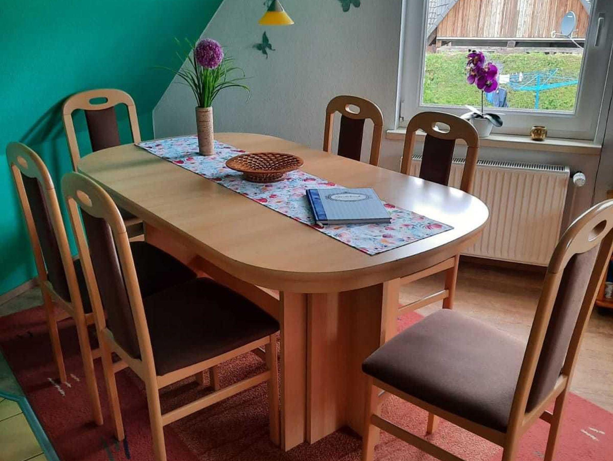 Erdgeschoß: kleiner Flur + Garderobe, Diele mit Korbmöbeln, Holztreppe 1/2 gewendelt mit Handlauf ins 1. Geschoß, Küche mit Essecke (großer Tisch + Stühle) offen zum Wohnzimmer, Eingang zum Schlafzimmer mit Ehebetten, von dort ins Bad, vom Wohnzimmer-Wendeltreppe in die Dachspitze, ausgelegt mit Schlafmatratzen mit Fenster, Heizung und Lüfter. Handtücher und Bettwäsche sind selbst mitzubringen. Strom wird je nach Verbrauch berechnet (0,33 Euro kWh).
