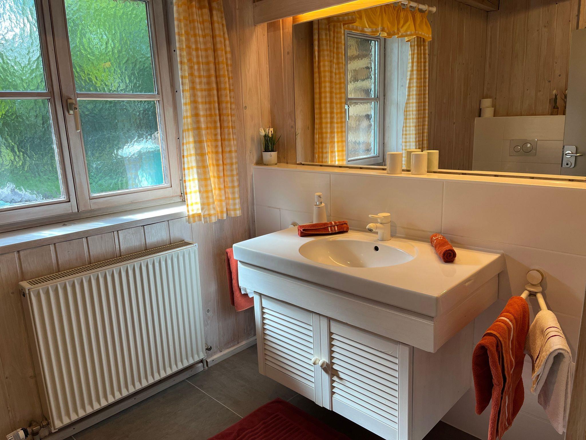 Das helle Bad mit Fenster ist ausgestattet mit Dusche, WC, großem Waschtisch mit Spiegel, Kosmetikspiegel, Föhn sowie Hand- und Badetücher und WC Papier.