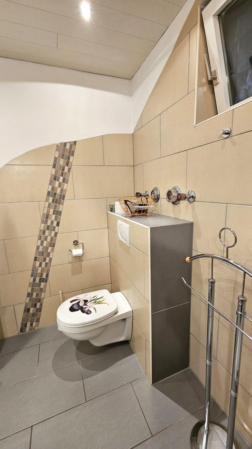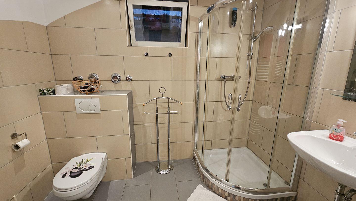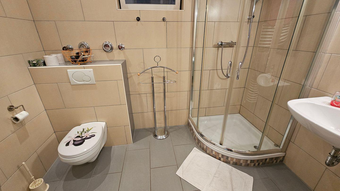 Das moderne Badezimmer ist mit einer bodengleichen Dusche, einem Waschbecken sowie WC ausgestattet und bietet Ihnen alle Annehmlichkeiten, die Sie brauchen. Weitere Extras wie ein Haartrockner und frische Handtücher runden das Angebot ab.