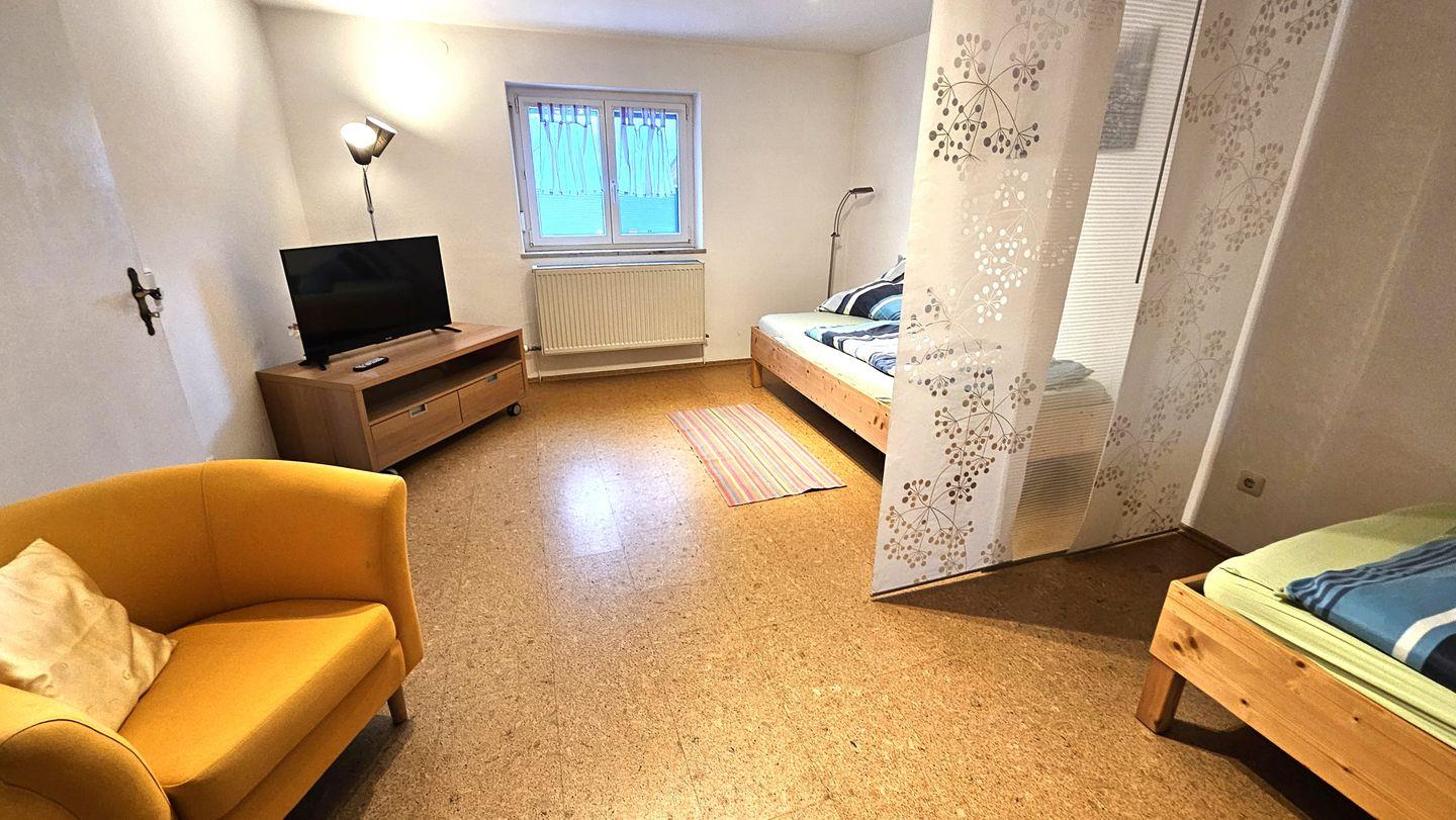 Der Schlafbereichder Ferienwohnung „zur Amper“ ist im Wohnzimmer integriert. Mit zwei hintereinander stehenden Einzelbetten ausgestattet, sorgt es für einen erholsamen Schlaf. Frische Bettwäsche und Handtücher sind natürlich im Preis inbegriffen.