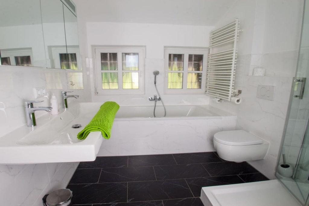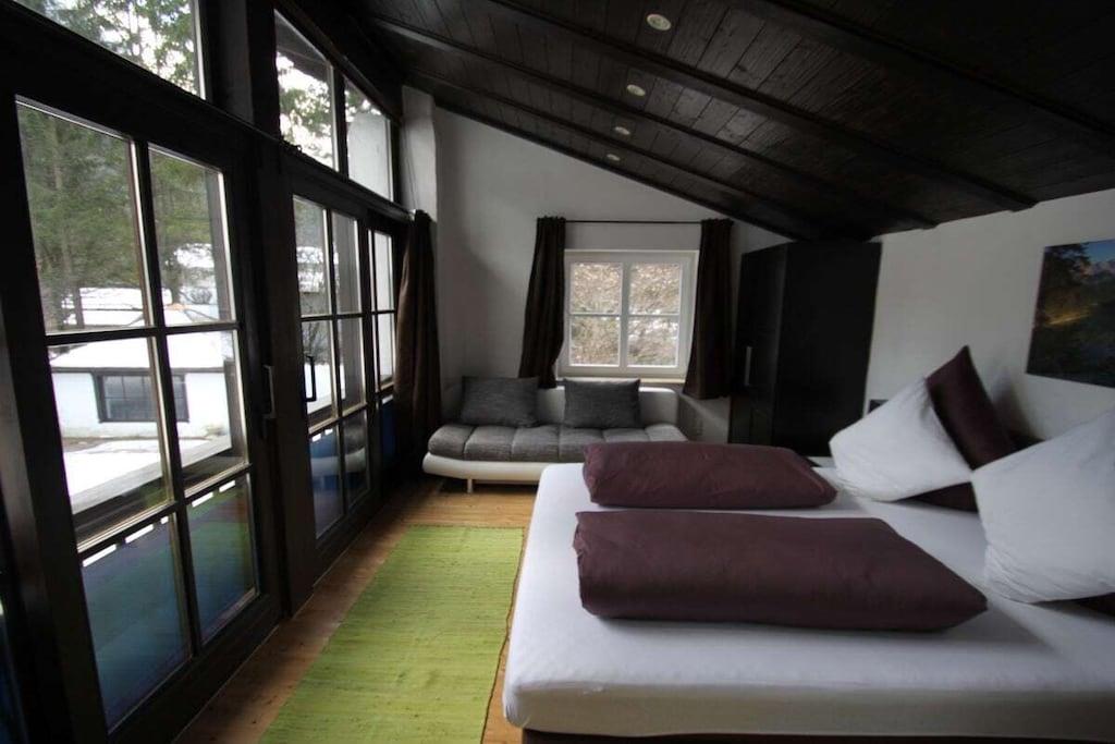 Komfortabel og rummelig ferielejlighed i Grainau på cirka 95 kvm med 3 soveværelser, ideel til 6-8 gæster. Der er 2 badeværelser/brusere med toiletter. Køkkenet er udstyret med køleskab/fryser, 4-brænder keramisk kogeplade med ovn og mikrobølgeovn, køleskab/fryser-kombination og opvaskemaskine. Stuen har sofaer. Satellit-tv og Wi-Fi er også tilgængeligt. 2 separate balkoner, herunder en med udsigt over Zugspitze.
