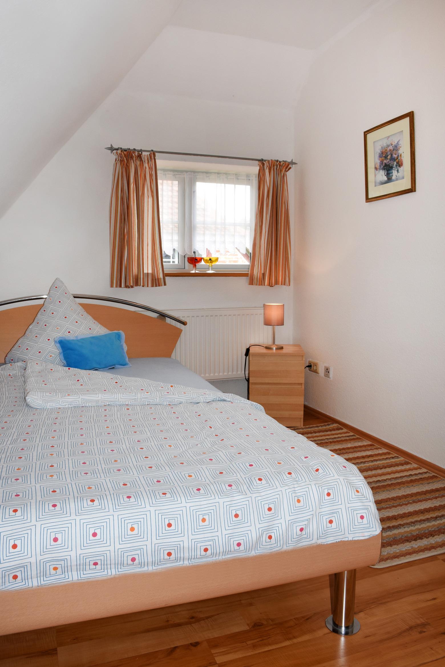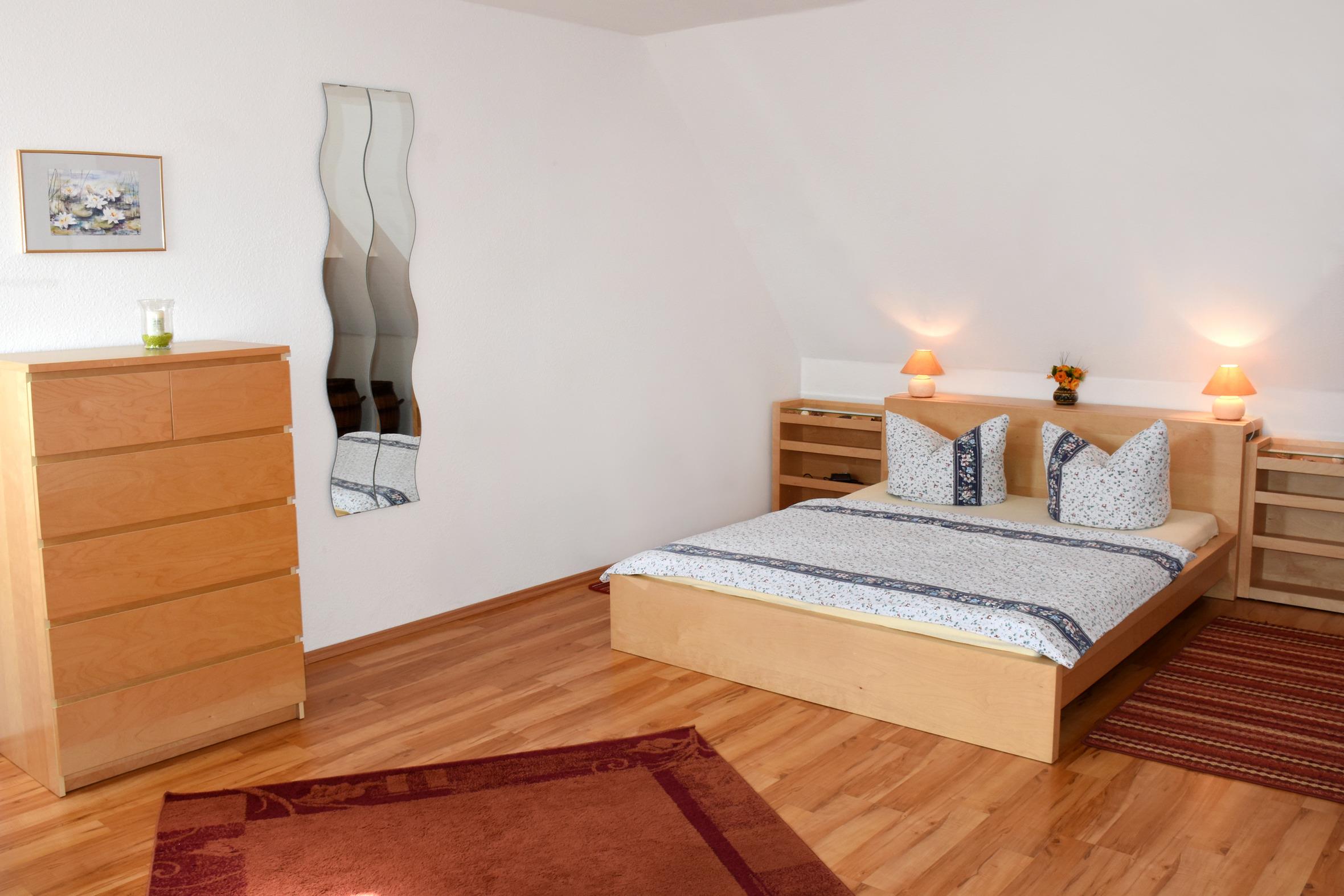 Die 100 m² große Wohnung "Sine tempore" bietet Platz für 6 Personen. Das große, offene Wohnzimmer mit Sitzgarnitur, Sat-TV und Radio-CD-Player befindet sich im Erdgeschoss. Von hier aus erreichen Sie die Terrasse des Hauses. Auch die zum Wohnzimmer hin offene Küche mit Essecke befindet sich in der unteren Etage. Im Obergeschoss befinden sich ein Bad mit Badewanne und WC sowie drei Schlafzimmer mit je einem Doppelbett. Eines der Zimmer verfügt zusätzlich über eine Schlafcouch und ein Kinderbett.