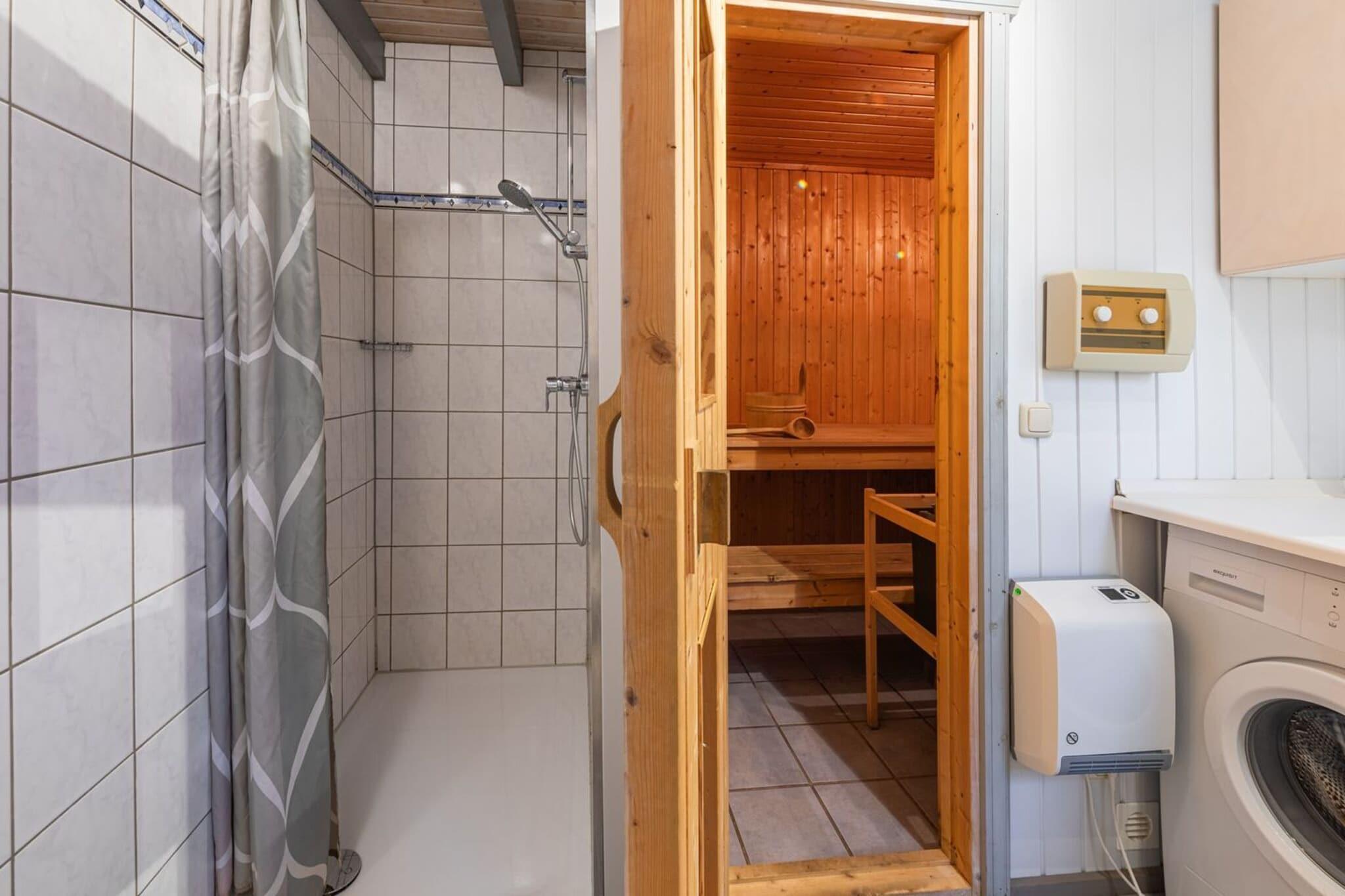Stueetage: (Stue(Fjernsyn(parabol), pejs, sofahjørne), Køkken(spisebord, kogeplade, elkedel, brødrister, kaffemaskine, ovn, mikrobølgeovn, køleskab(+ fryser)), soveværelse(dobbeltseng), badeværelse(badekar, bruser, sauna(privat), håndvask, toilet), pulterkammer) På 1. etage: (soveværelse(enkeltseng, enkeltseng), svalegang soveværelse(halvandenmandsseng)) tørretumbler(deles med andre gæster, betalt), vaskemaskine(deles med andre gæster, betalt), varme(elektrisk), terrasse(overdækket), have, havemøbler, solstole, parkering, swimmingpool(deles med andre gæster, betalt), barnestol, baby crib(paid), Håndklæder/sengelinned (ekstra gebyr)