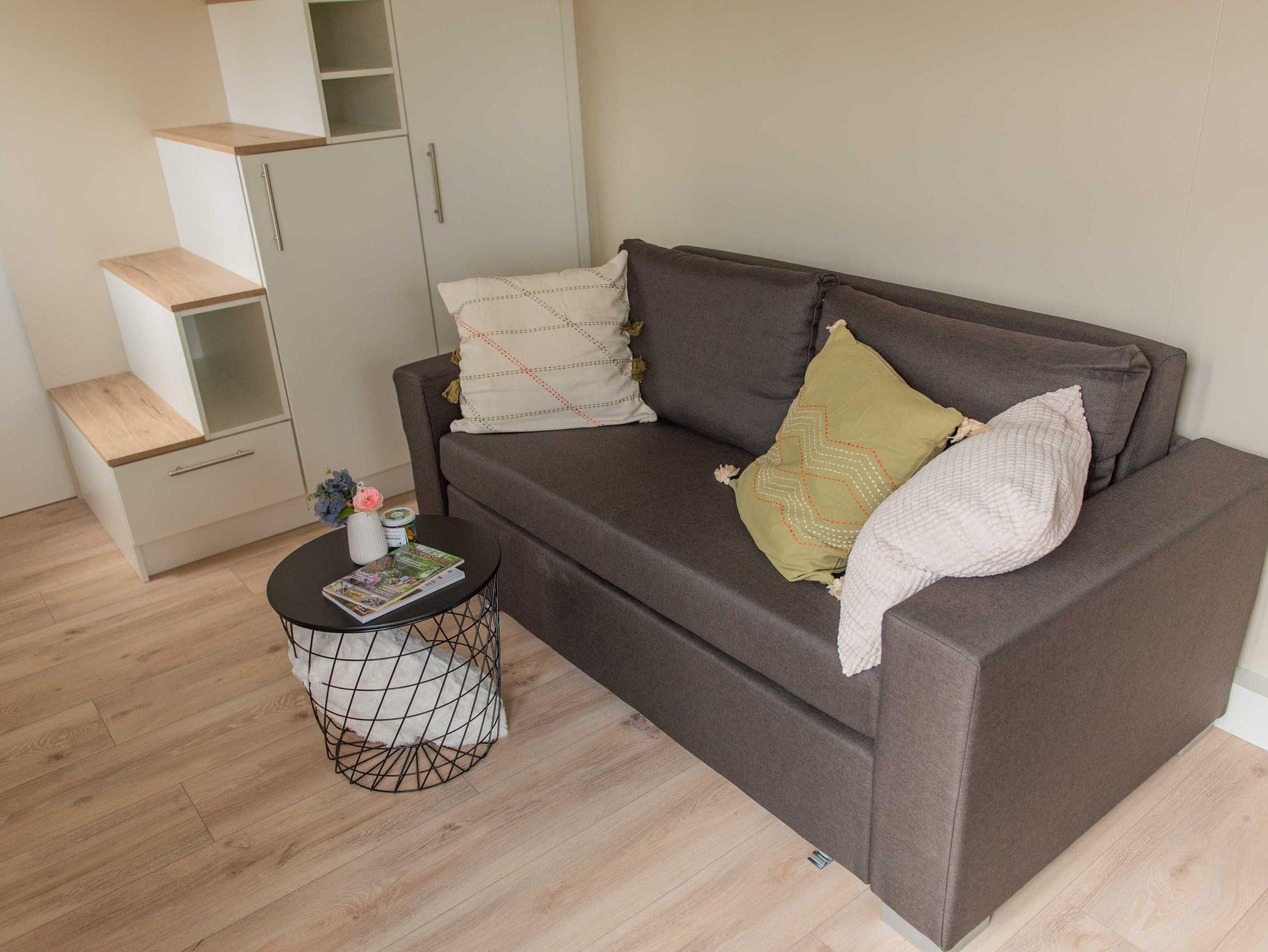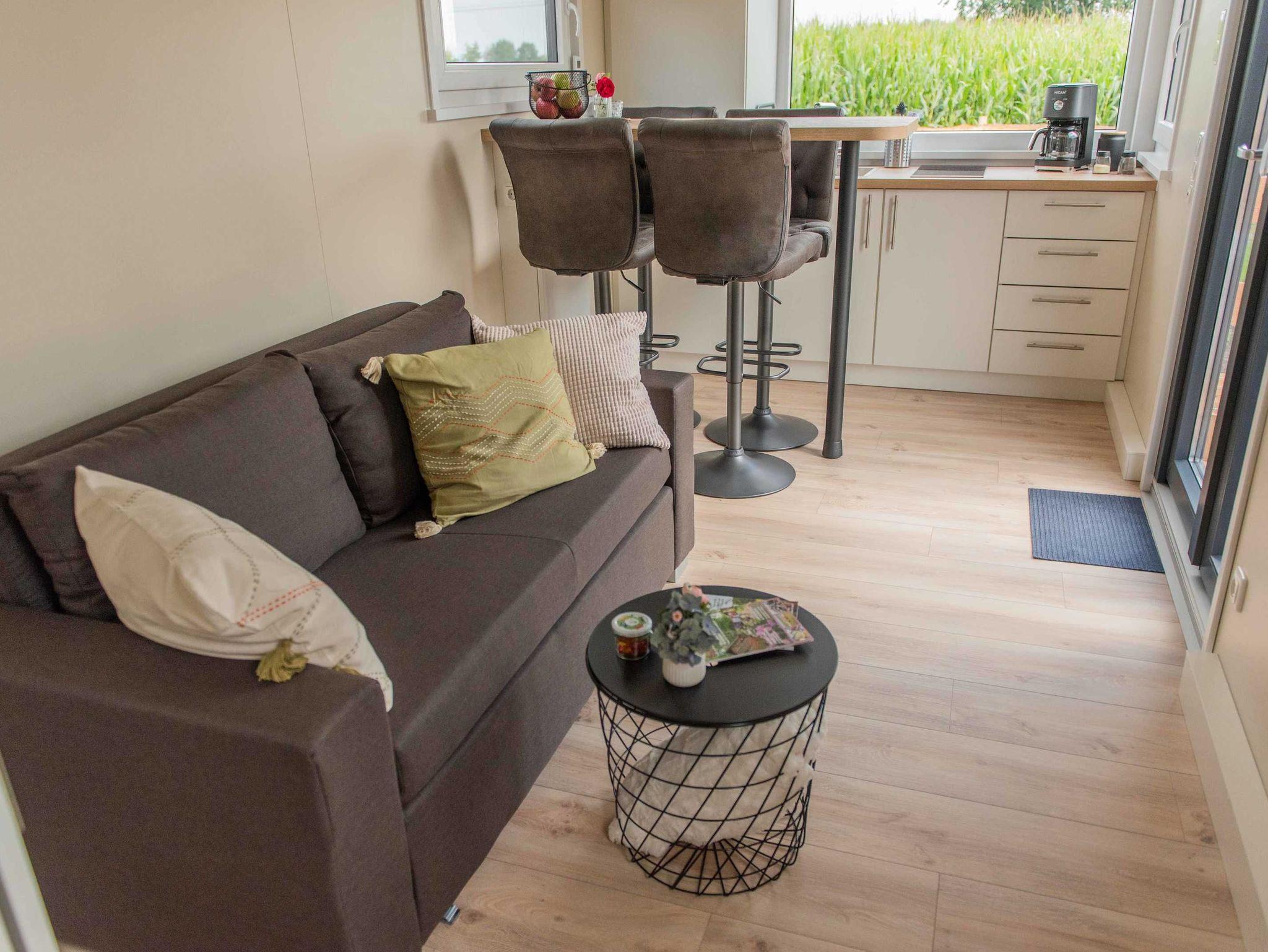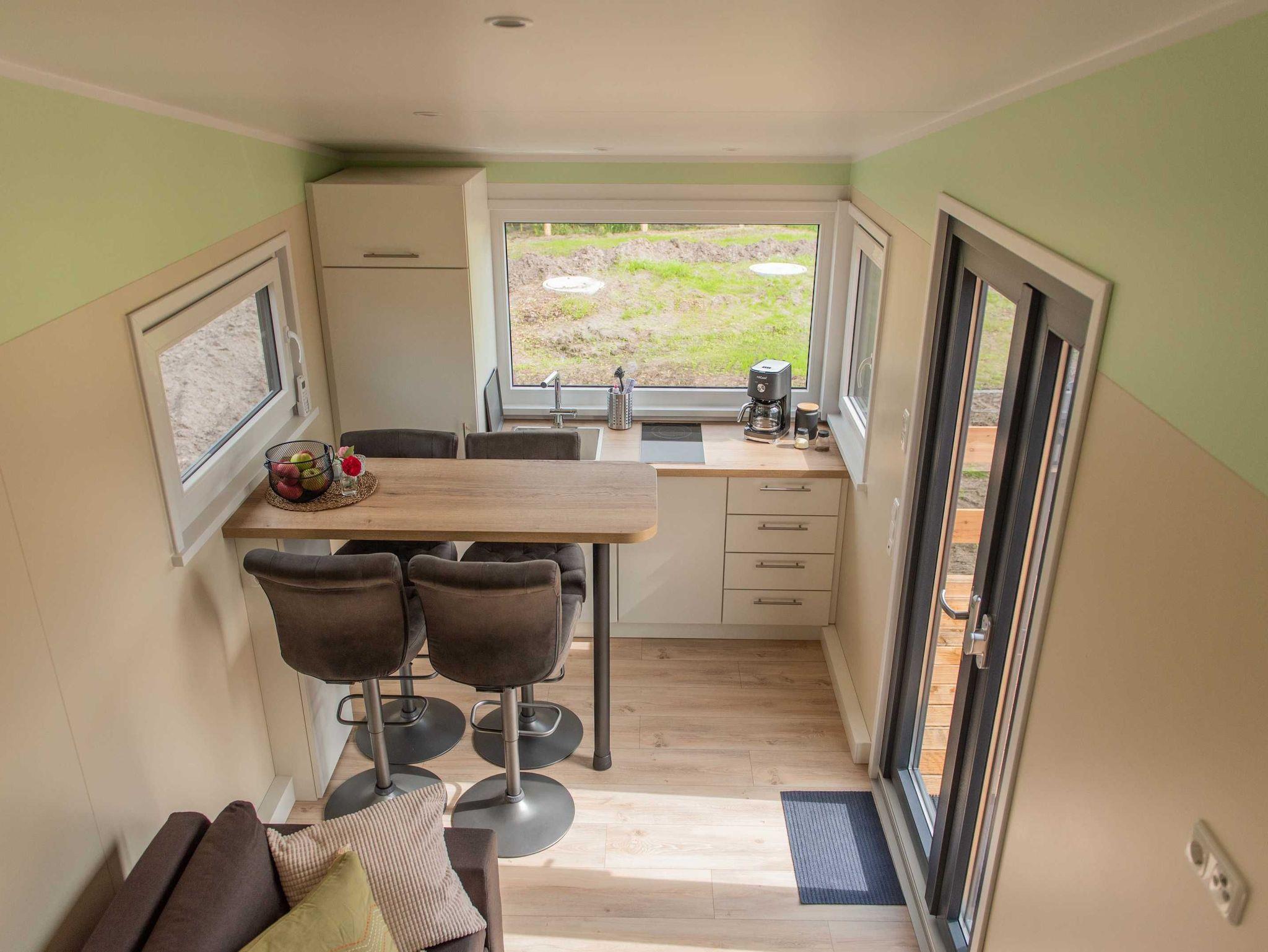Modern und komfortabel ist unser ganz neues Tiny-Haus und bietet auf 23 qm Platz für bis zu vier Personen. Unten gibt es eine komplett ausgestattete Küchenzeile mit Herd und Kühlschrank, eine bequeme Schlafcouch (1,40 cm) und ein Bad mit Dusche und WC. Über eine Treppe errreicht man die gemütliche Schlafempore.