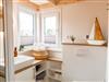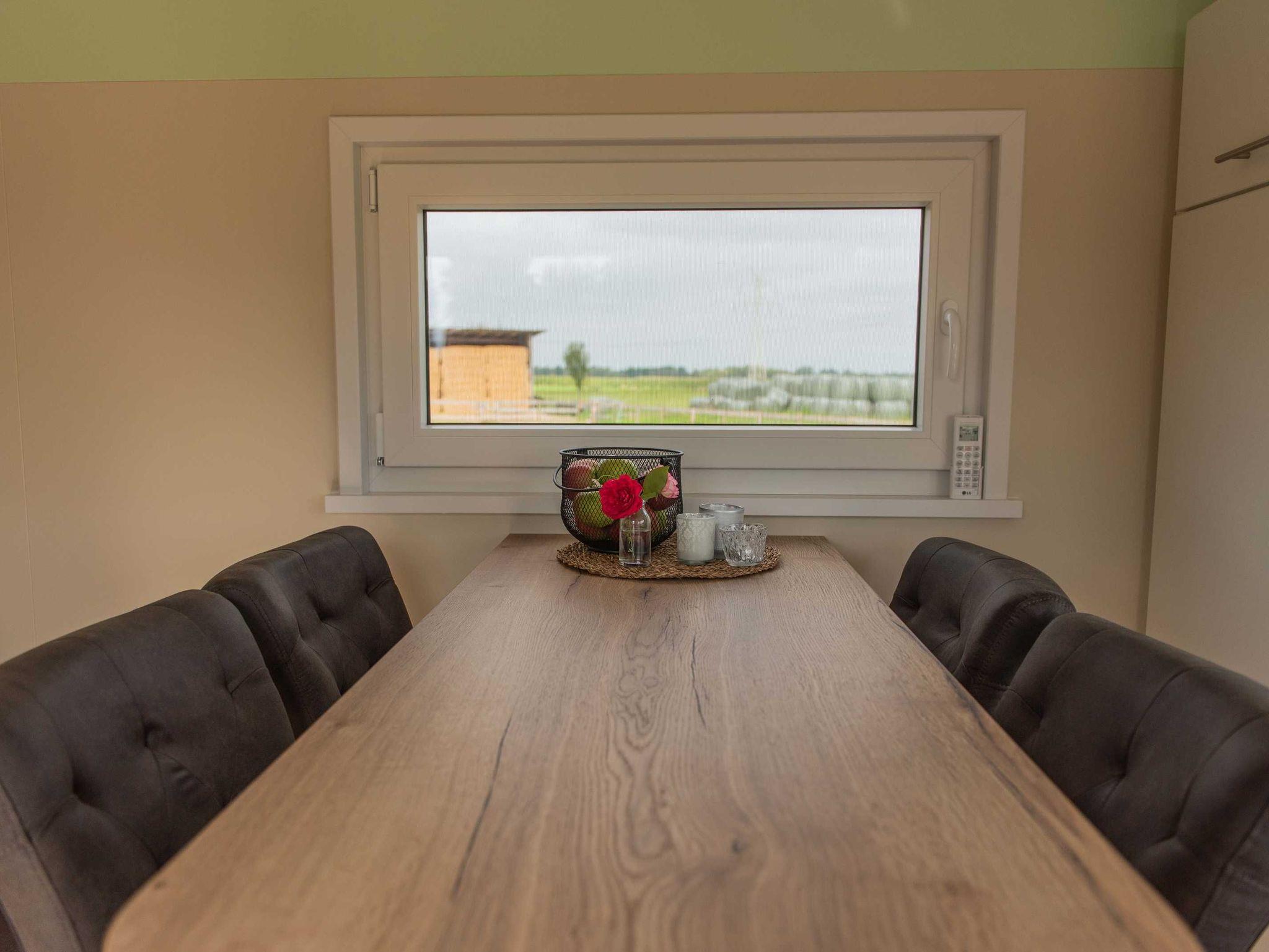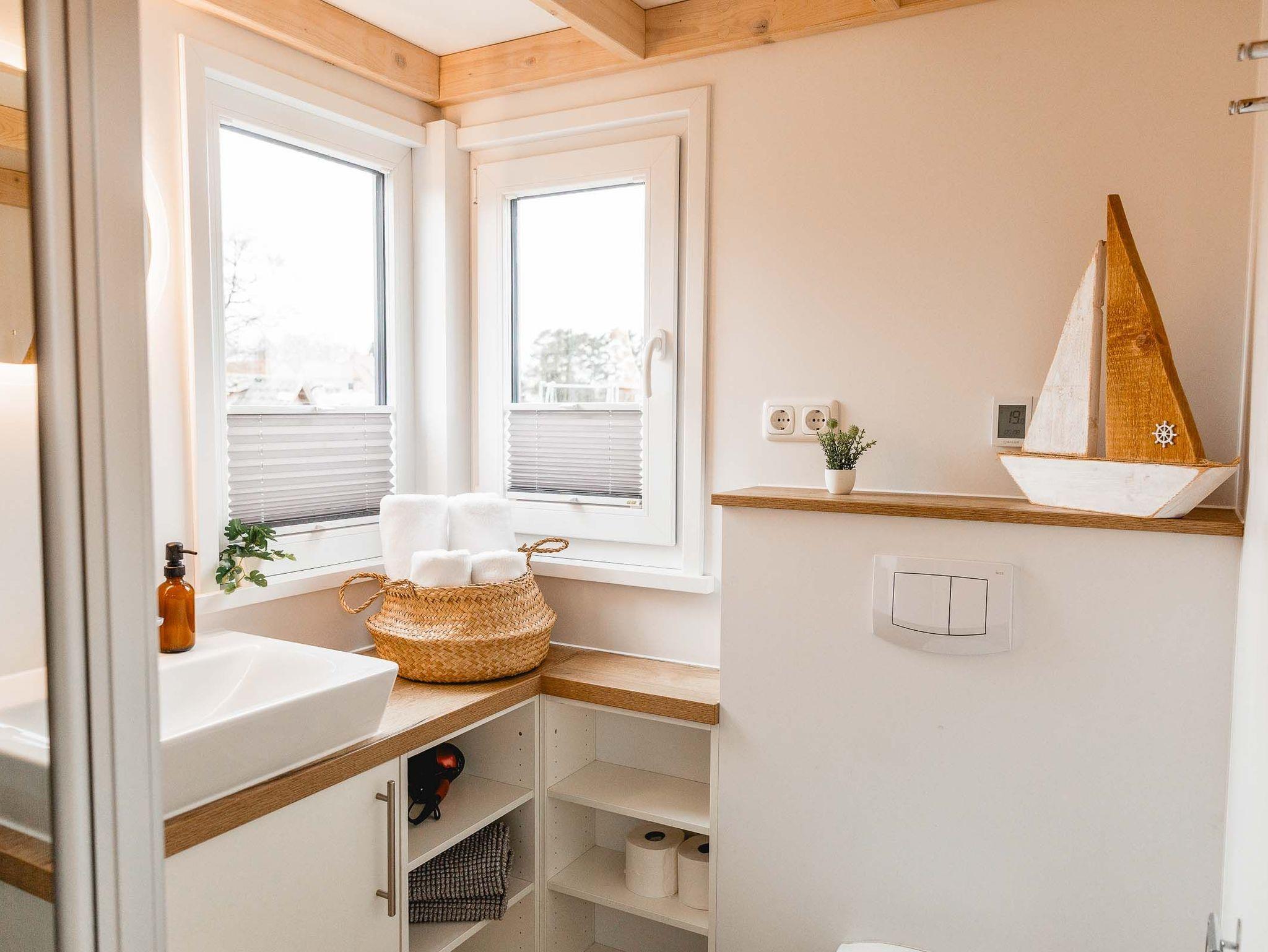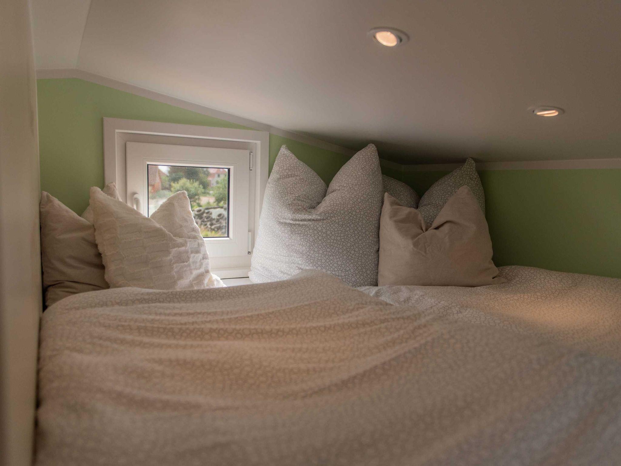 Modern und komfortabel ist unser ganz neues Tiny-Haus und bietet auf 23 qm Platz für bis zu vier Personen. Unten gibt es eine komplett ausgestattete Küchenzeile mit Herd und Kühlschrank, eine bequeme Schlafcouch (1,40 cm) und ein Bad mit Dusche und WC. Über eine Treppe errreicht man die gemütliche Schlafempore.