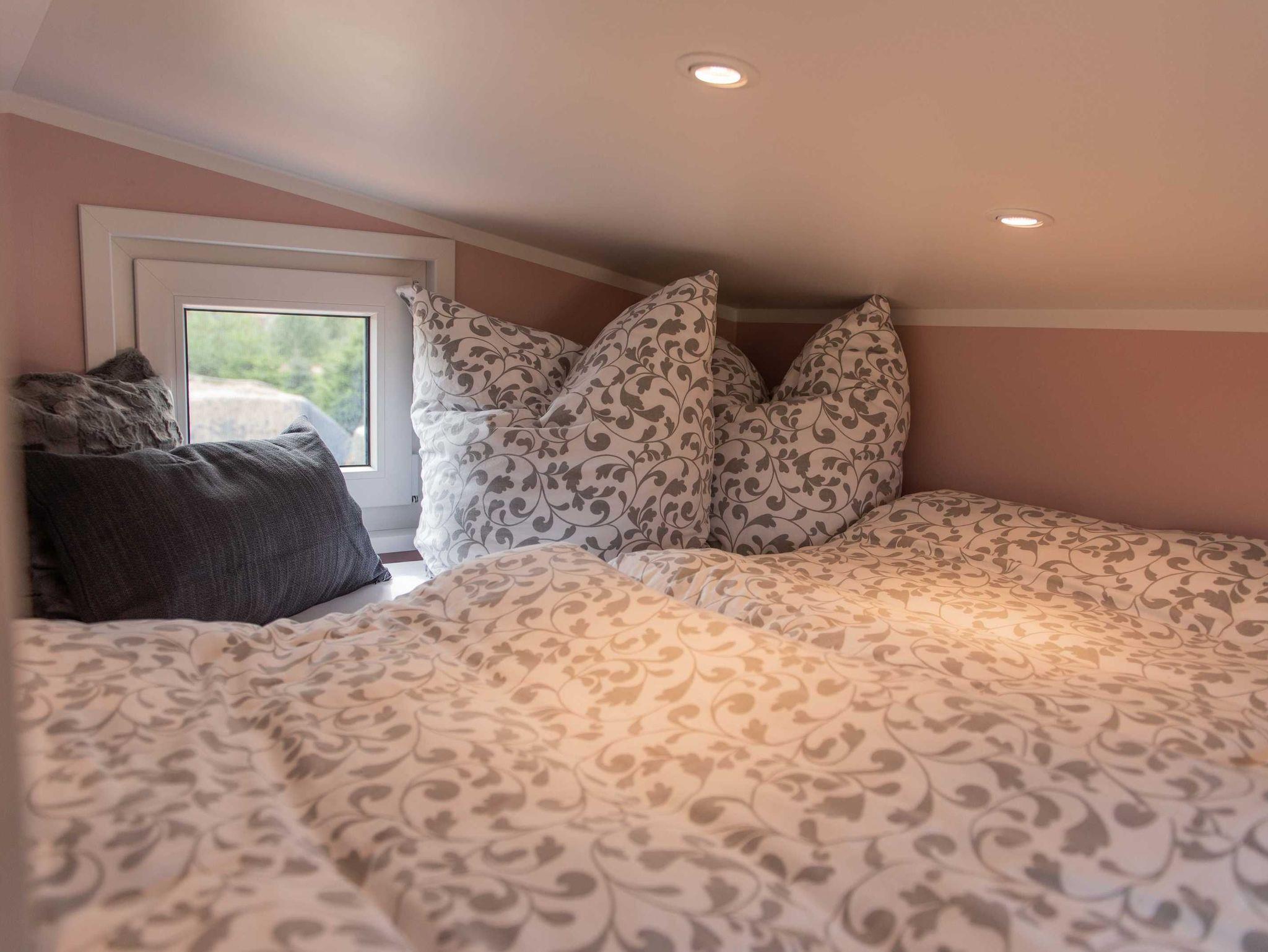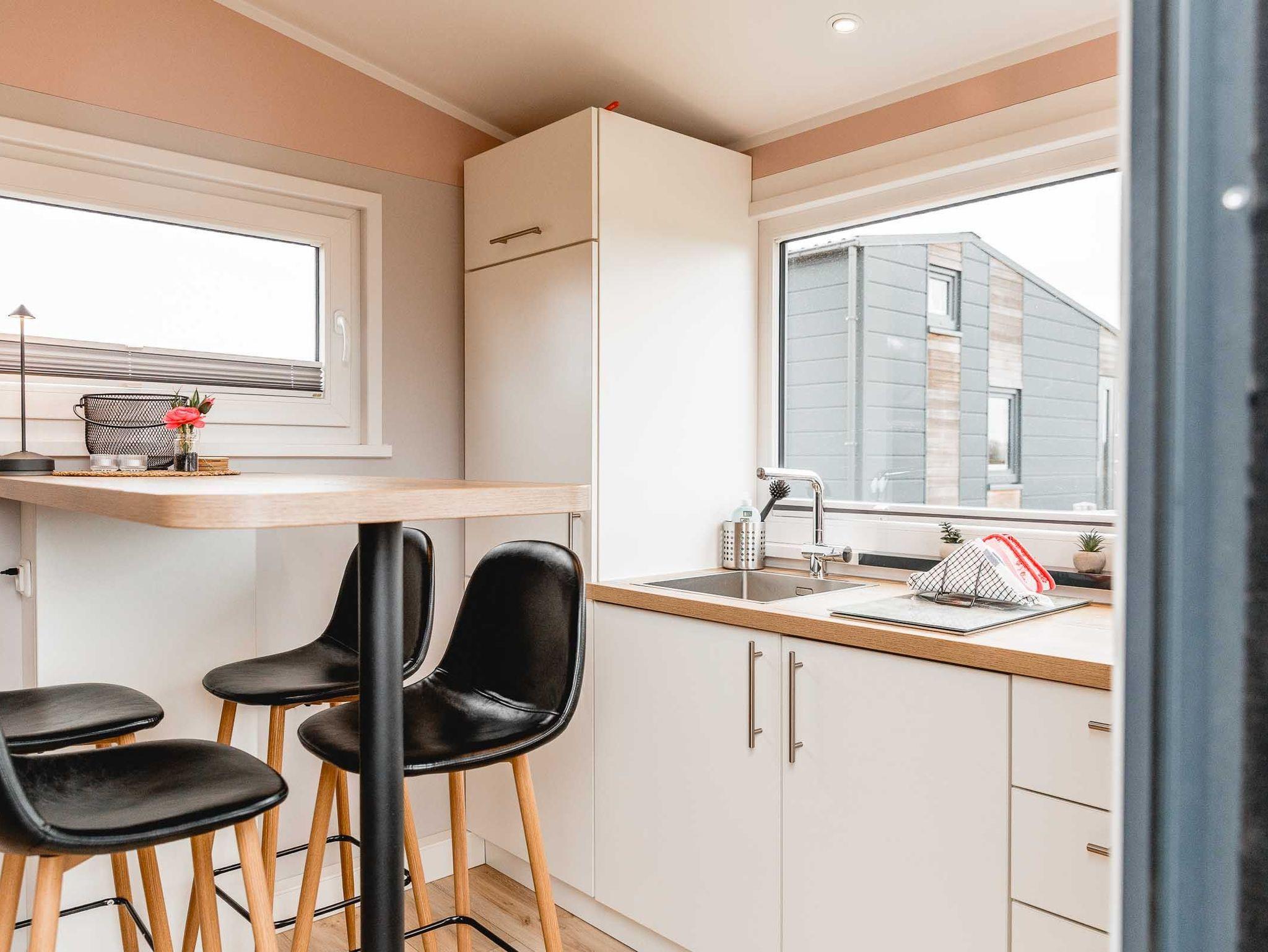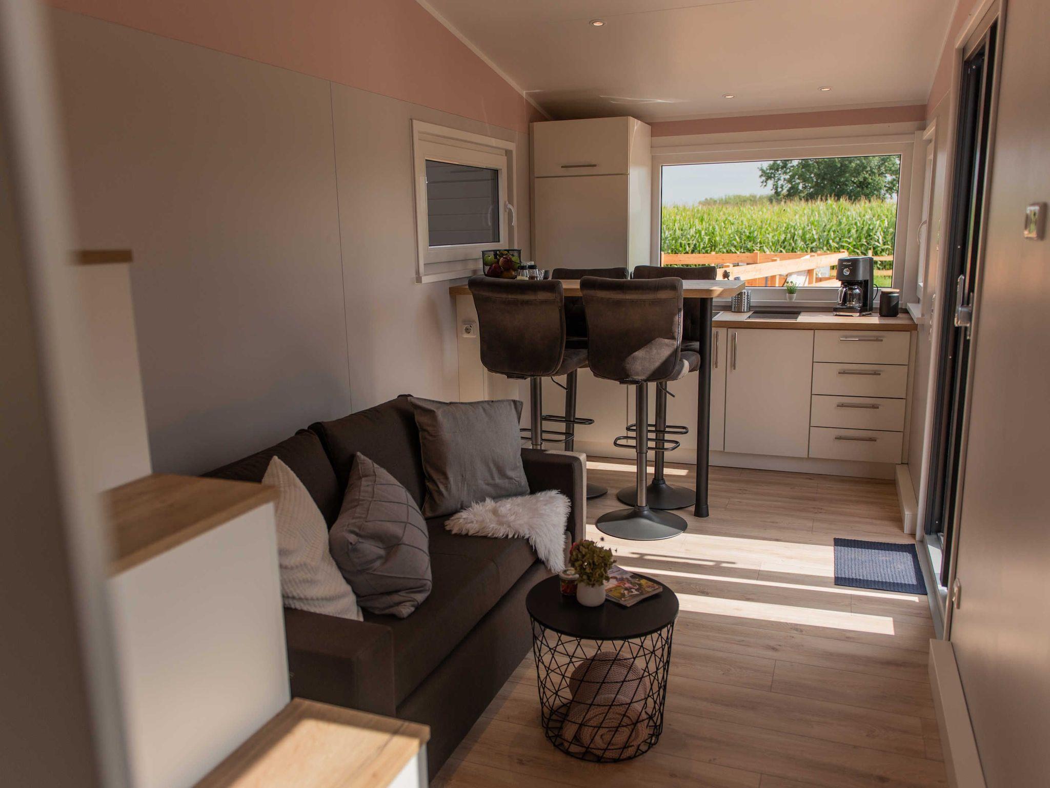 Modern und komfortabel ist unser ganz neues Tiny-Haus und bietet auf 23 qm Platz für bis zu vier Personen. Unten gibt es eine komplett ausgestattete Küchenzeile mit Herd und Kühlschrank, eine bequeme Schlafcouch (1,40 cm) und ein Bad mit Dusche und WC. Über eine Treppe errreicht man die gemütliche Schlafempore.