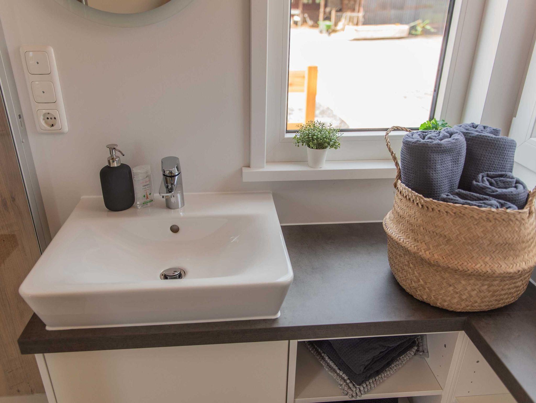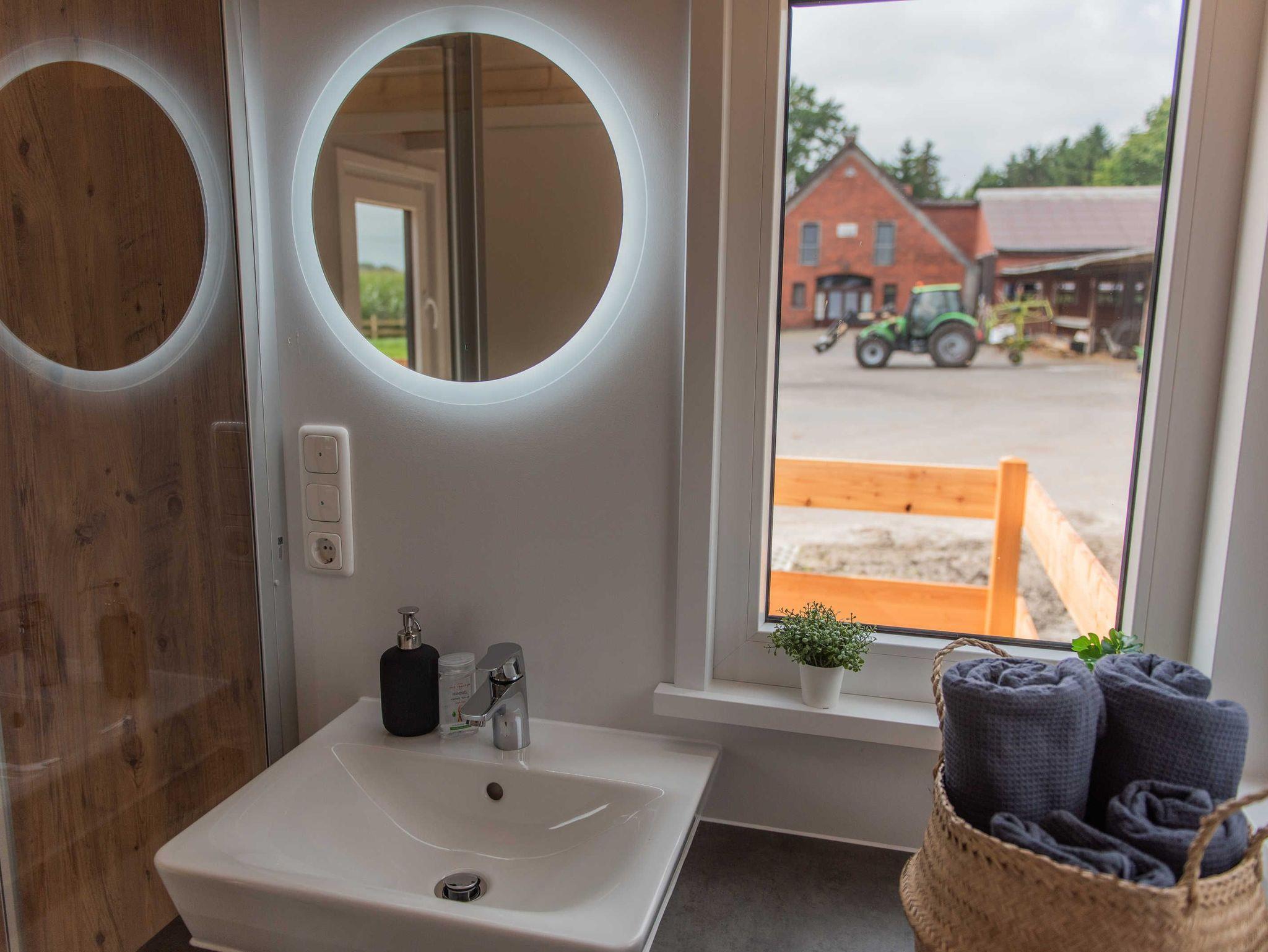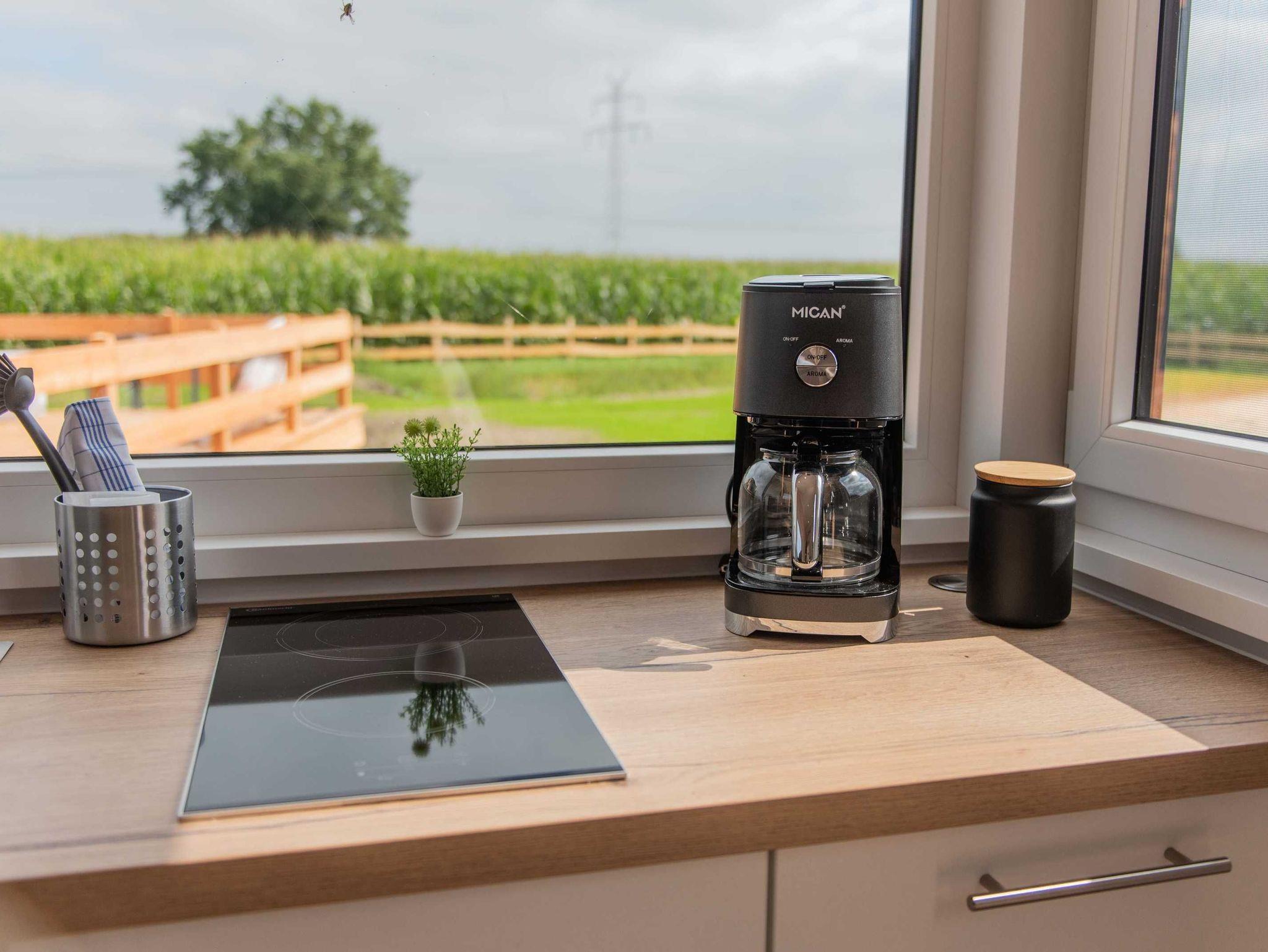 Modern und komfortabel ist unser ganz neues Tiny-Haus und bietet auf 23 qm Platz für bis zu vier Personen. Unten gibt es eine komplett ausgestattete Küchenzeile mit Herd und Kühlschrank, eine bequeme Schlafcouch (1,40 cm) und ein Bad mit Dusche und WC. Über eine Treppe errreicht man die gemütliche Schlafempore.