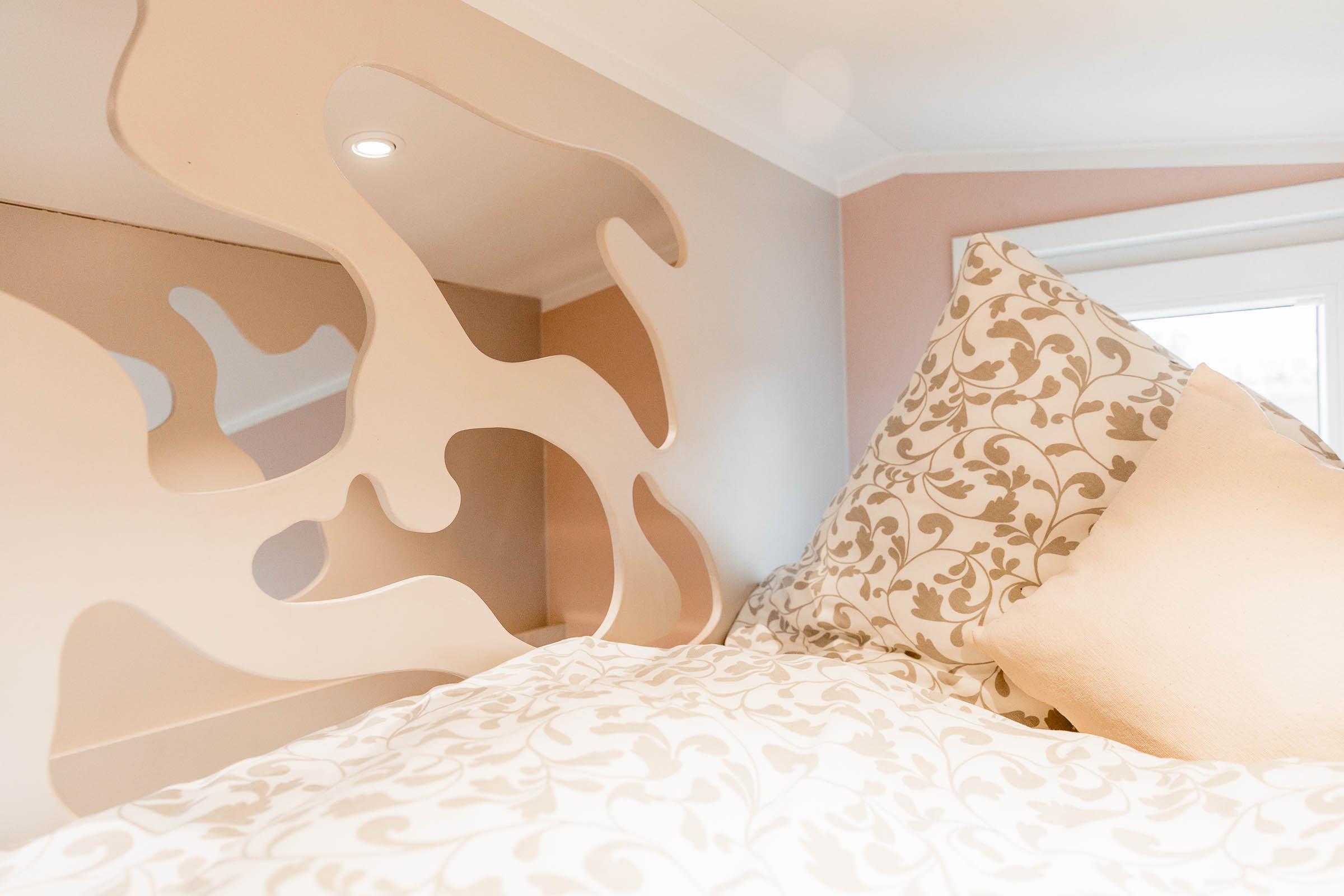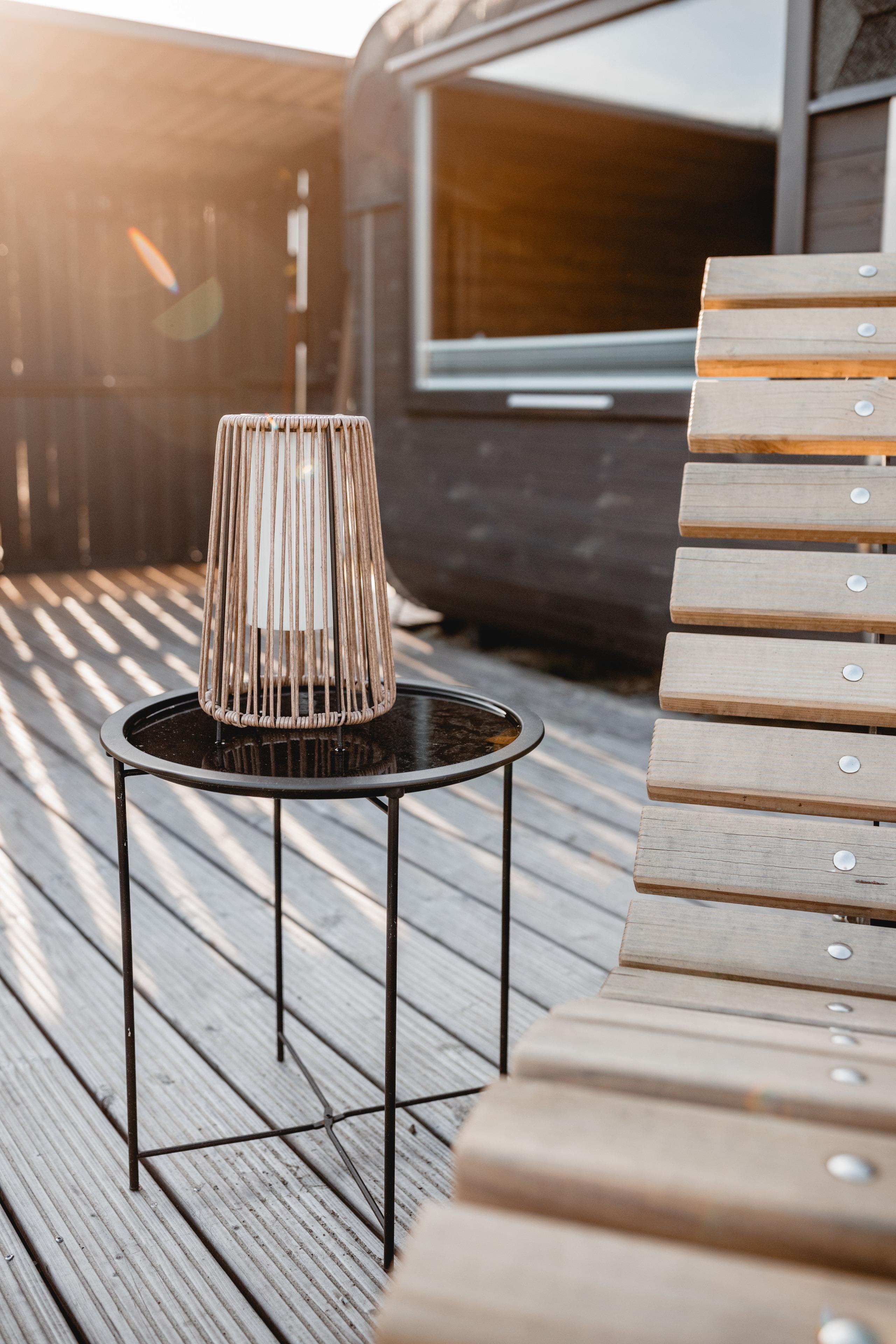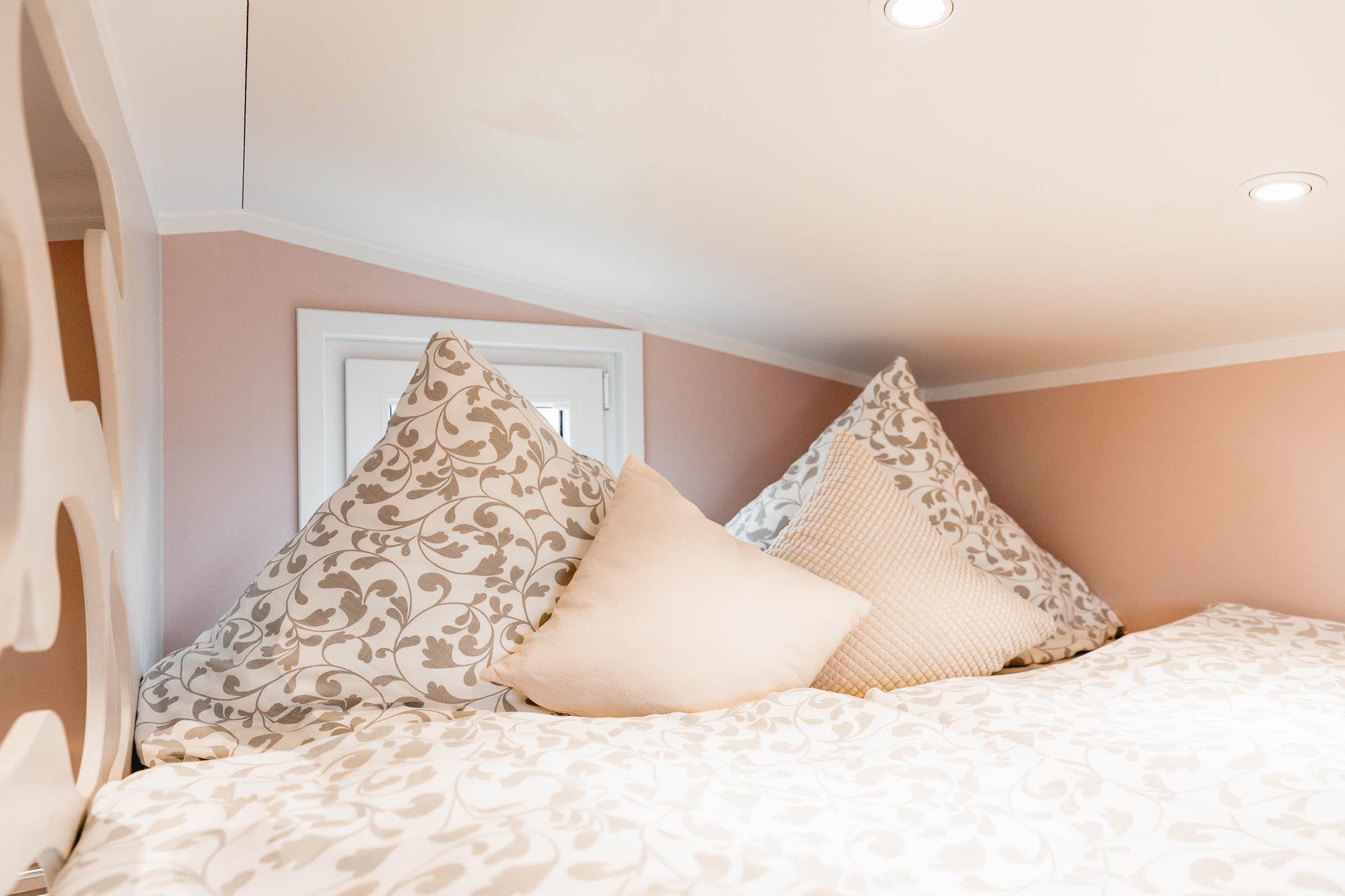 Es bietet auf 23 qm Platz für bis zu 4 Personen. Unten gibt es eine komplett ausgestattete Küchenzeile mit Herd und Kühlschrank, eine bequeme Schlafcouch (1,40 cm) und ein Bad mit Dusche und WC. Über eine Treppe erreicht man die gemütliche Schlafempore. Die 12 qm große Terrasse ist zudem eine Verlängerung des Wohnraumes nach draußen.