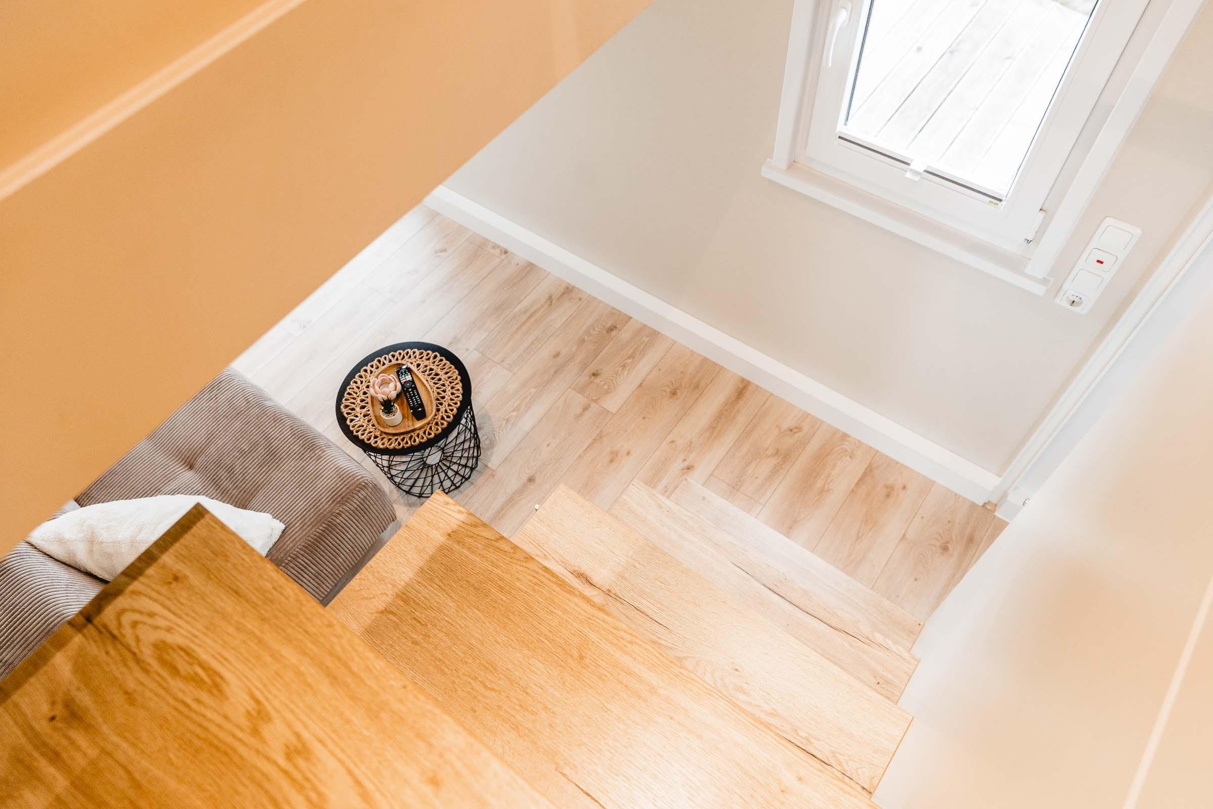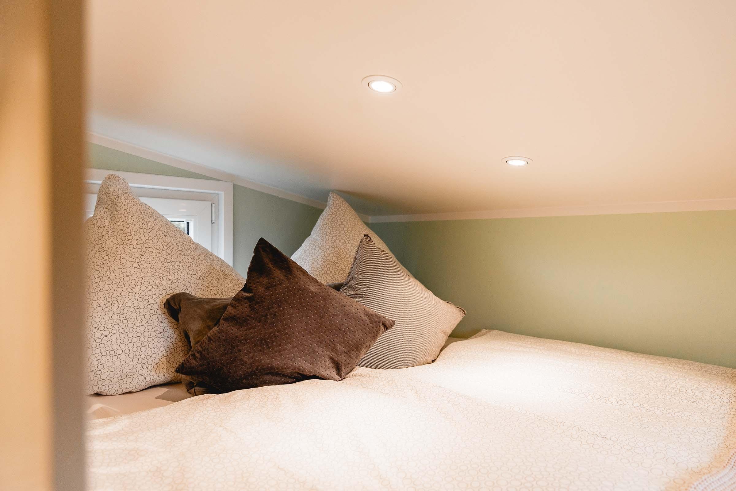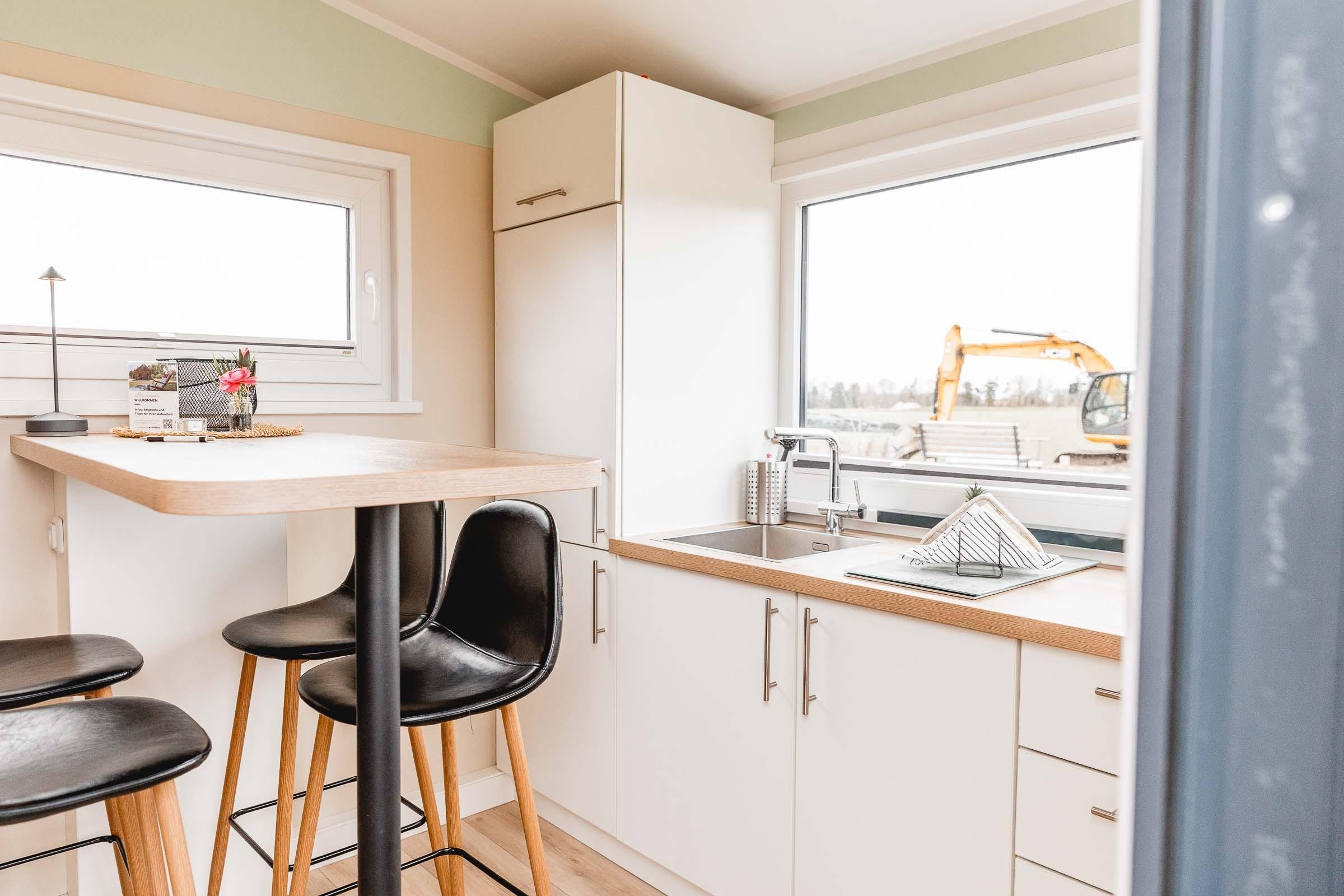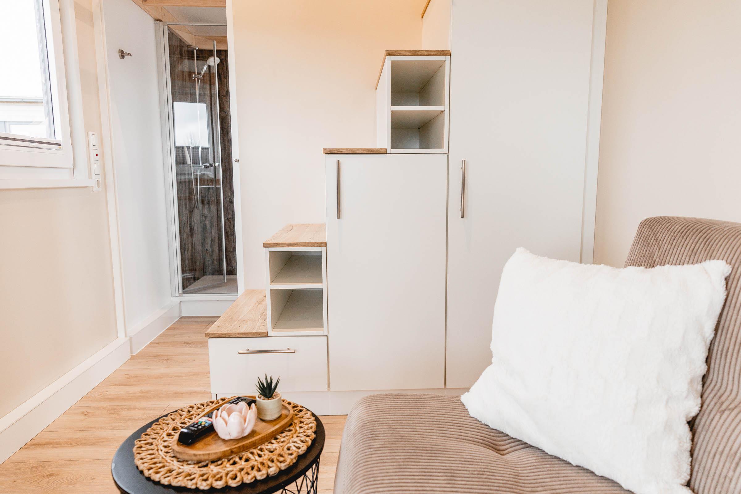 Es bietet auf 23 qm Platz für bis zu vier Personen. Unten gibt es eine komplett ausgestattete Küchenzeile mit Herd und Kühlschrank, eine bequeme Schlafcouch (1,40 cm) und ein Bad mit Dusche und WC. Über eine Treppe erreicht man die gemütliche Schlafempore. Die 12 qm große Terrasse ist zudem eine Verlängerung des Wohnraumes nach draußen.