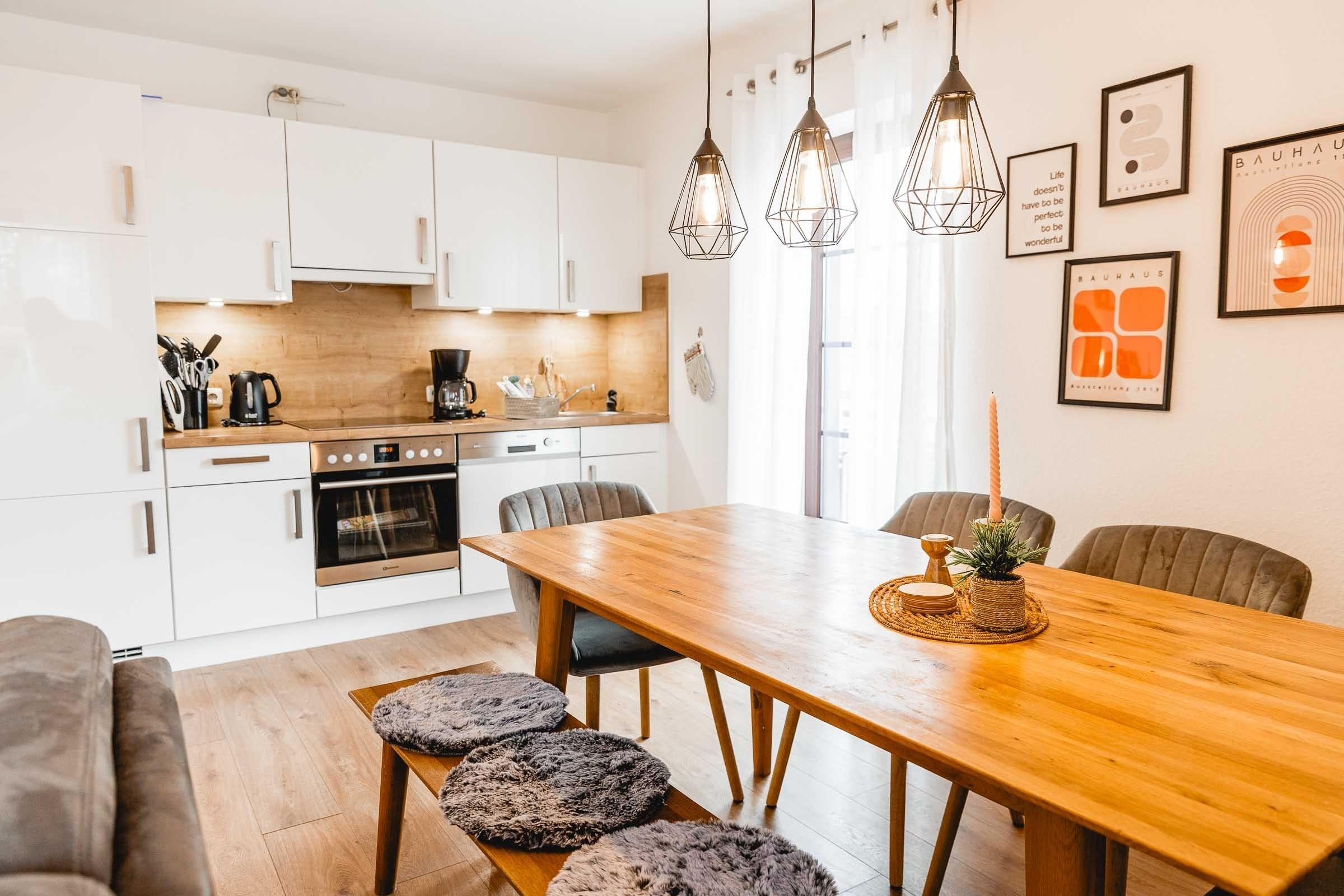 Die Küchenzeile ist komplett ausgestattet u. a. mit Geschirrspüler, Mikrowelle, Backofen, Cerankochfeld, Wasserkocher, Kaffeemaschine, Toaster, Eierkocher, Handrührgerät, Küchenwaage und Flaschenwärmer.