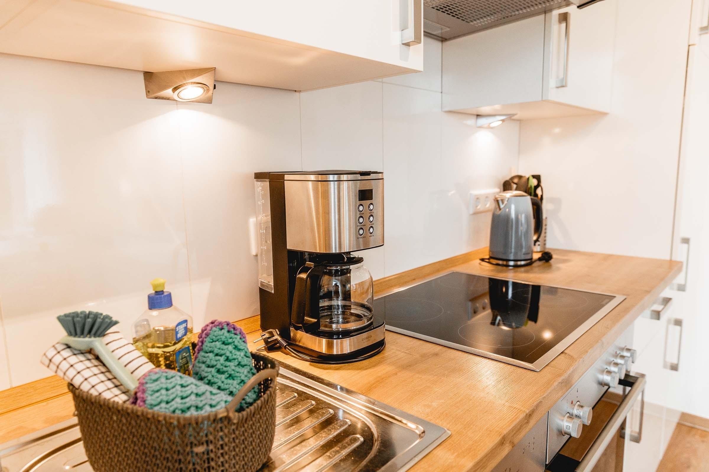 Die komplett ausgestattete Küchenzeile verfügt u. a. über Geschirrspüler, Backofen, Cerankochfeld, Küchlschrank mit Gefrierfach, Kaffeemaschine, Wasserkocher, Eierkocher, Küchenwaage, Handrührgerät.