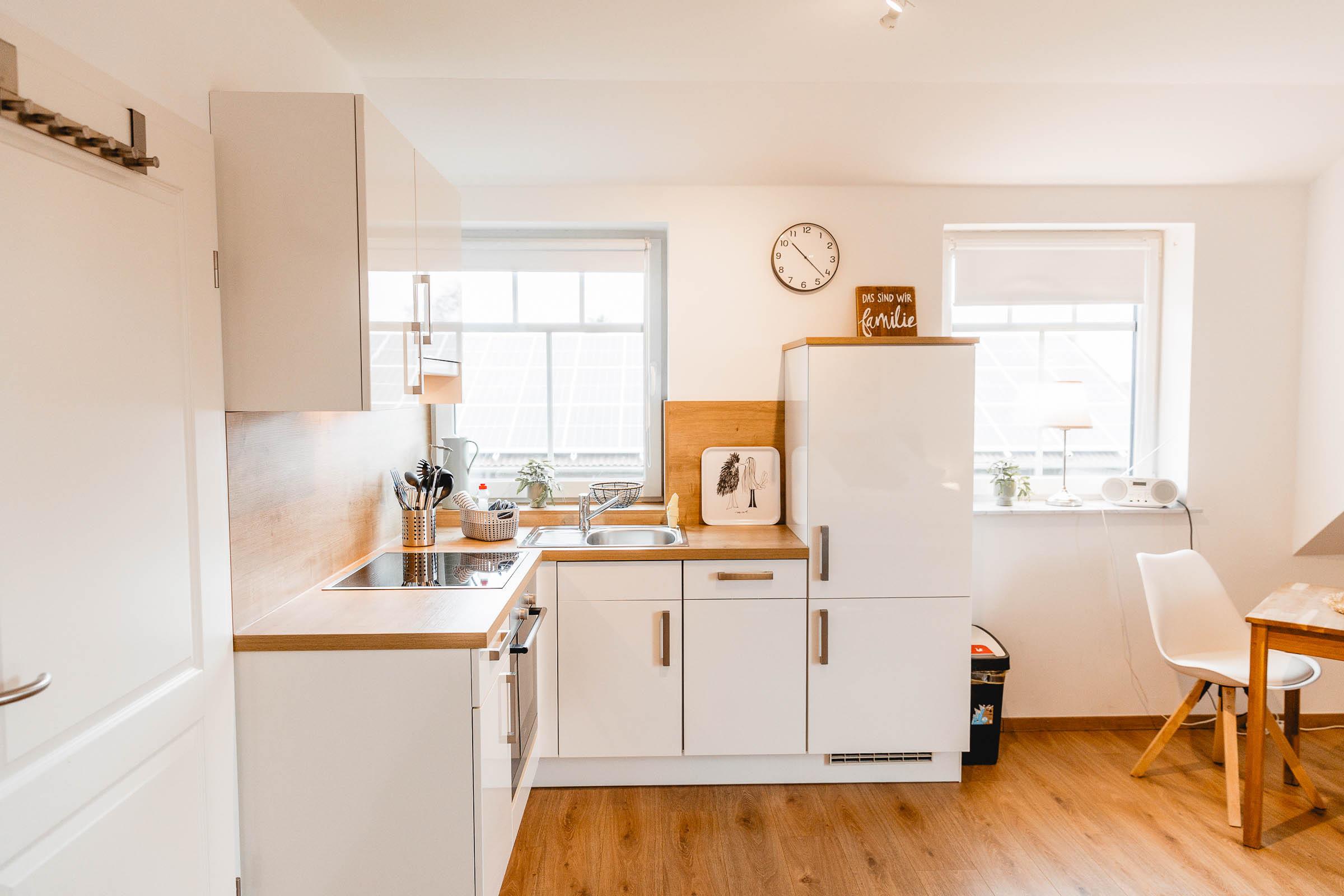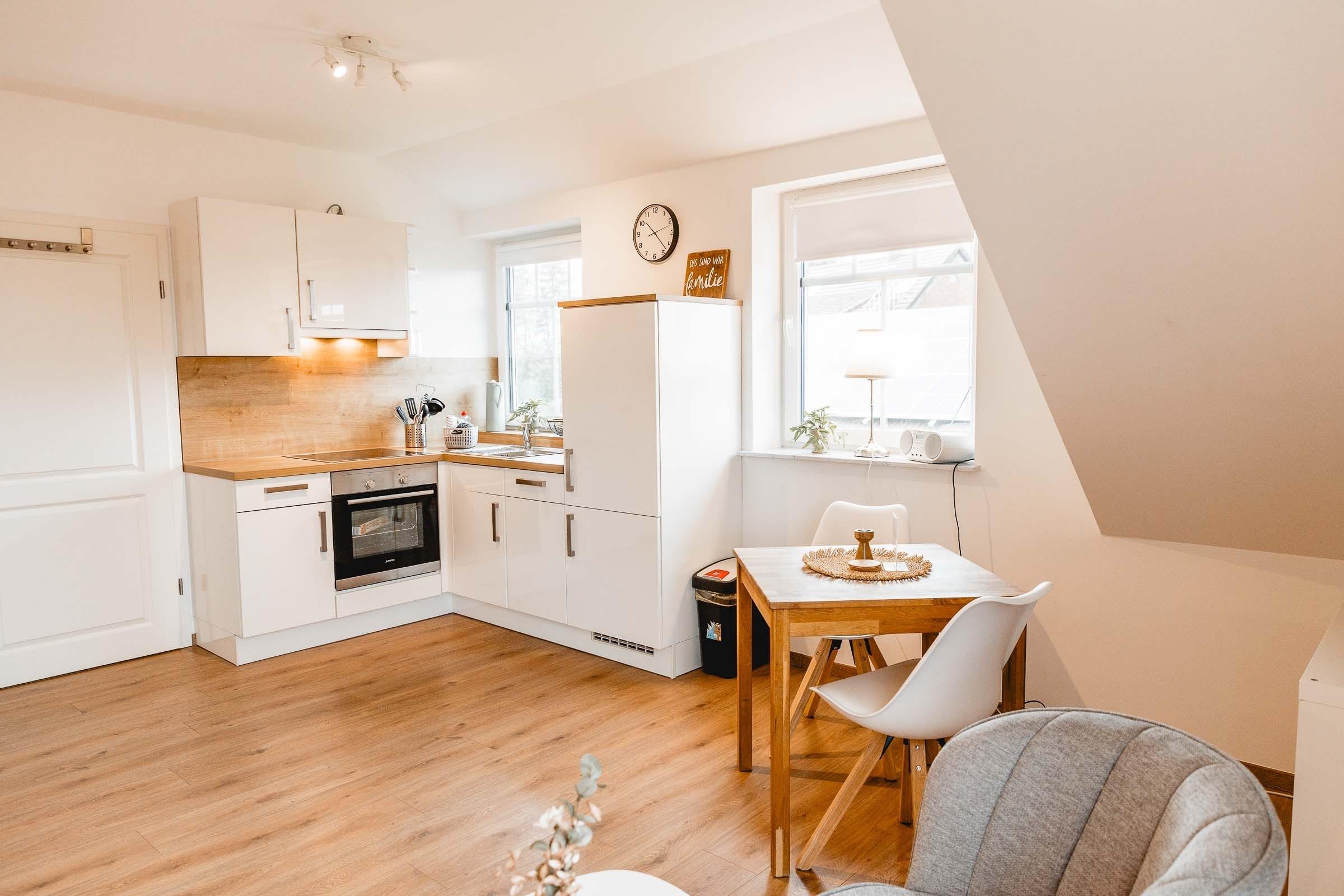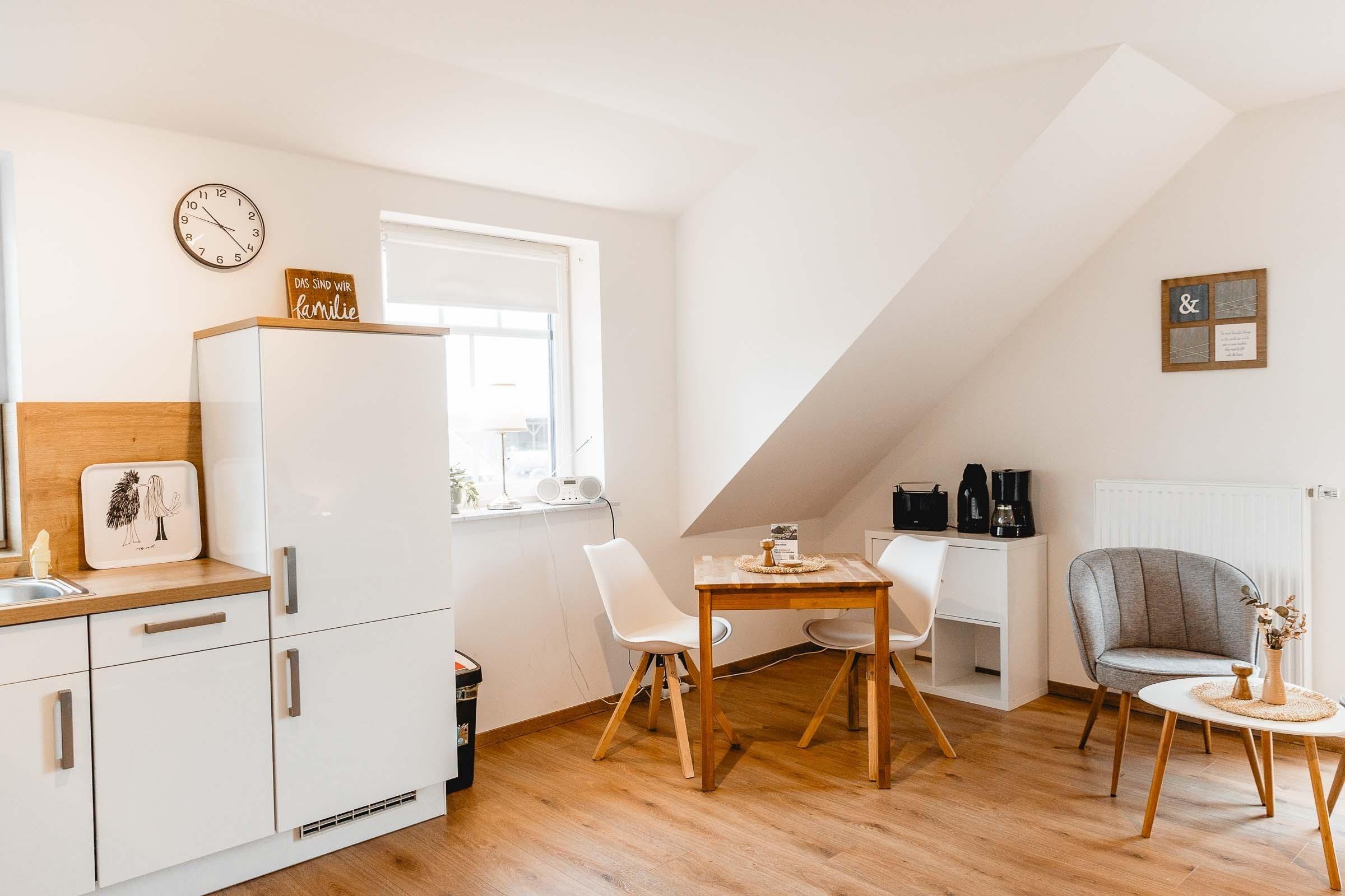 Das Apartment Schwalbennest ist 32 qm groß und bietet Platz für zwei Personen. In dem gemütlichen Wohn/Schlafraum befindet sich ein bequemes Schlafsofa (160 x 200 cm) sowie eine komplett ausgestattete Küchenzeile mit Backofen, Cerankochfeld, Kühlschrank mit Gefrierfach, Kaffeemaschine, Wasserkocher, Toaster und Eierkocher.