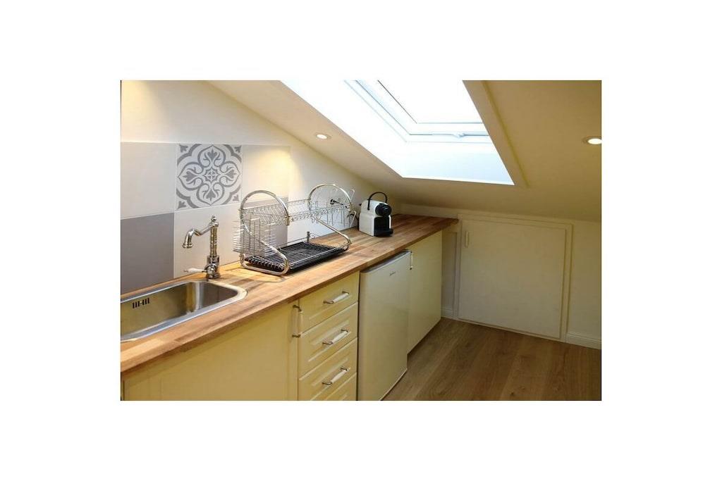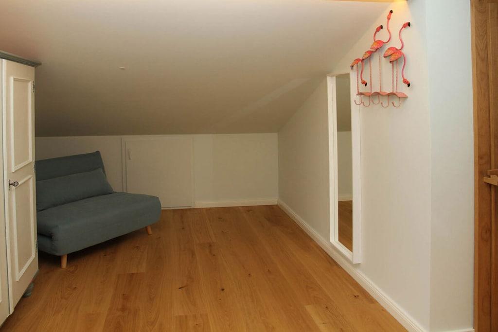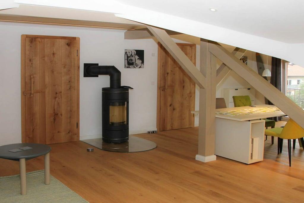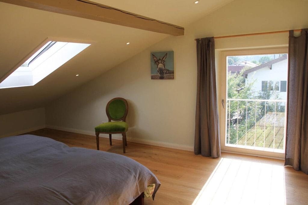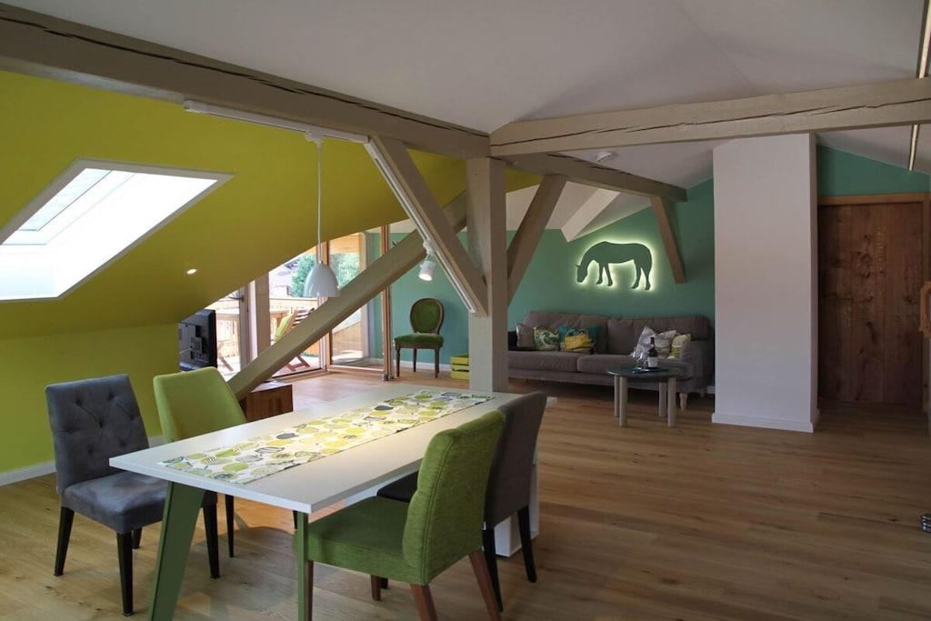 Neu gebaute Dachgeschoss Suite auf 100m2 Geschossfläche. Es erwarten Sie individuell gestaltete Räume mit fantastischem Blick bis ins tiroler Kaisergebirge. Wir haben uns vom Arosa Kitzbühel und Farrow and Ball inspirieren lassen. Geeignet für Pärchen junge Familien mit kleinem Kind, die eine gehobene, moderne Ausstattung sowie ein individuelles Design (Mischung aus rustikalem Hütten -und englischen Landhausstil) schätzen. Es steht eine gemütliche Fasssauna zur Verfügung. Die Küche ist klein, aber fein, ausgestattet mit einem Backofengrill/Mikrowelle und einer Spülmaschine.