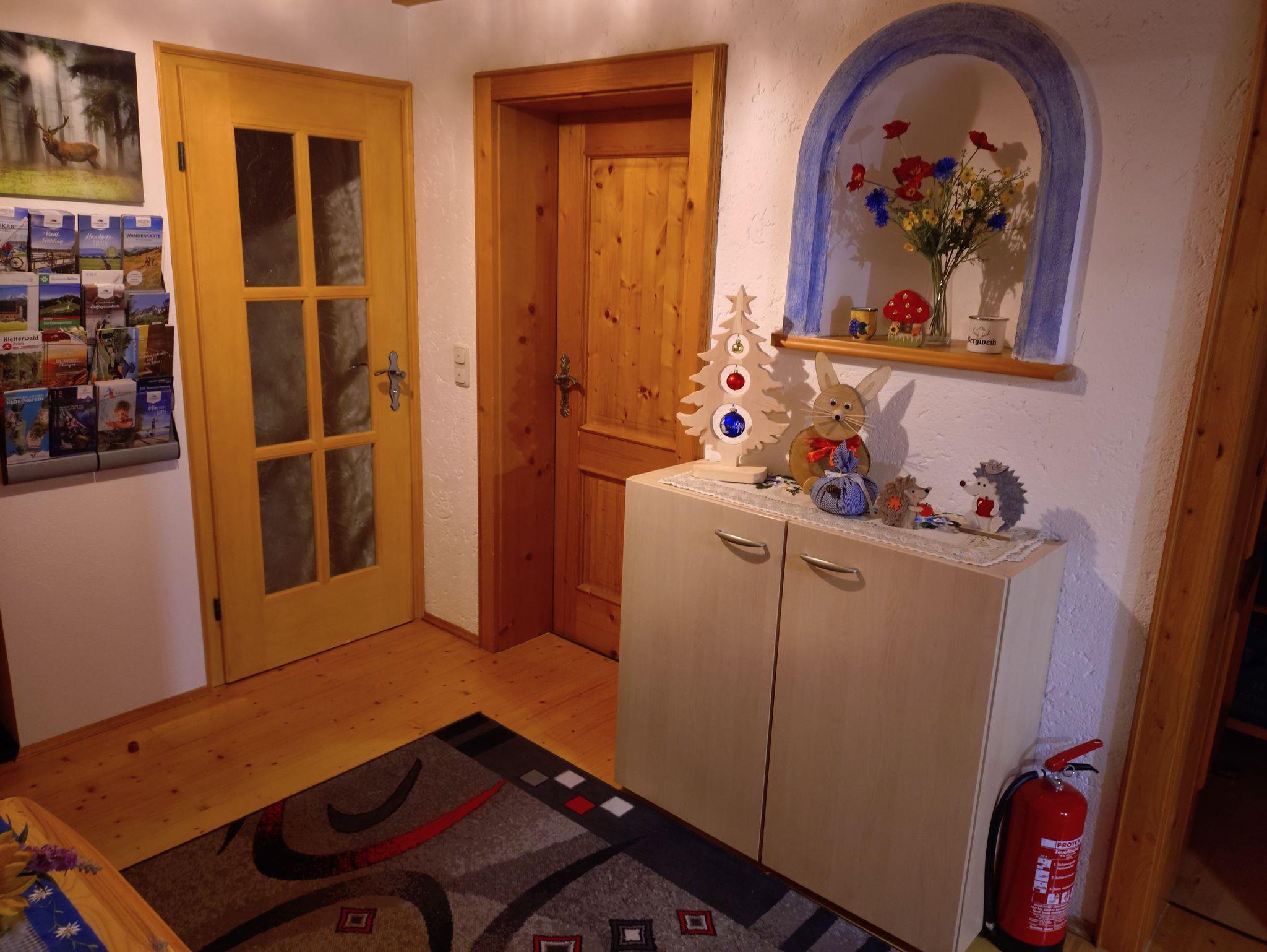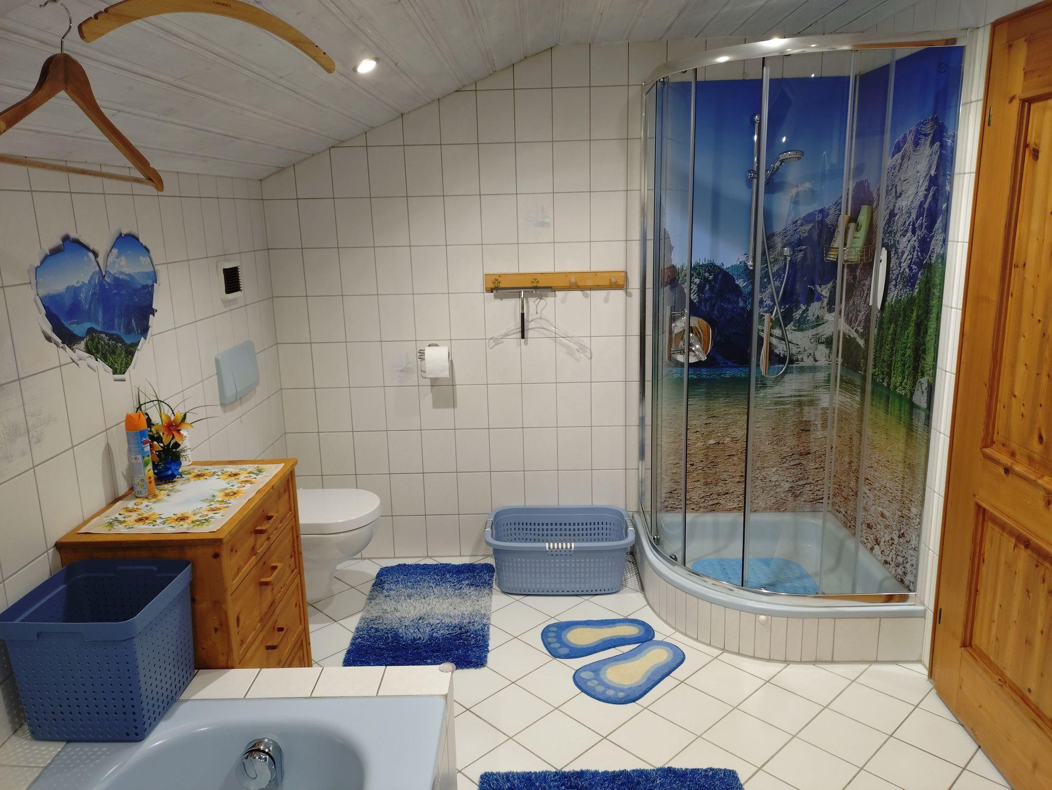 Neuerrichtete Ferienwohnung ( 90 qm) im 1.Stock vom Wohnhaus mit separaten Aussentreppen-Aufgang , 2 Schlafzimmer mit 3 bzw. 2 Betten, großzügiges gemütliches Wohnzimmer mit 26 qm im Landhausstil mit Couch (kann auch zusätlich als Schlafcouch umgelegt werden) 43 Fernseher 4 K mit Satellitenempfang, Tisch und Eckbank sowie zusätzliches Sofa. Und für romantische Abende kann ein Kaminofen mit Sichtfenster angefeuert werden. Neu eingerichtete Küche mit großem Kochfeld, Backofen, Dunstabzug, Kühlschrank, Kaffeemaschine, Brotmaschine, Wasserkocher, Radio usw. Ausserdem Esstisch in der Küche vorhanden mit Schiebetür zum Wohnzimmer mit Südbalkonzugang. Grillmöglichkeit im Garten, Grill, Sonnenschirm, Biertischgarnitur usw. vorhanden. Kostenloses WLAN und absperrbare Garage mit Elektro-Tor für Ihr Auto und Fahrräder inklusive. Stromanschluss in der Garage zum aufladen der E-Bike. Im Bad steht eine Waschmaschine zur Verfügung.