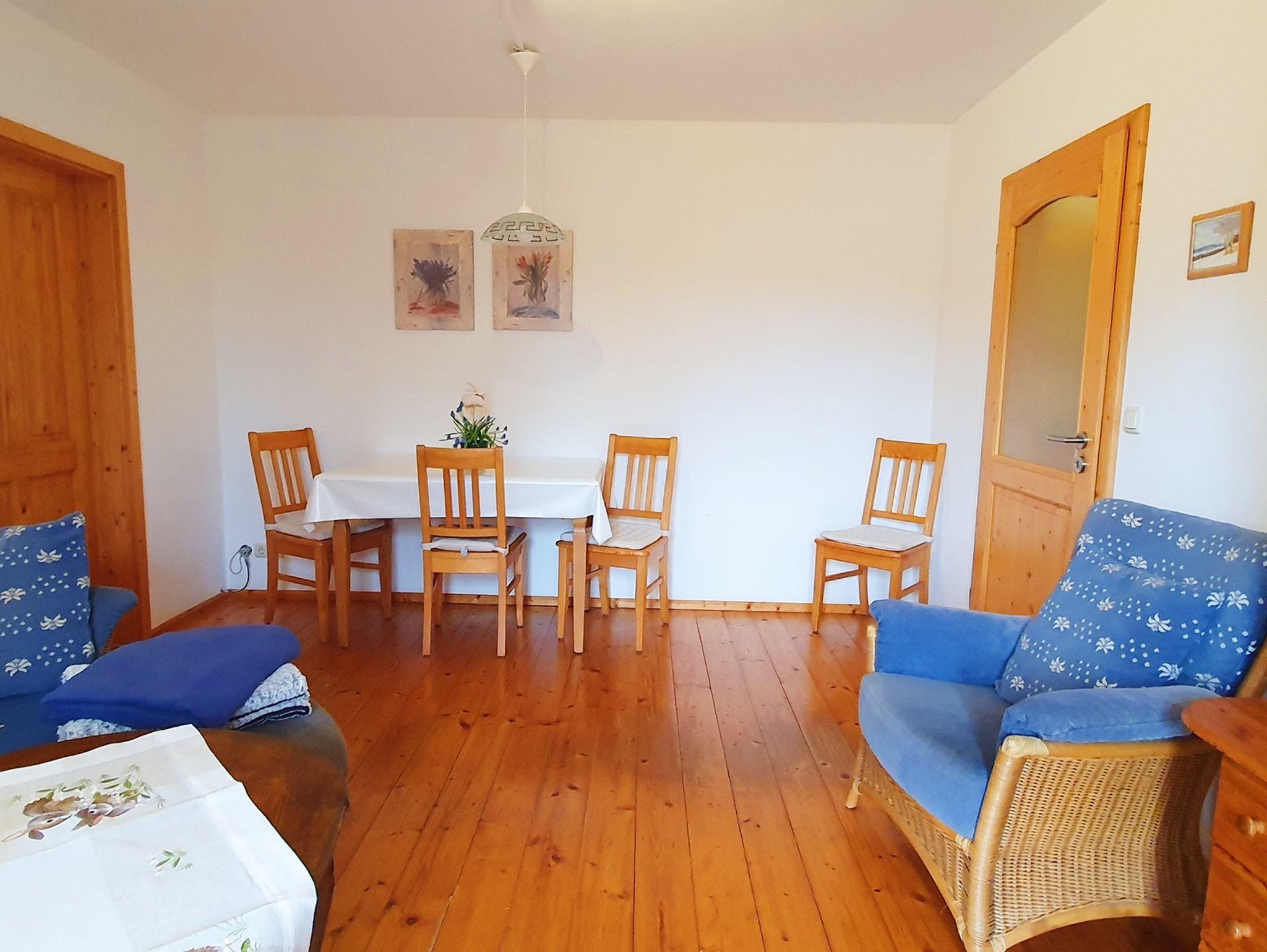 Gemütliche Wohnung im 1 Stock, 2 Schlafzimmer eines mit Doppelbett und eins mit Etagenbett, Sat-TV, Bad/Dusche, WC , Heizung, Balkon, Holz- und Fliesenböden, Nichtraucher, familienfreundlich, Naturlandbiobetrieb. Die Küche ist vollausgestattet mit Spülmaschine und Kühl-/Gefrierkombination. Für das zweite Zimmer mit Etagenbett ist eine eigene