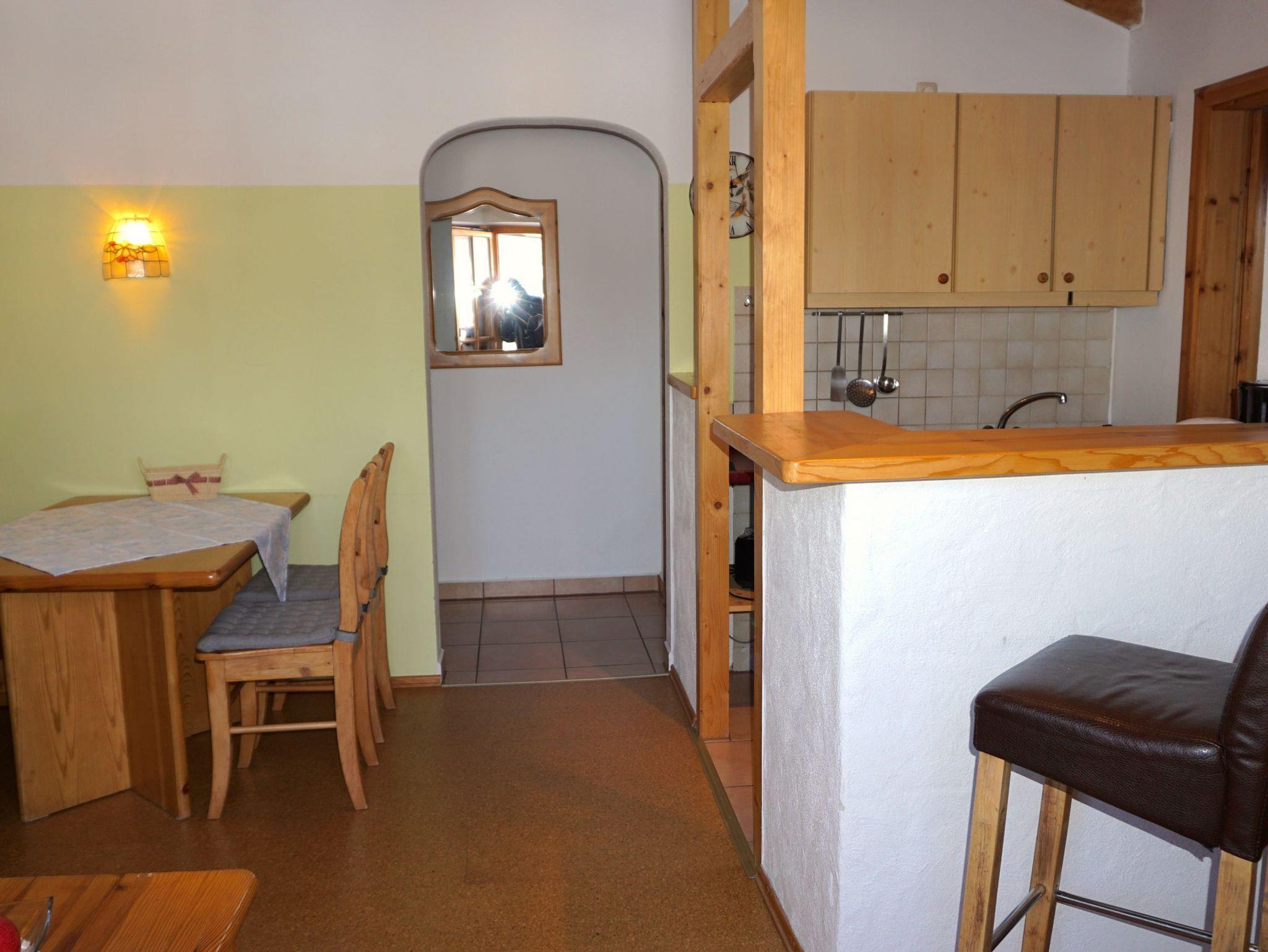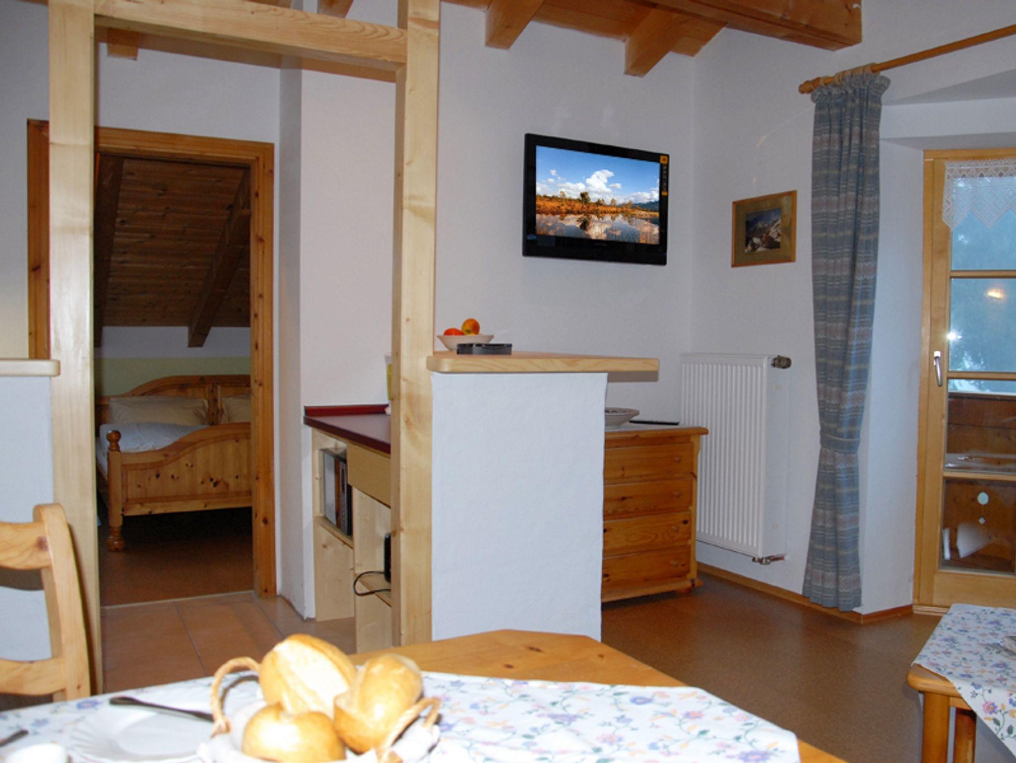 Die helle, mit Fichtenmöbel eingerichtete Ferienwohnung liegt im Obergeschoss und hat einen Balkon. Der Wohn-Schlafraum ist mit einer ausziehbaren Couch, TV mit Flachbildschirm 32 Zoll und Essgruppe, ausgestattet. In der Küche befindet sich eine Mikrowelle sowie auch auf der Küchenzeile ein 2-Plattenherd. Das Schlafzimmer ist mit einem Doppelbett ausgestattet. Das Badezimmer ist mit Dusche und WC, Vergrößerungsspiegel und Fön ausgestattet. W-LAN.Haustier gegen Gebühr erlaubt.